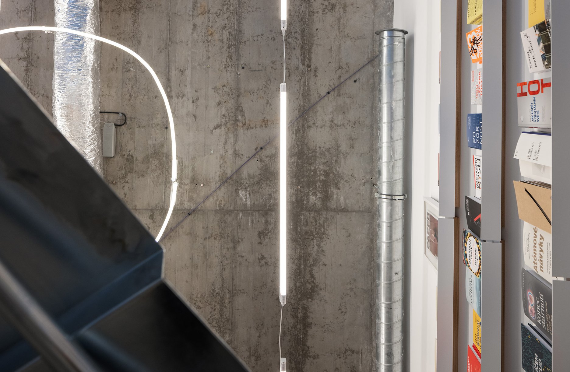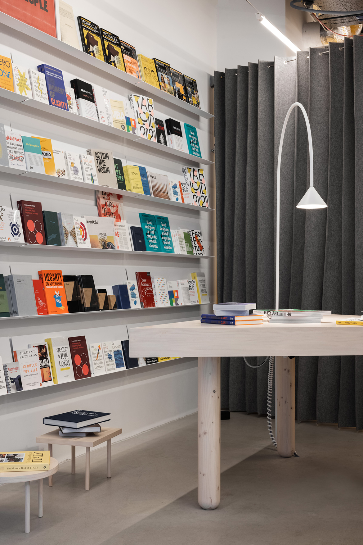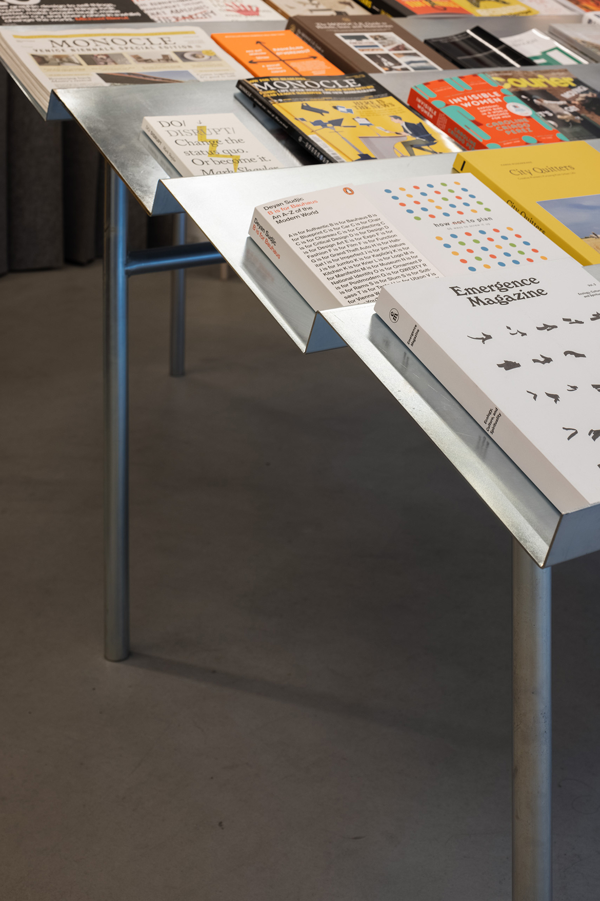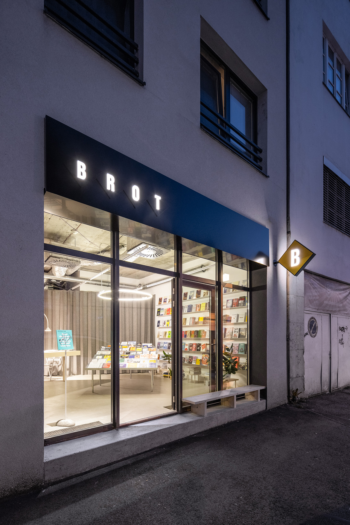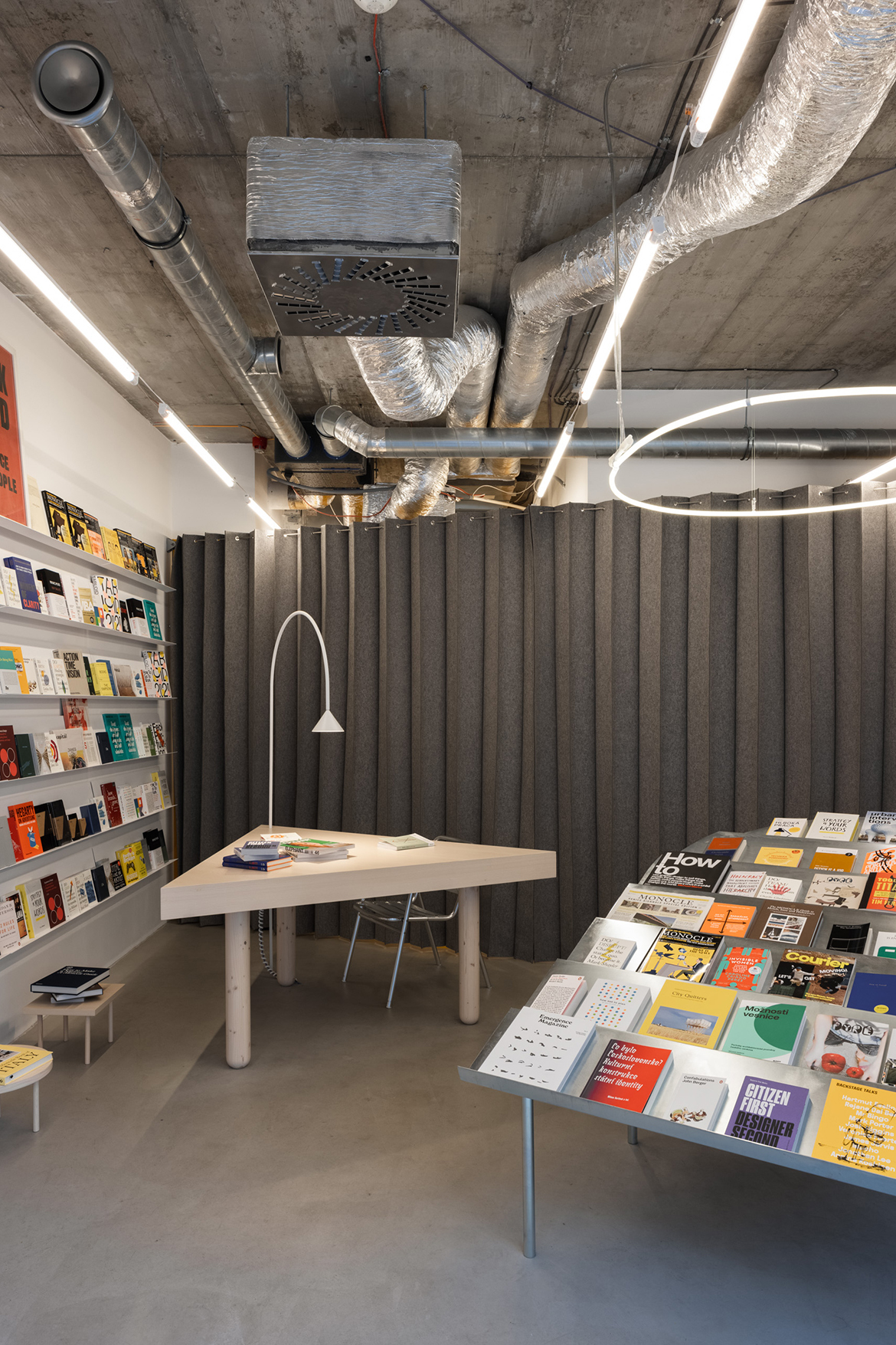 Otvorený výklad z ulice, scénická kulisa pre vystavené produkty. Abstrahované línie v interiéri nechávajú vyniknúť prezentované publikácie. Autori šikovne pracujú s detailom rôznych štruktúr a textúr povrchov.