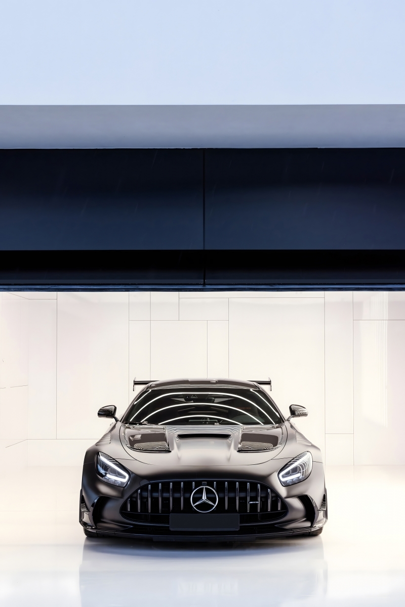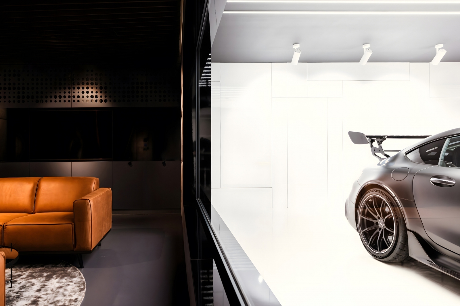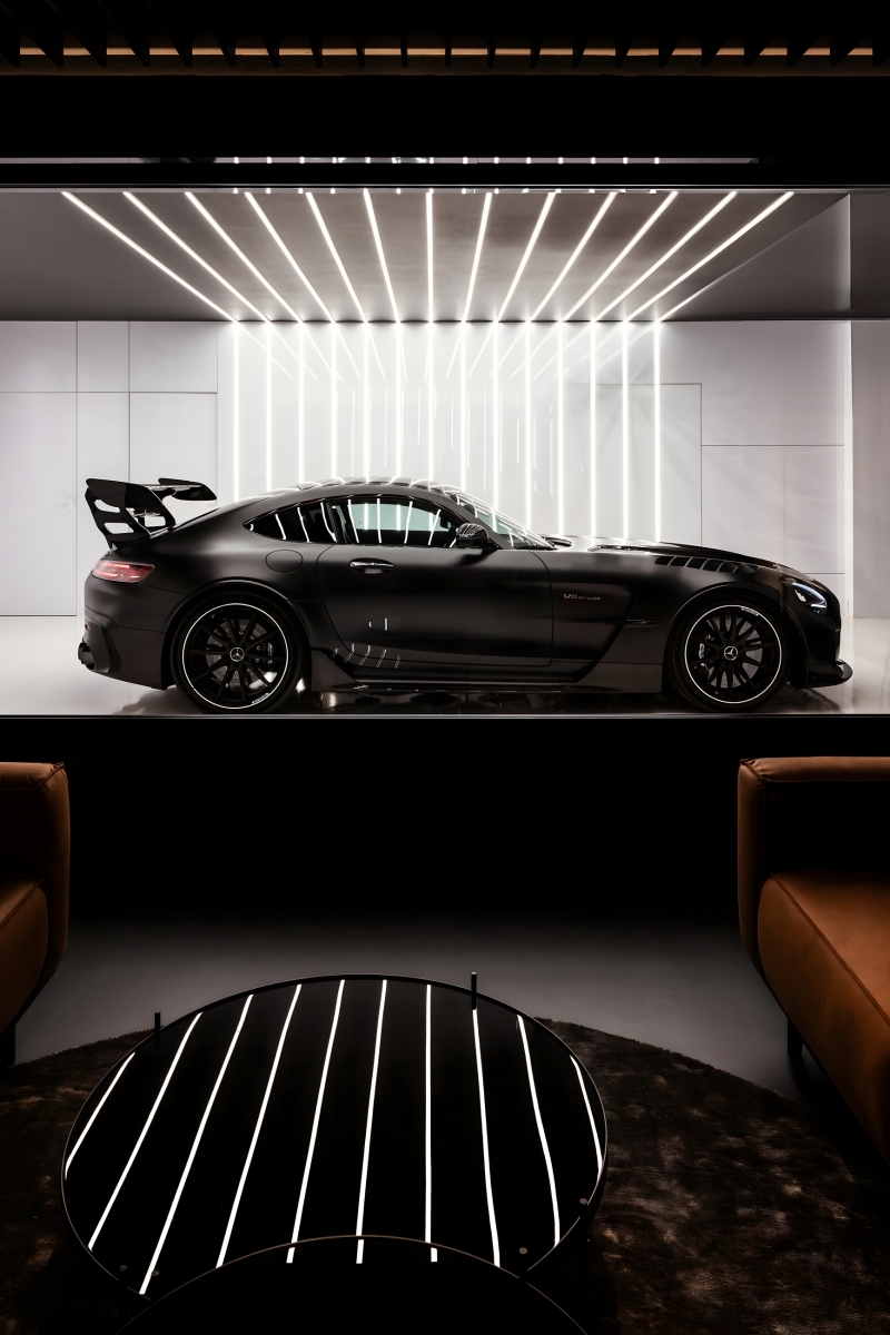 Z lounge sa prechádza do srdca objektu "showroomu" kde sa nachádza limitované auto Mercedes-AMG GT Black Series. Tieto priestory sú rovnako ako exteriér a interiér medzi sebou prepojené panoramatickým oknom. Interiérové dvere sú zo strany lounge plne zapracované do čalúneného obkladu a pre návštevníkov neviditeľné.