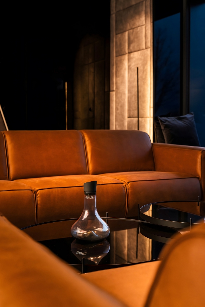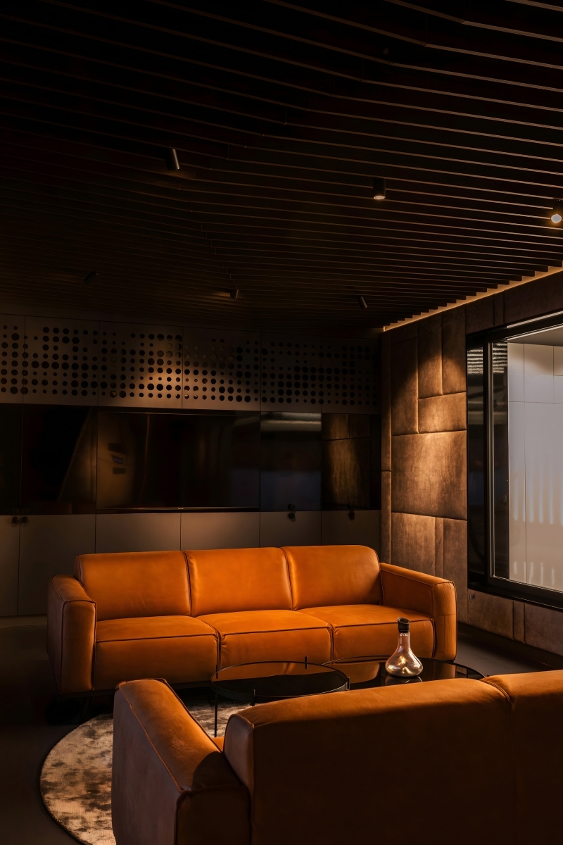 Materialový koncept je postavený na protikladoch. Kontrast tmavých materiálov s dôrazom na haptické a akustické vlastnosti vytvárajú útulnú atmosféru v časti lounge.