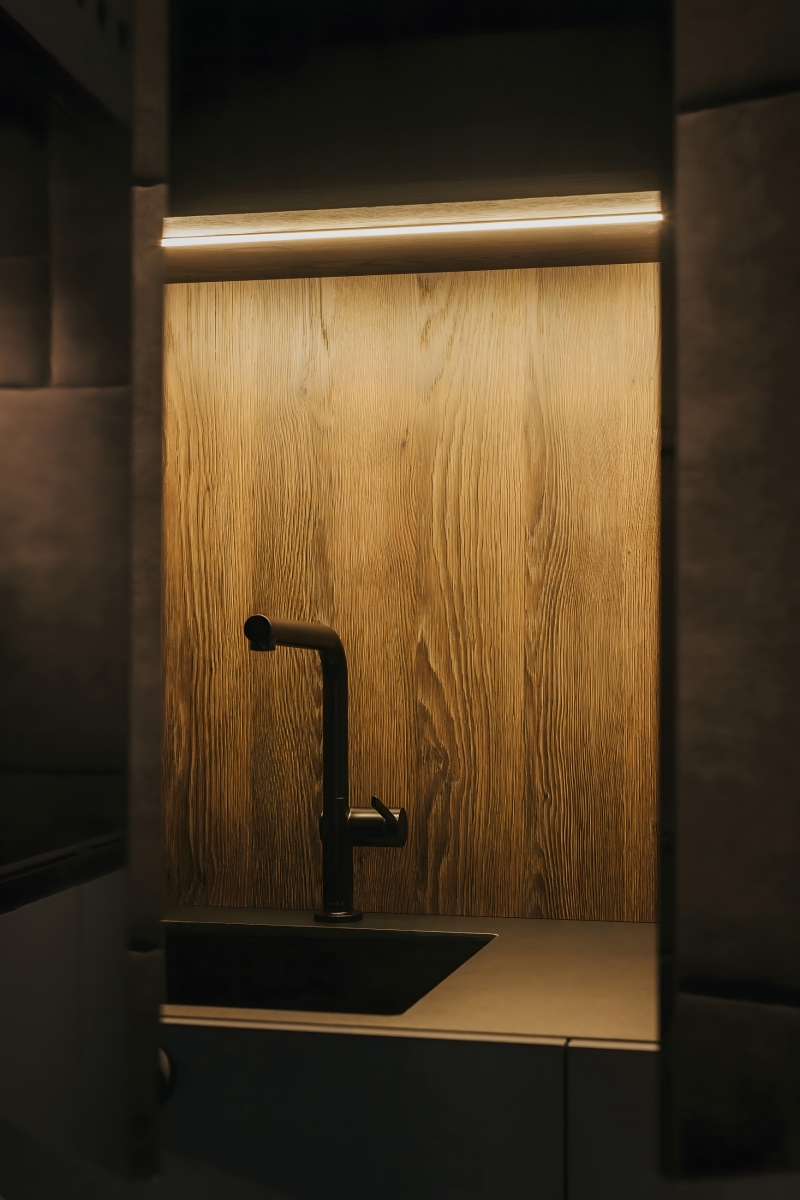 V zadnej časti dispozície sa nachádza zázemie a WC prístupné cez bezrámové dvere ktoré sú rovnako súčasťou systému obkladov.