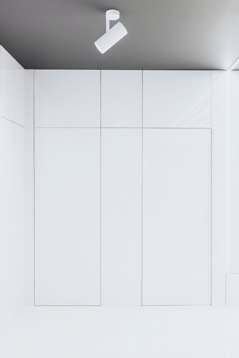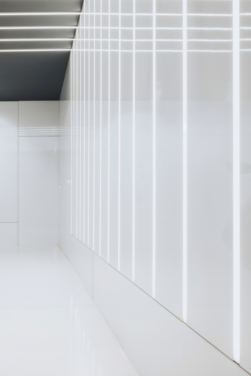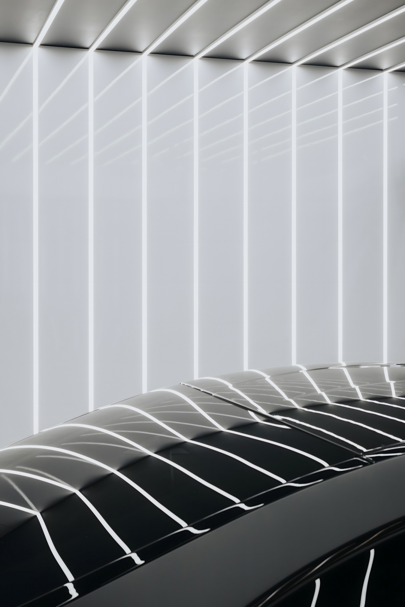 Protiklad tvorí showroom, kontrastné biele materiály od liatej podlahy, až po obklady stien s vysokým leskom. Farebne zjednotený a otvorený priestor upriamuje pozornosť návštevníka na vystavené auto a ponecháva mu voľnosť pri jeho vnímaní. Výsledkom je priestor so zapamätateľným vizuálom.