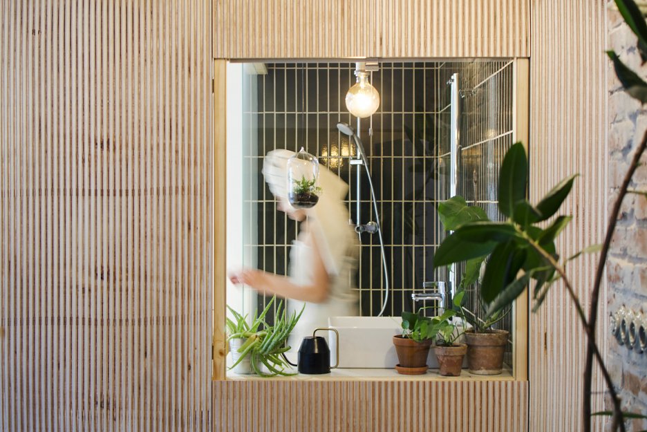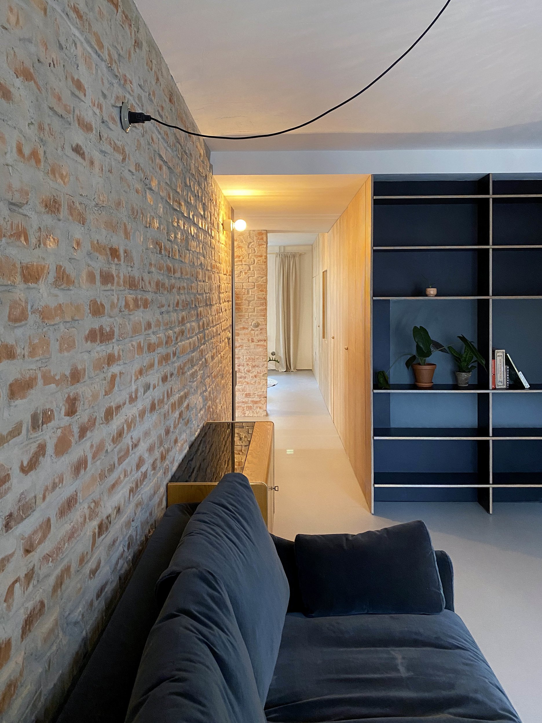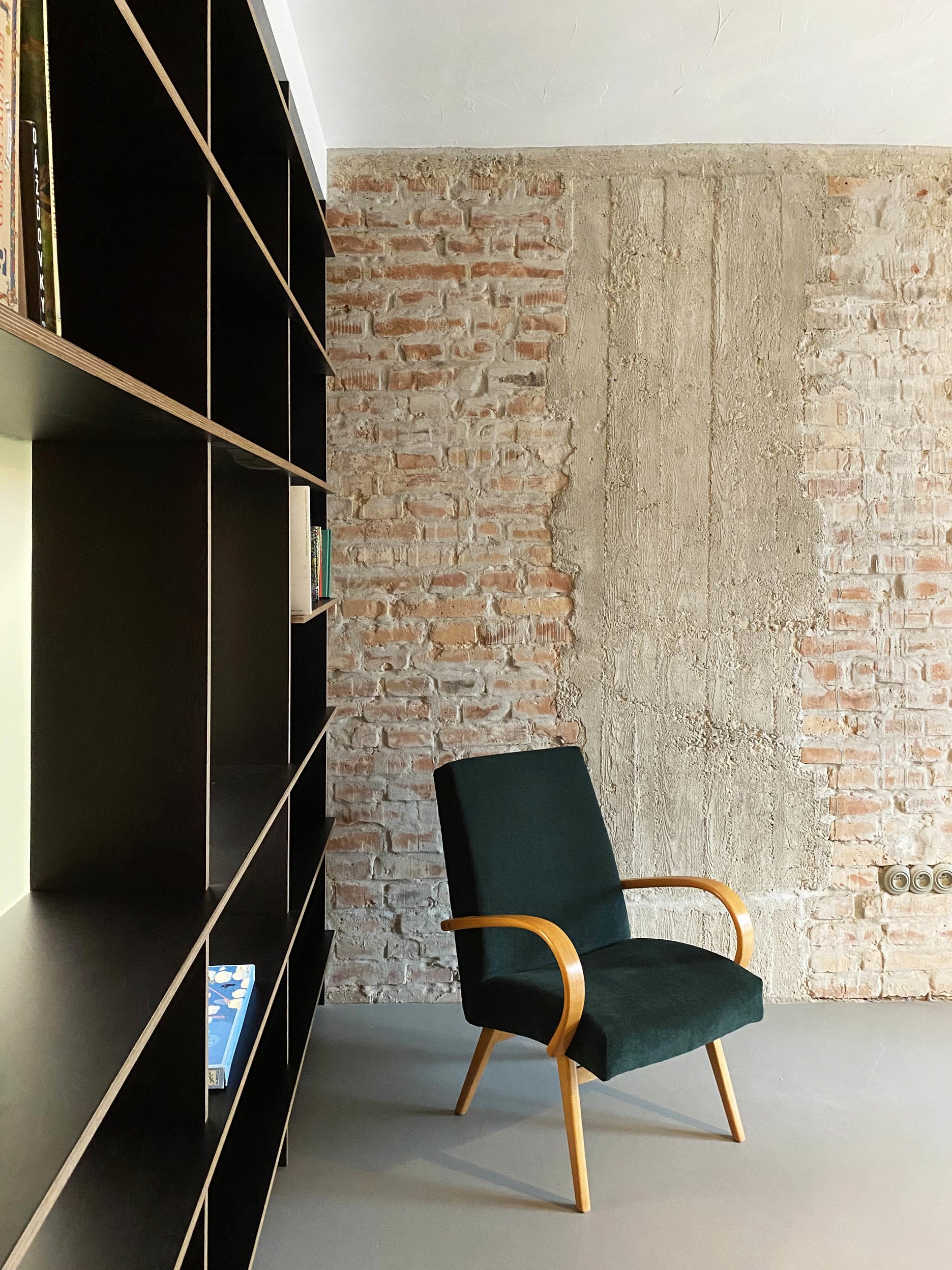 Architekti z bratislavského ateliéru TOITO architekti sa sústredili na najpodstatnejšie prvky návrhu. Znova definovali prevádzku a dispozíciu bytu. Preplávajúca denná zóna bytu, presvetlila celú hĺbku dispozície - najmä pôvodne uzavretú vstupnú časť. Špecifikom riešenia sú "interiérové okná", ktoré umožňujú podľa potreby prepojiť jednotlivé miestnosti. Nosnou témou rekonštrukcie sú stavebné úpravy, odhalenie materiality pôvodných konštrukcií a realizácia nových na mieru navrhnutých stolárskych prvkov. Podobne ako v mnohých predchádzajúcich realizáciách ateliéru (viď. súvisiace články na konci textu).