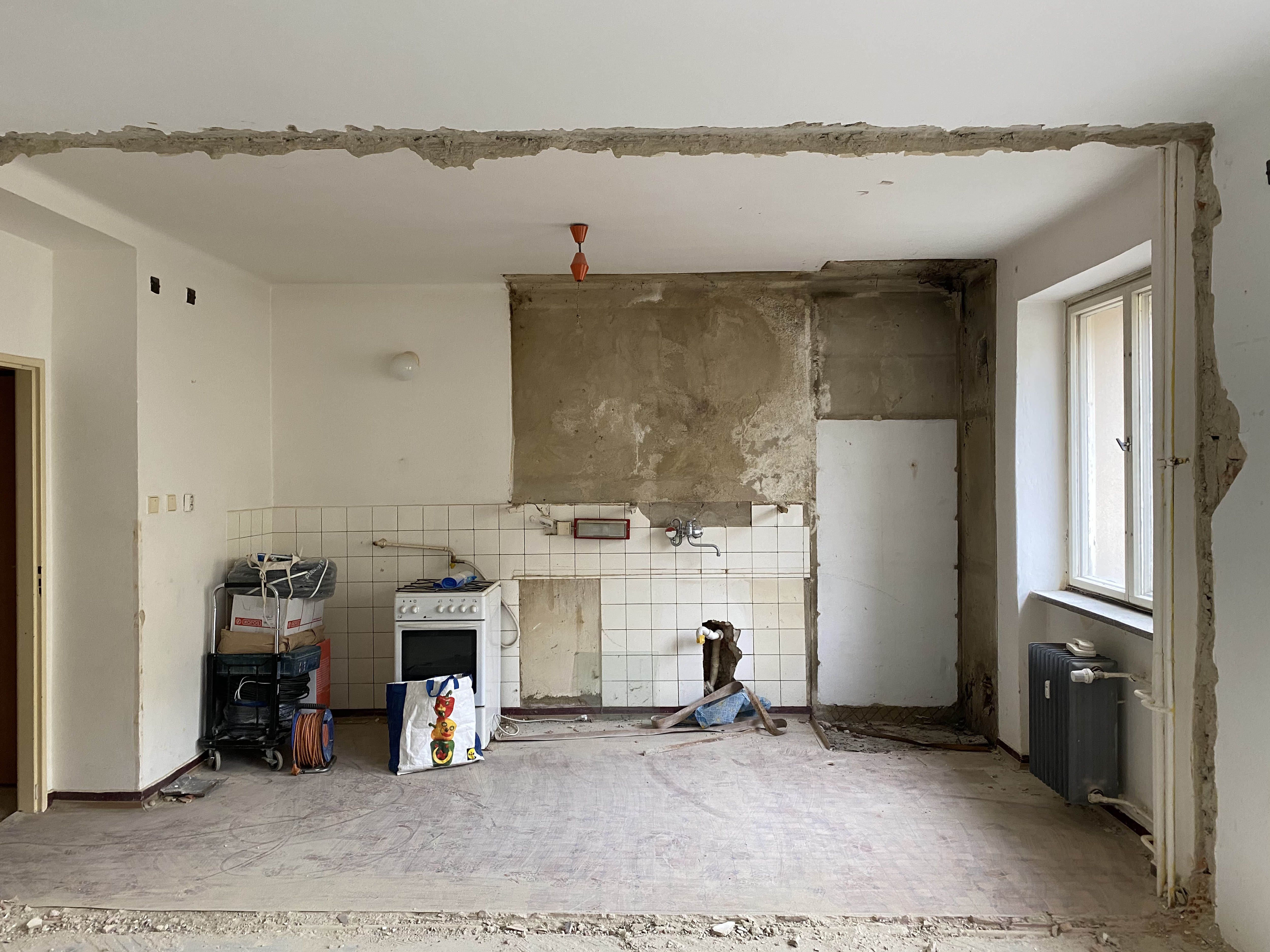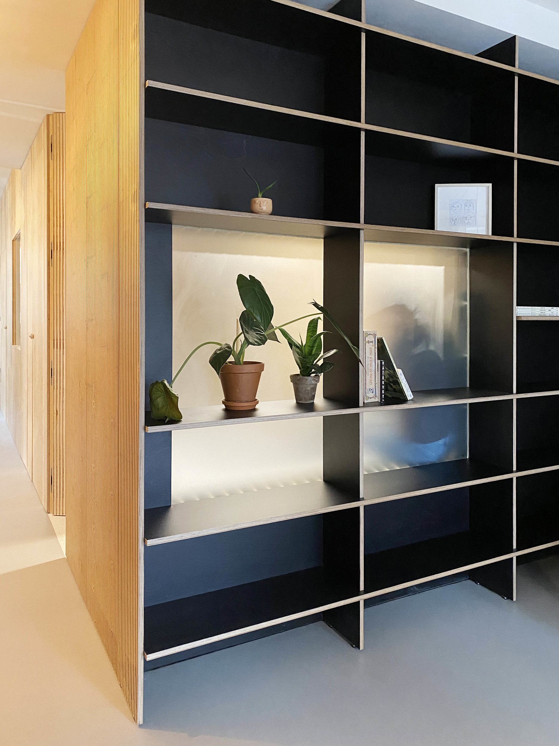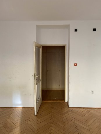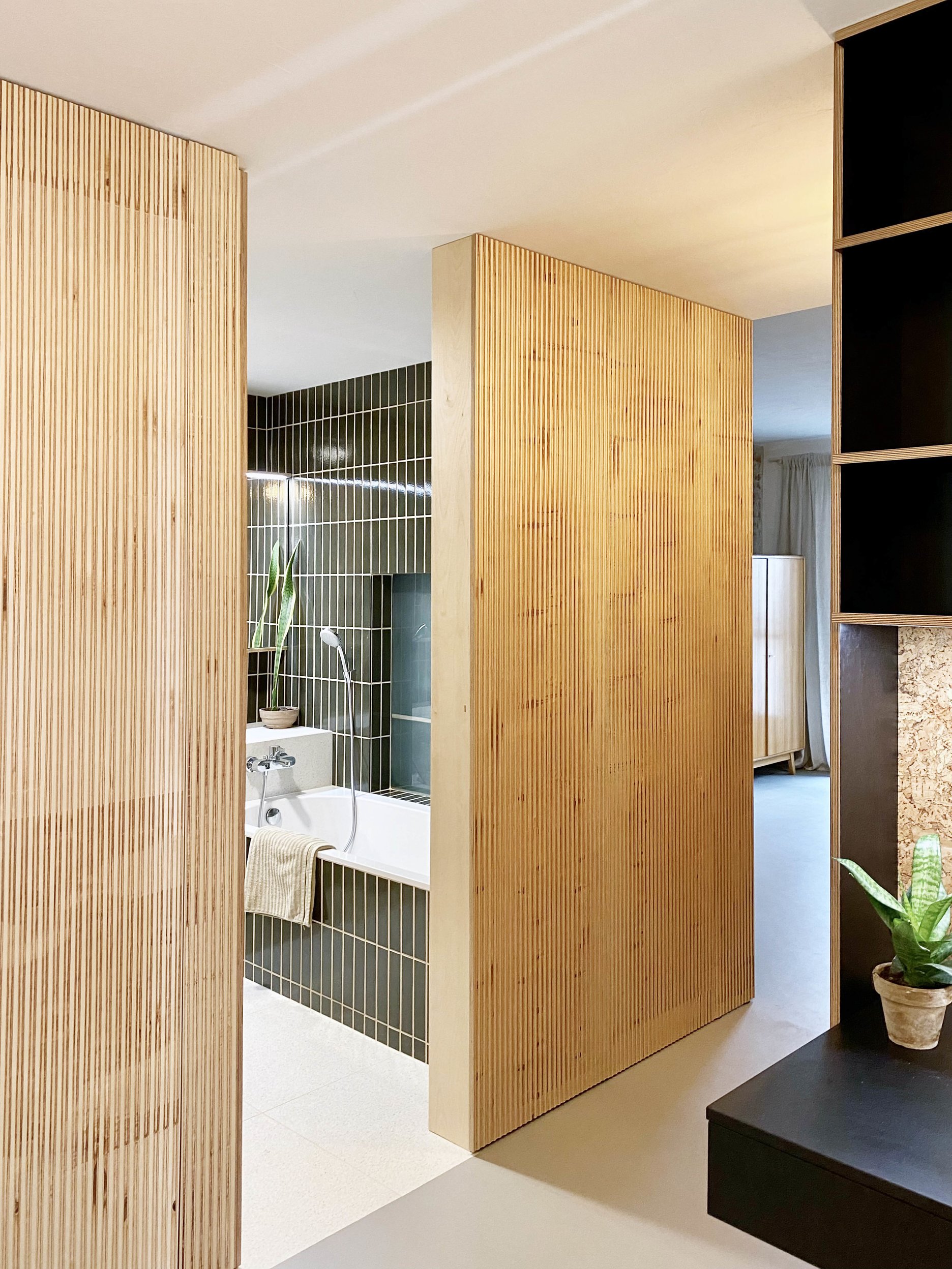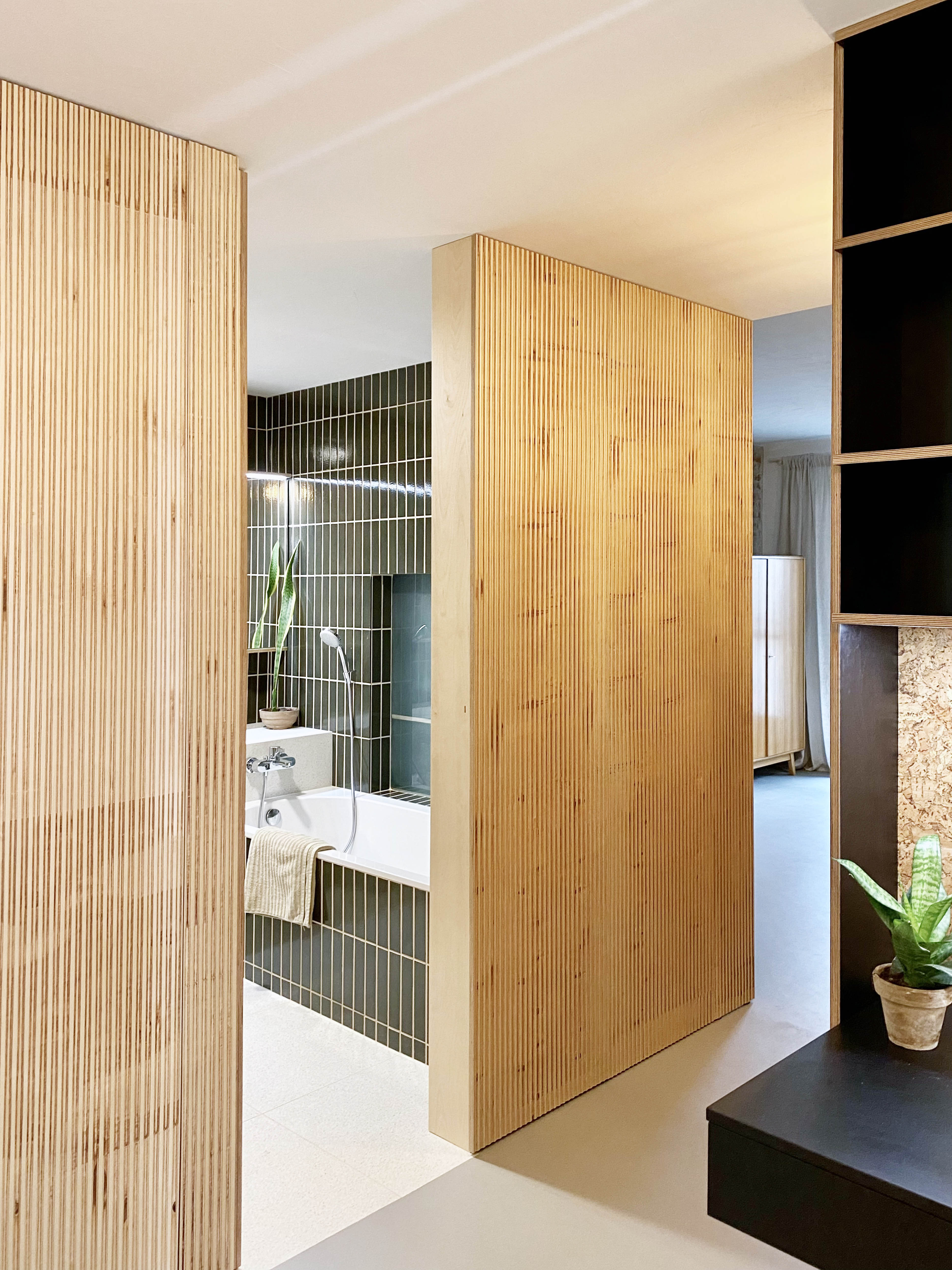 Nová dispozícia otáča kostru o 90°. Členitá denná časť je spojitý preplávajúci priestor. Kuchyňa s jedálňou do ulice, pracovňa v strede, obývacia izba do dvora. Na tento rozmanitý celok nadväzujú dve izby a hygiena. Každá z nich si vymieňa svetlo/výhľad so susedom. Tri interiérové okná otvárajú dispozíciu ešte viac, násobia kontakt, pridávajú svetlo. Rozdiel medzi funkčnými celkami bytu sa zmenšuje. Spálňa sa stáva pohodlným rozšírením jedálne, vstupná hala je pracovňa a spojovacia chodba, hosťovská / detská izba je druhou pracovňou.