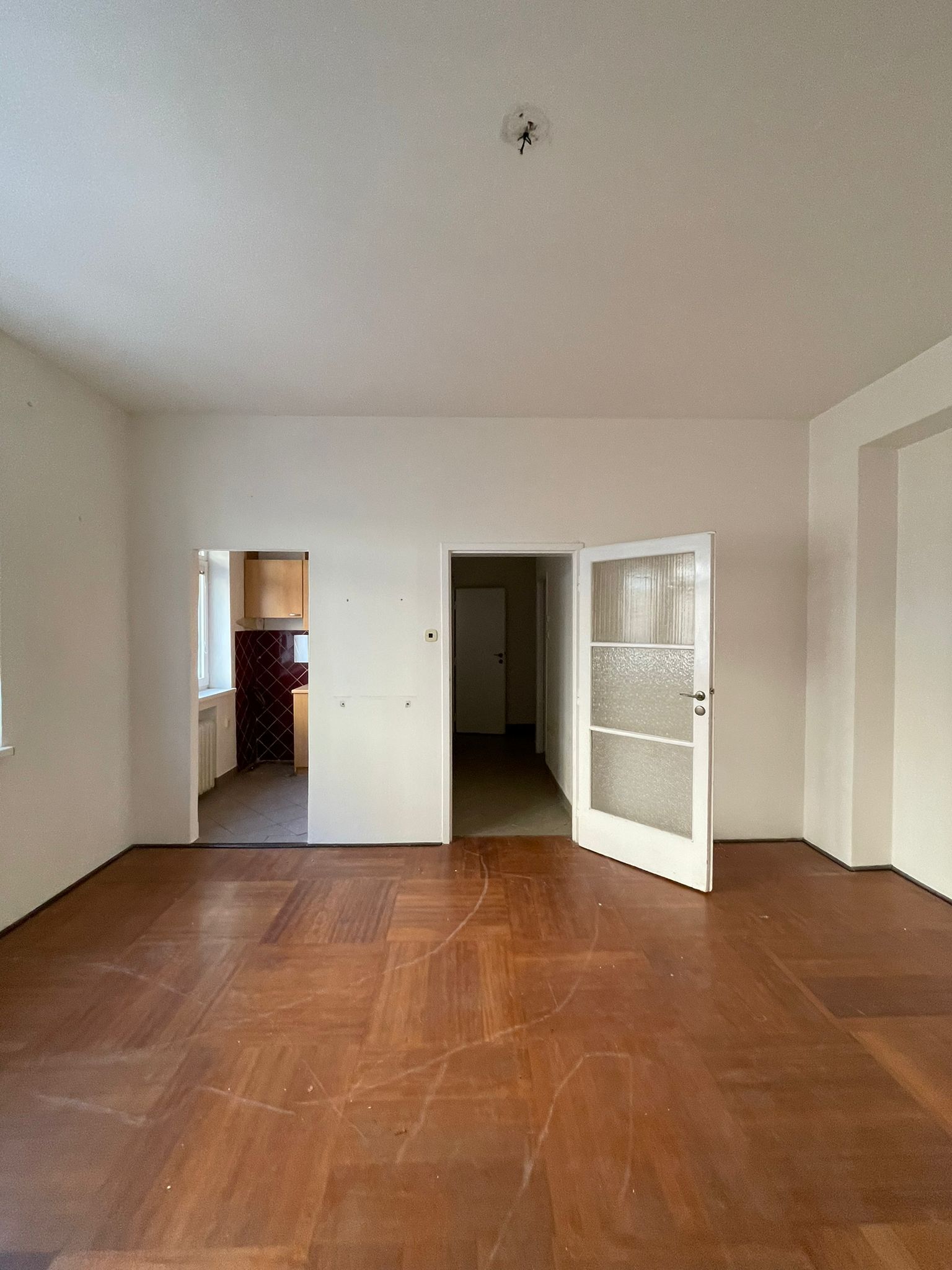 Povedali sme si, že je dôležité svetlo. Nový, denný priestor malého bytu, ktorý bude mať dve krásne a veľké okná. V pôvodnej dispozícii prislúchalo každé okno jednej miestnosti, čím vznikla tmavá chodba. Navrhujeme svetlý priestor definovaný len fasádou domu a zo zadnej strany transparentnou sklobetónovou stenou. Za ňou sa nachádza všetko potrebné, aby sa v byte dalo komfortne fungovať - kúpeľna so sprchou, práčka, umývadlo, skrine a úložné priestory.