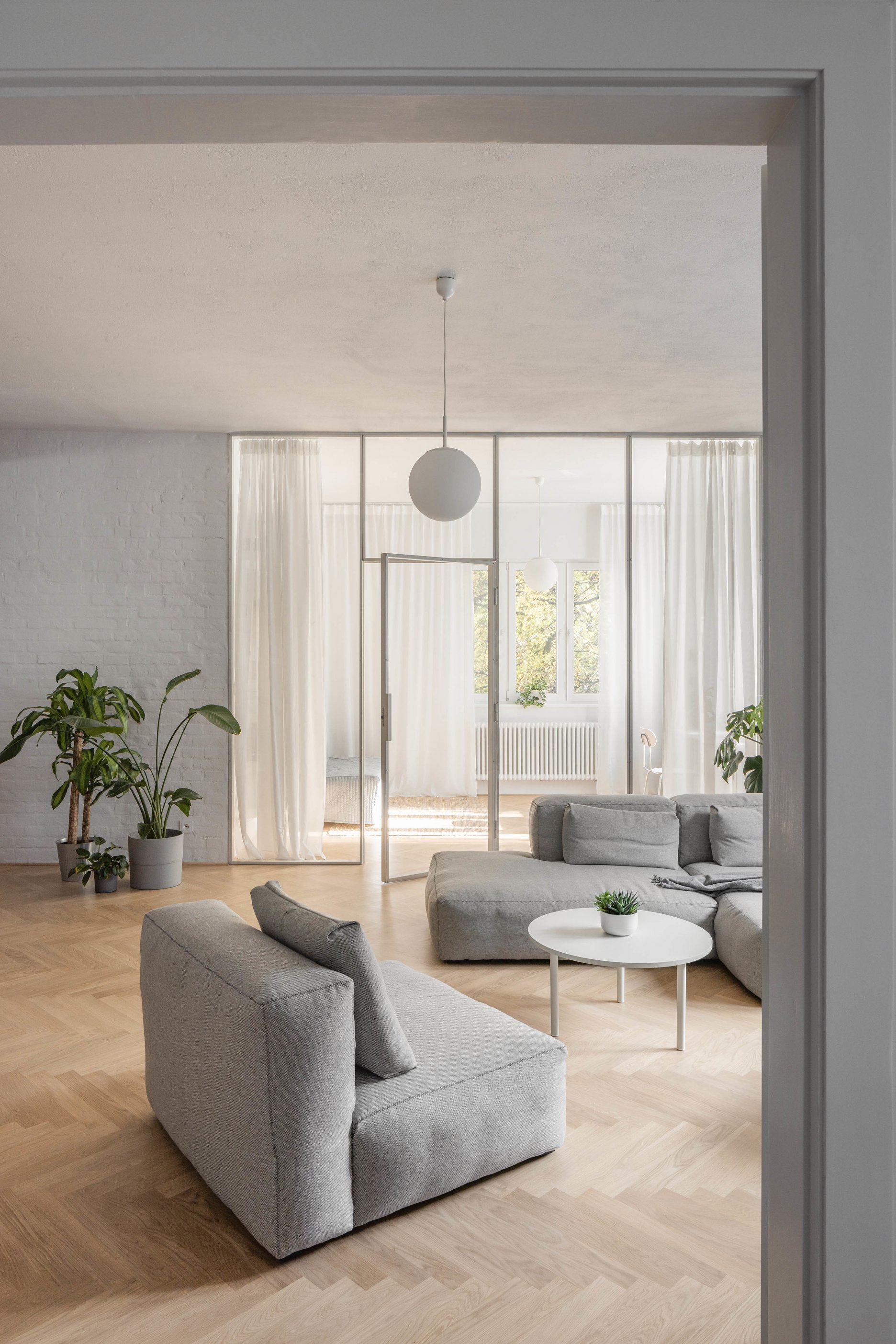 Koncept otvoreného preplávajúceho priestoru podčiarkuje masívna dubová podlaha, plynúca celým interiérom, rovnako ako farebne zjednotené steny a stropy, prebiehajúce až do kúpeľne. Stvárnenie interiéru necháva vyniknúť veľkorysý priestor a spojenie s meniacimi sa výhľadmi a atmosférou bytu.