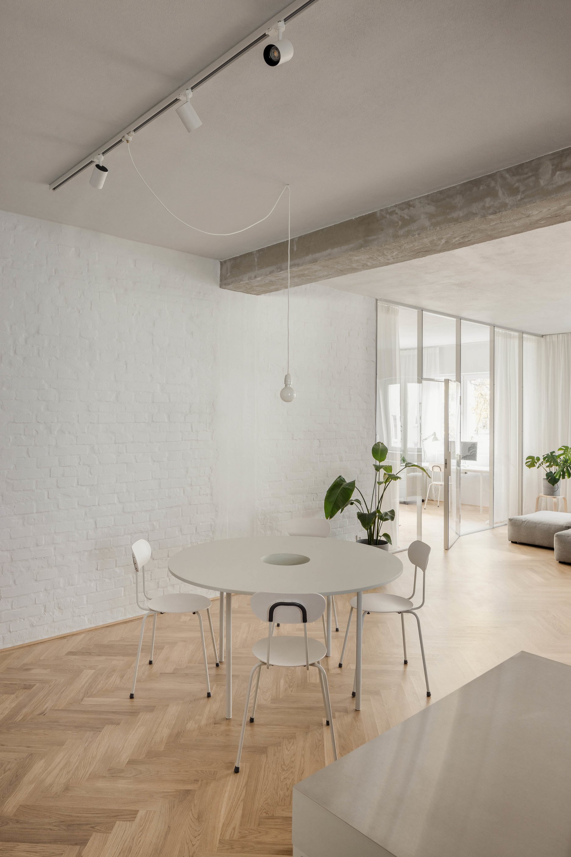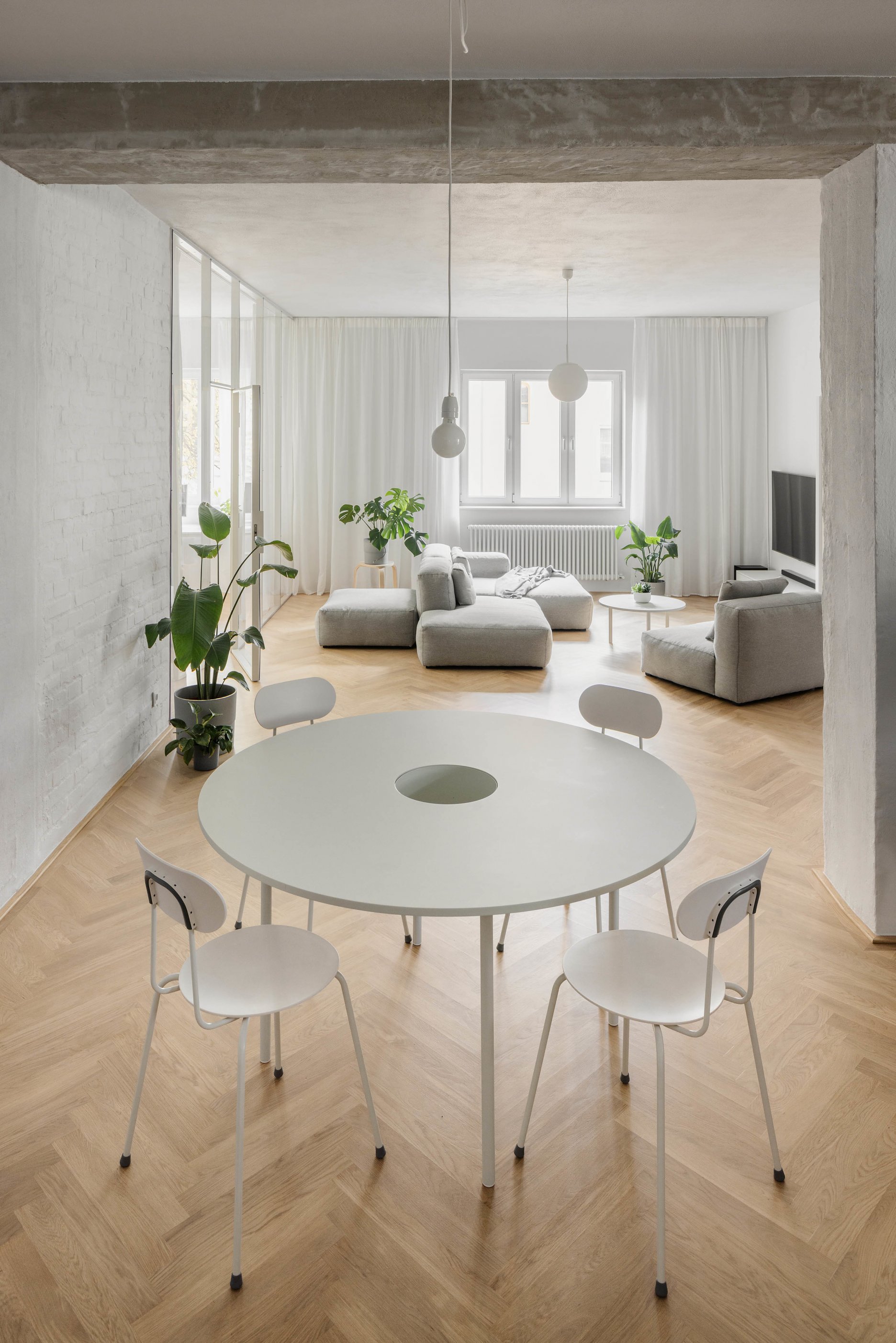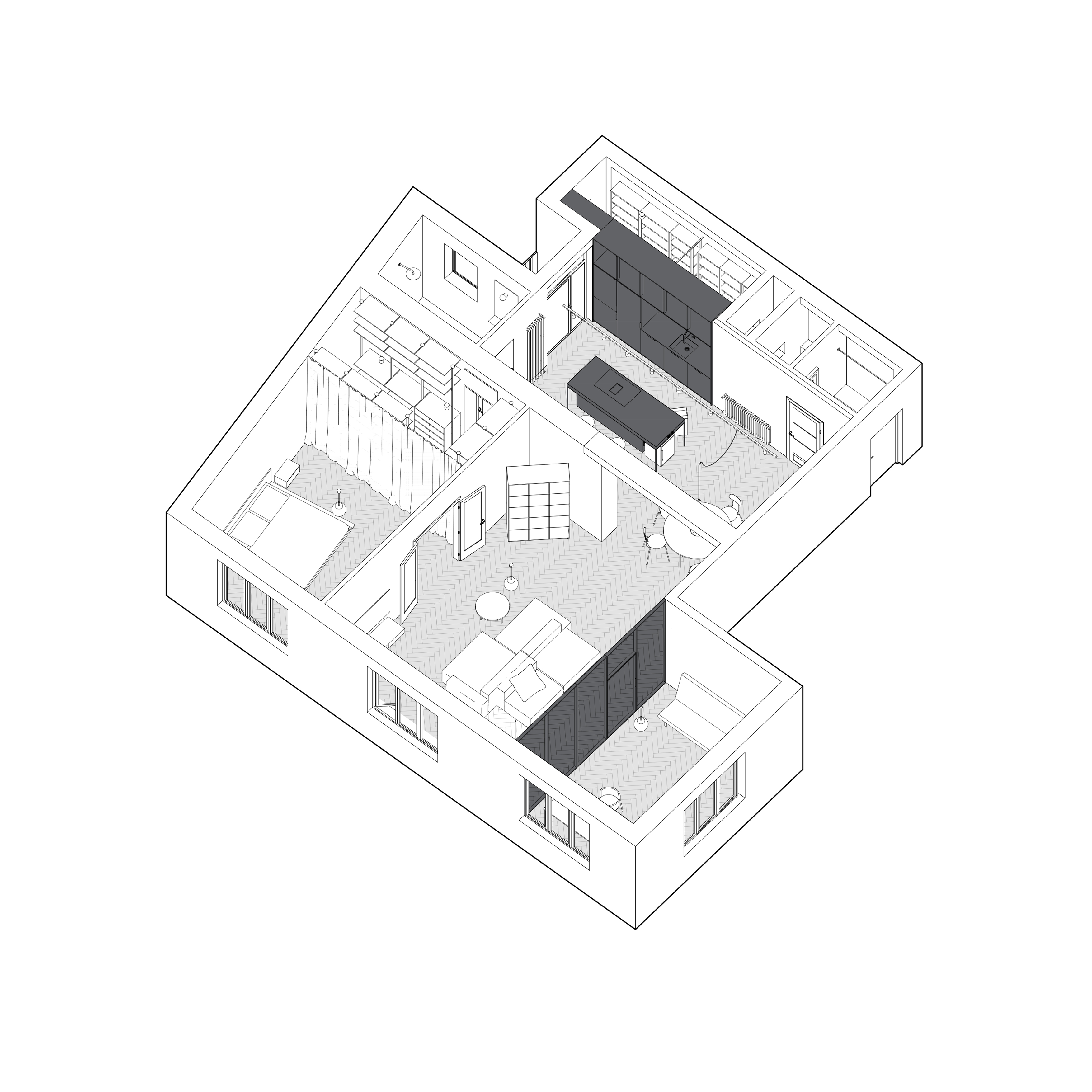 Pôvodný byt na Grösslingovej ulici charakterizovala uzavretá dispozícia a striktné členenie priestoru. “Rozhodli sme sa odstrániť všetky nenosné priečky, ktoré byt definovali a tým vytvoriť preplávajúci priestor. Ako fragment pôvodnej dispozície sme ponechali iba jednu stenu spálne s pôvodnými dverami,” vysvetľujú svoj prístup architekti Peter Kuklica, Martin Smerek, Erik Hornáček a Juraj Hubinský.