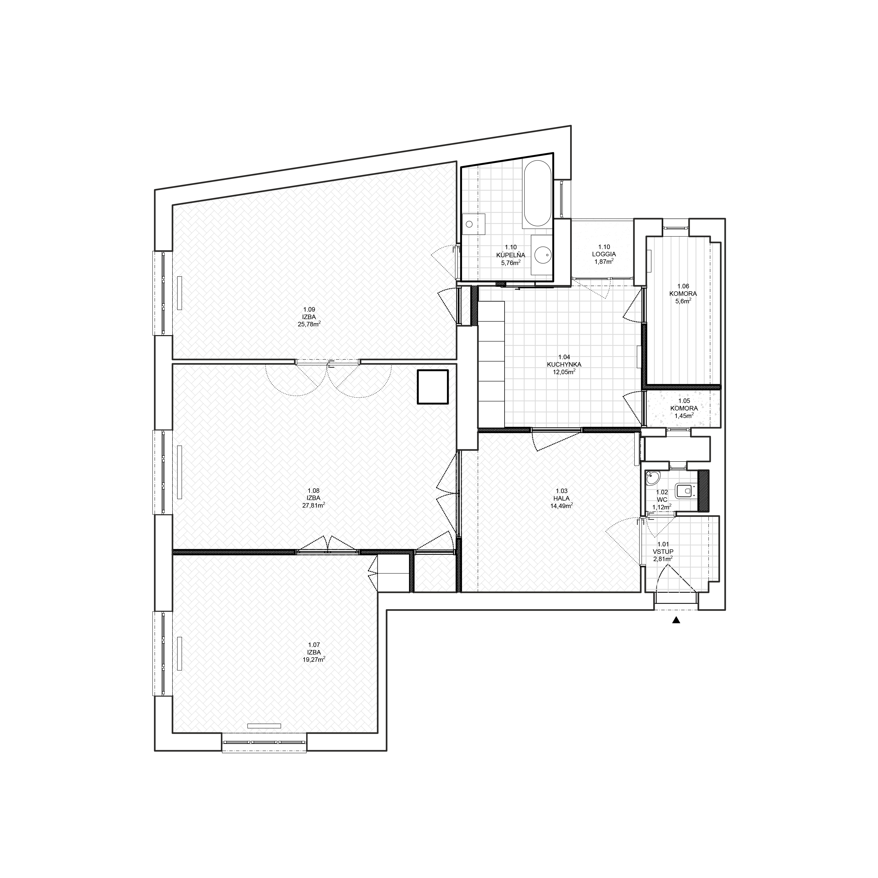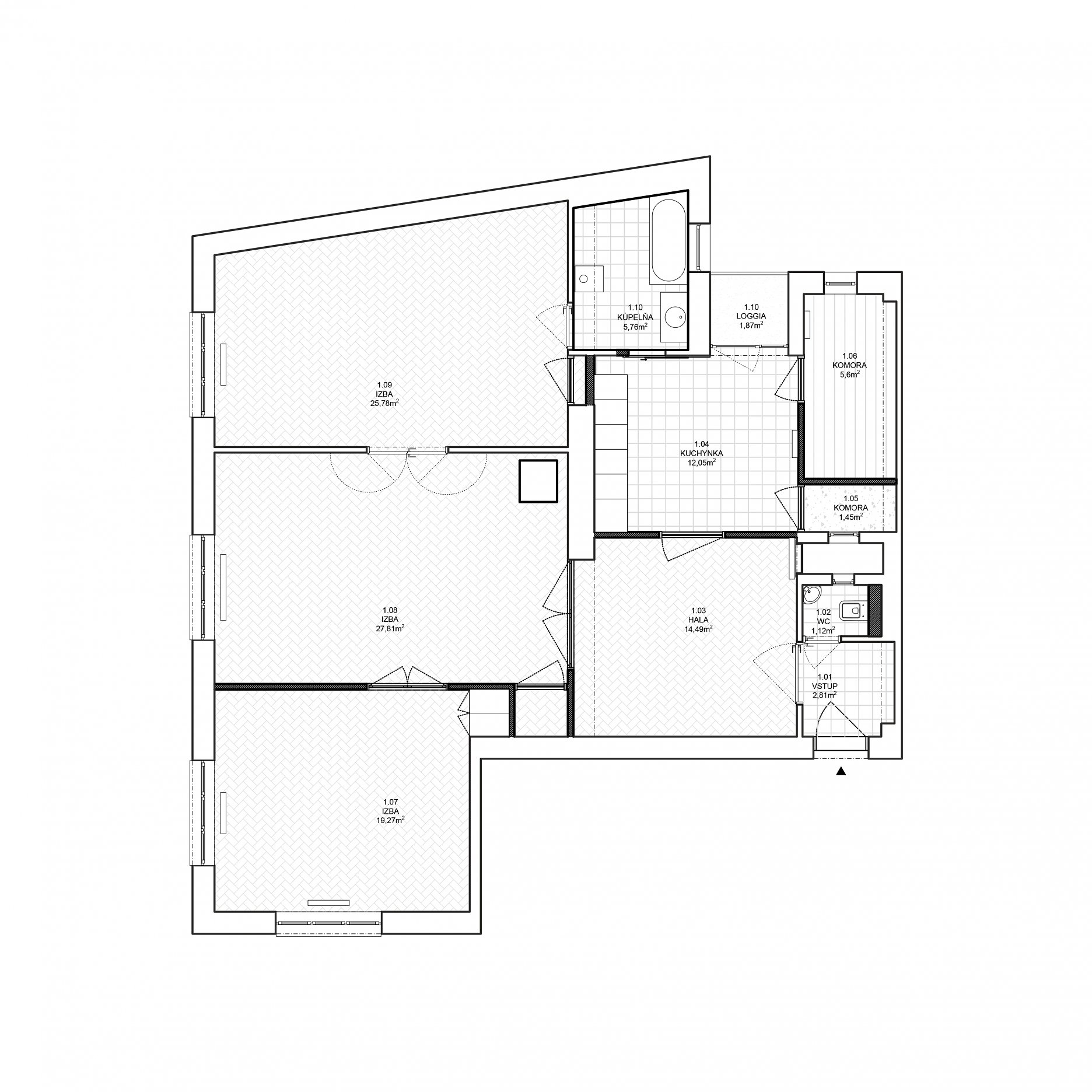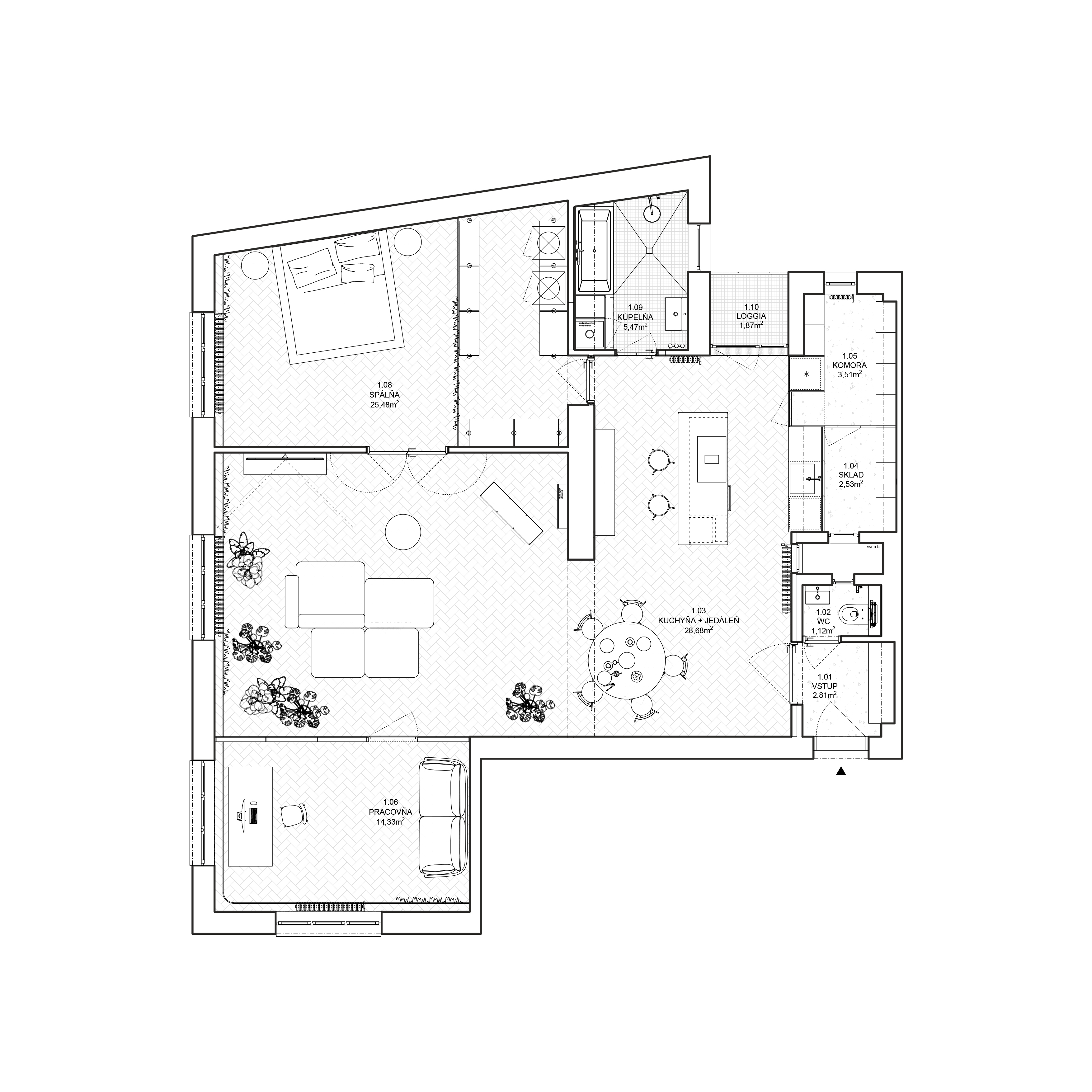 Pôvodný byt na Grösslingovej ulici charakterizovala uzavretá dispozícia a striktné členenie priestoru. “Rozhodli sme sa odstrániť všetky nenosné priečky, ktoré byt definovali a tým vytvoriť preplávajúci priestor. Ako fragment pôvodnej dispozície sme ponechali iba jednu stenu spálne s pôvodnými dverami,” vysvetľujú svoj prístup architekti Peter Kuklica, Martin Smerek, Erik Hornáček a Juraj Hubinský.
