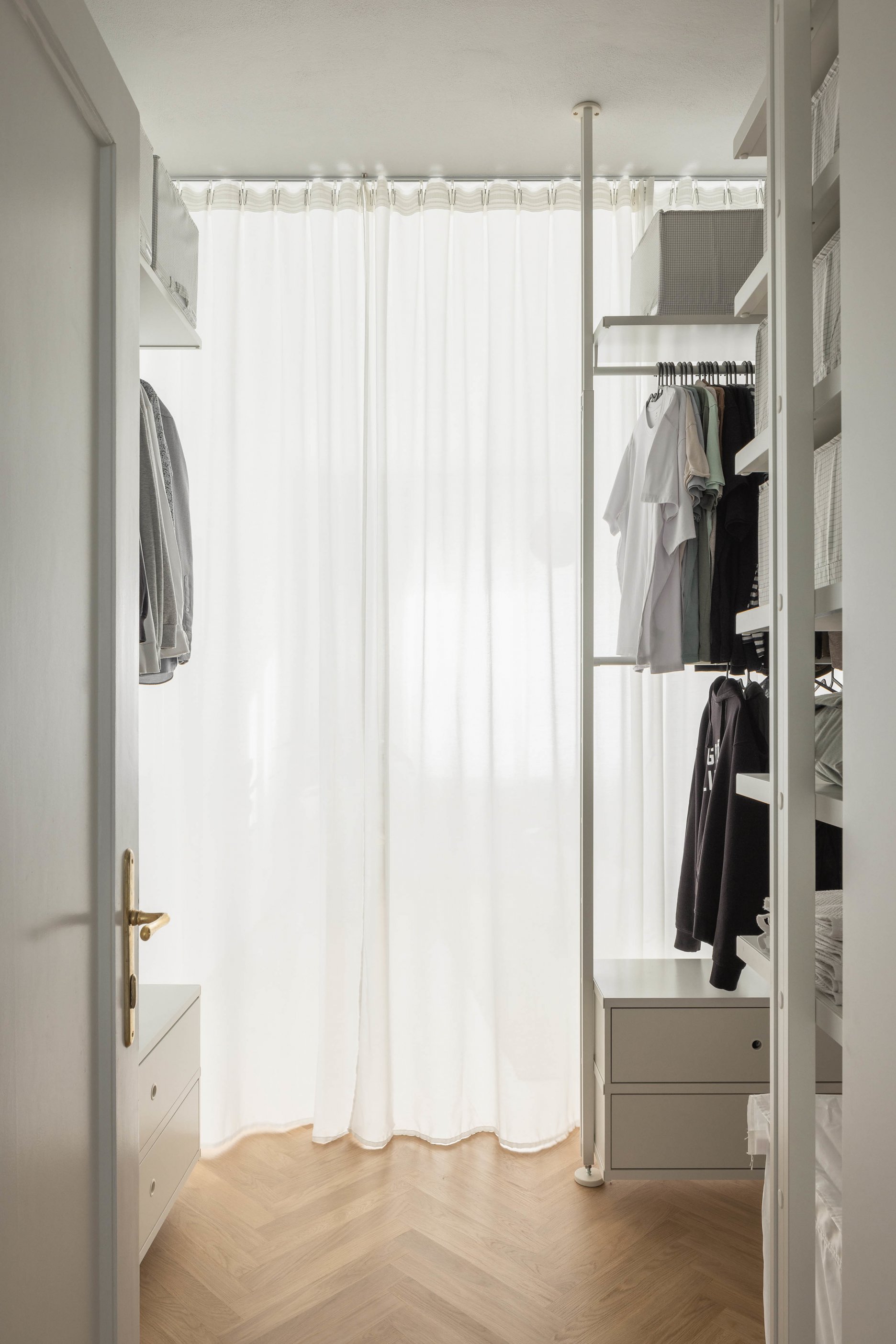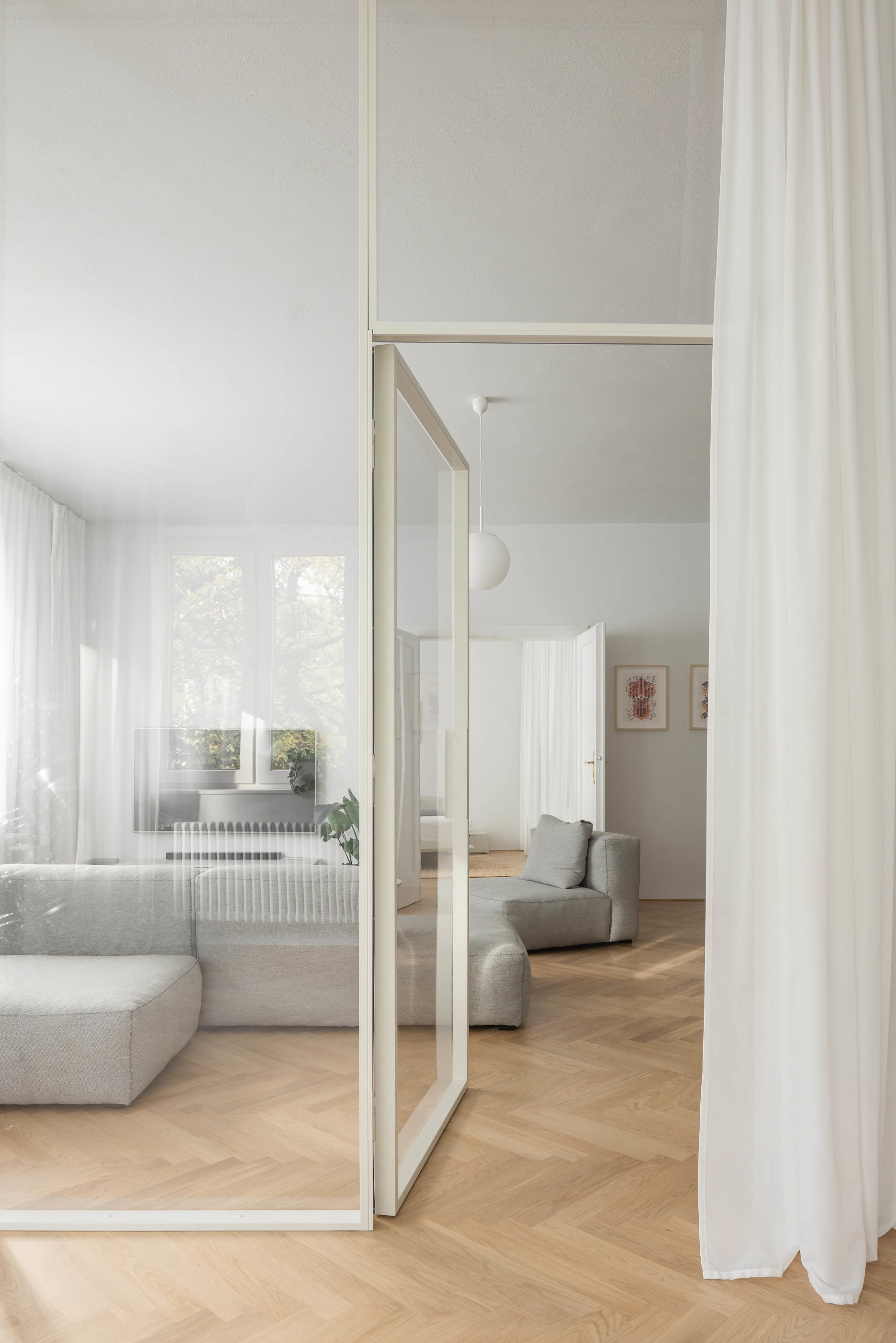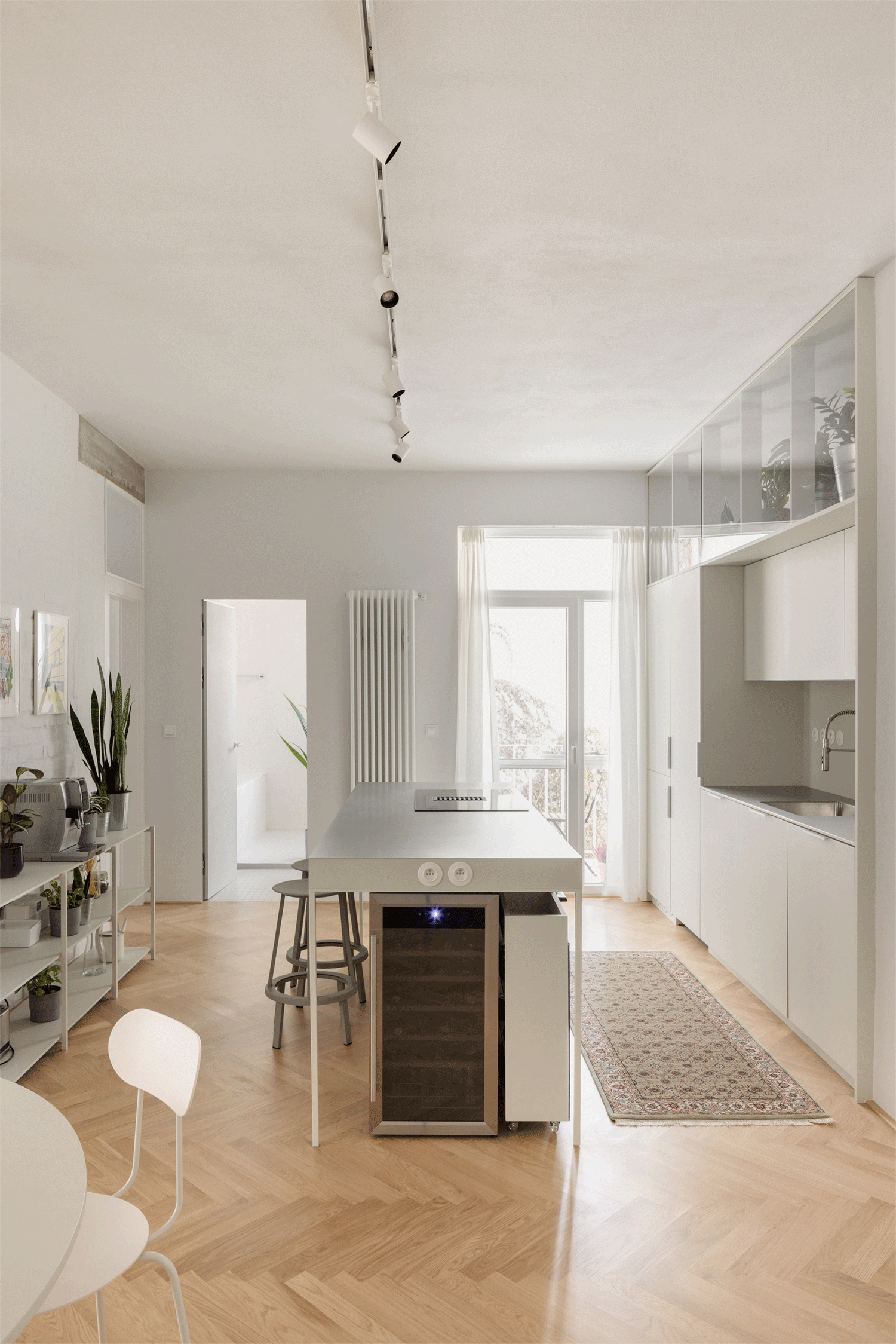 Nové členenie dispozície, či vymedzenie a oddelenie priestorov je riešené bez nových stavebných konštrukcií. Priestory komory, pracovne, alebo šatníka definujú odnímateľné prvky ako zasklená stena, kuchynská linka či záves. “Práve koncept nevytvárania nových stavebných prvkov v interiéri vnímame ako potrebný pri momentálnej tendencií fluktuácie ľudí a potreby zmien v čase. Týmto spôsobom môžeme byt prispôsobiť novým požiadavkám a jednotlivé prvky nahradiť bez vytvárania množstva stavebného odpadu,” dopĺňajú architekti. Medzi prvky variabilného riešenia interiéru patrí aj knižnica na kolieskach, ktorá môže v prípade potreby slúžiť ako deliaci prvok medzi jedálňou a obývačkou.