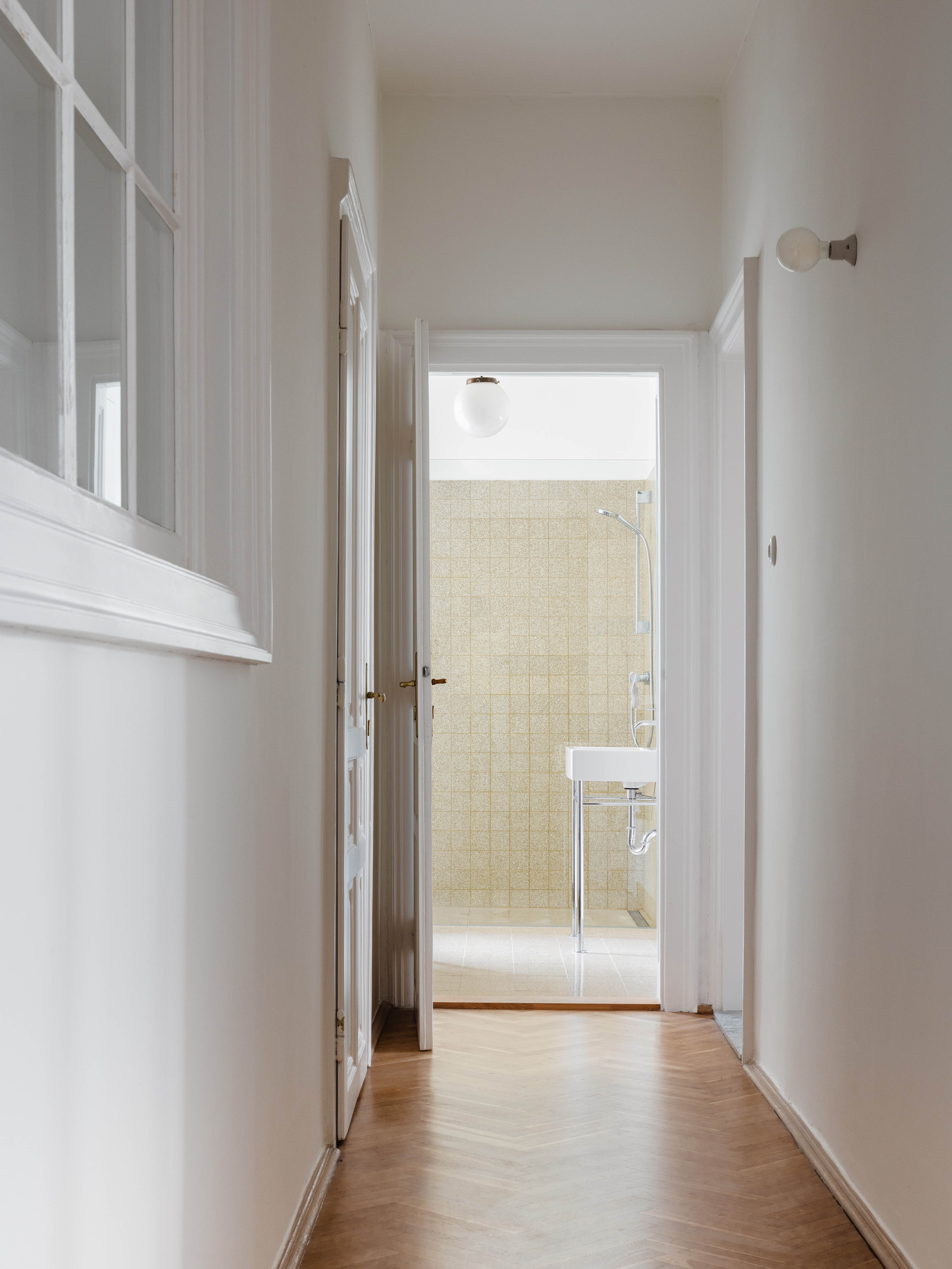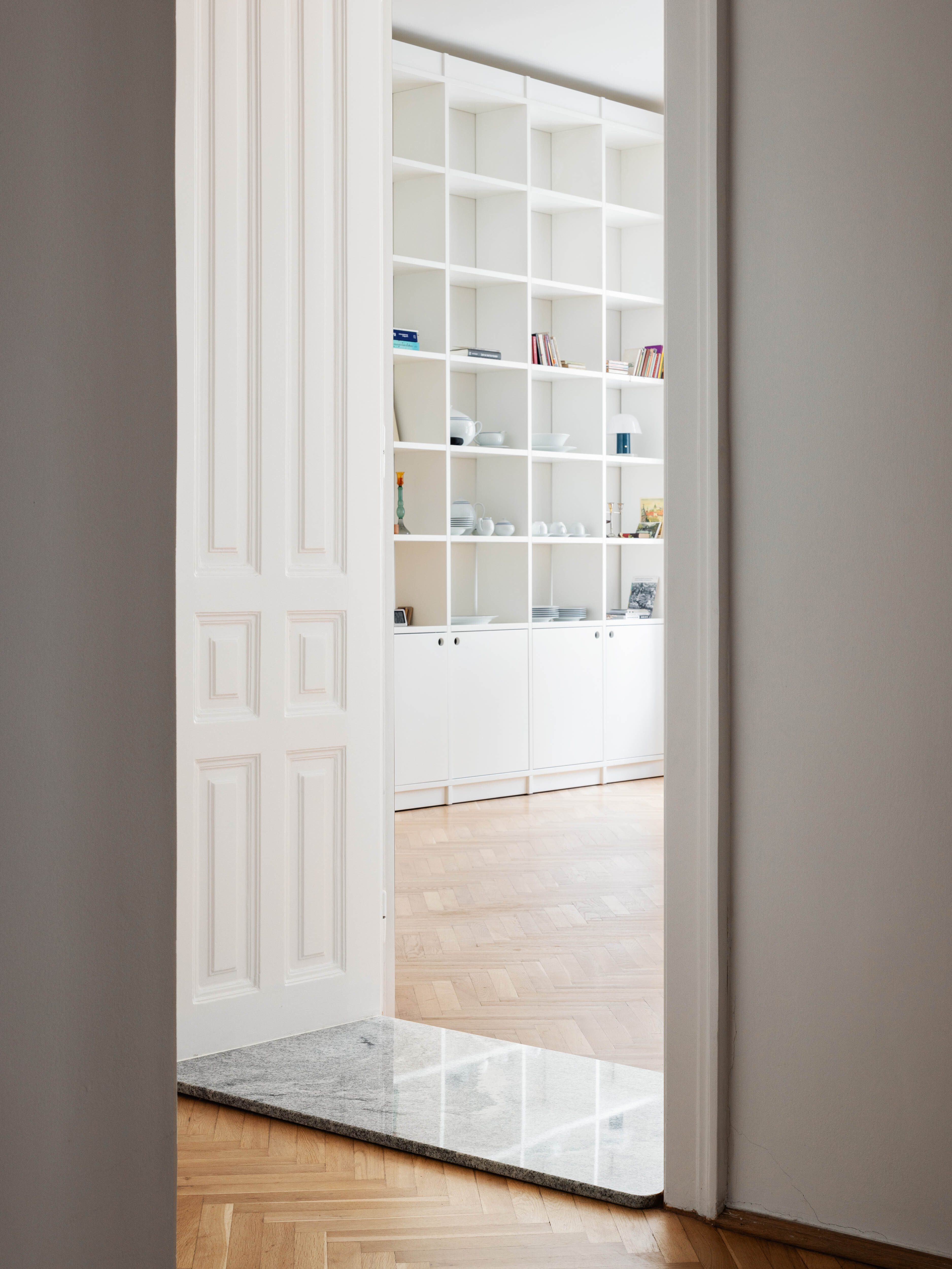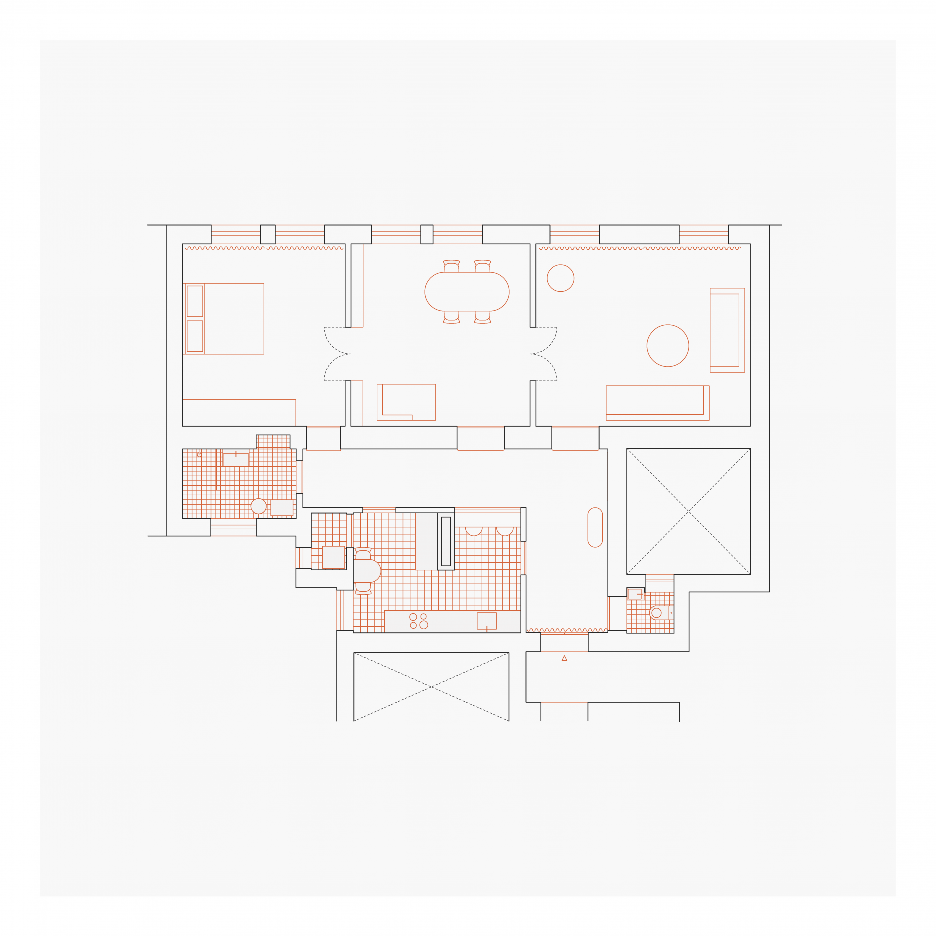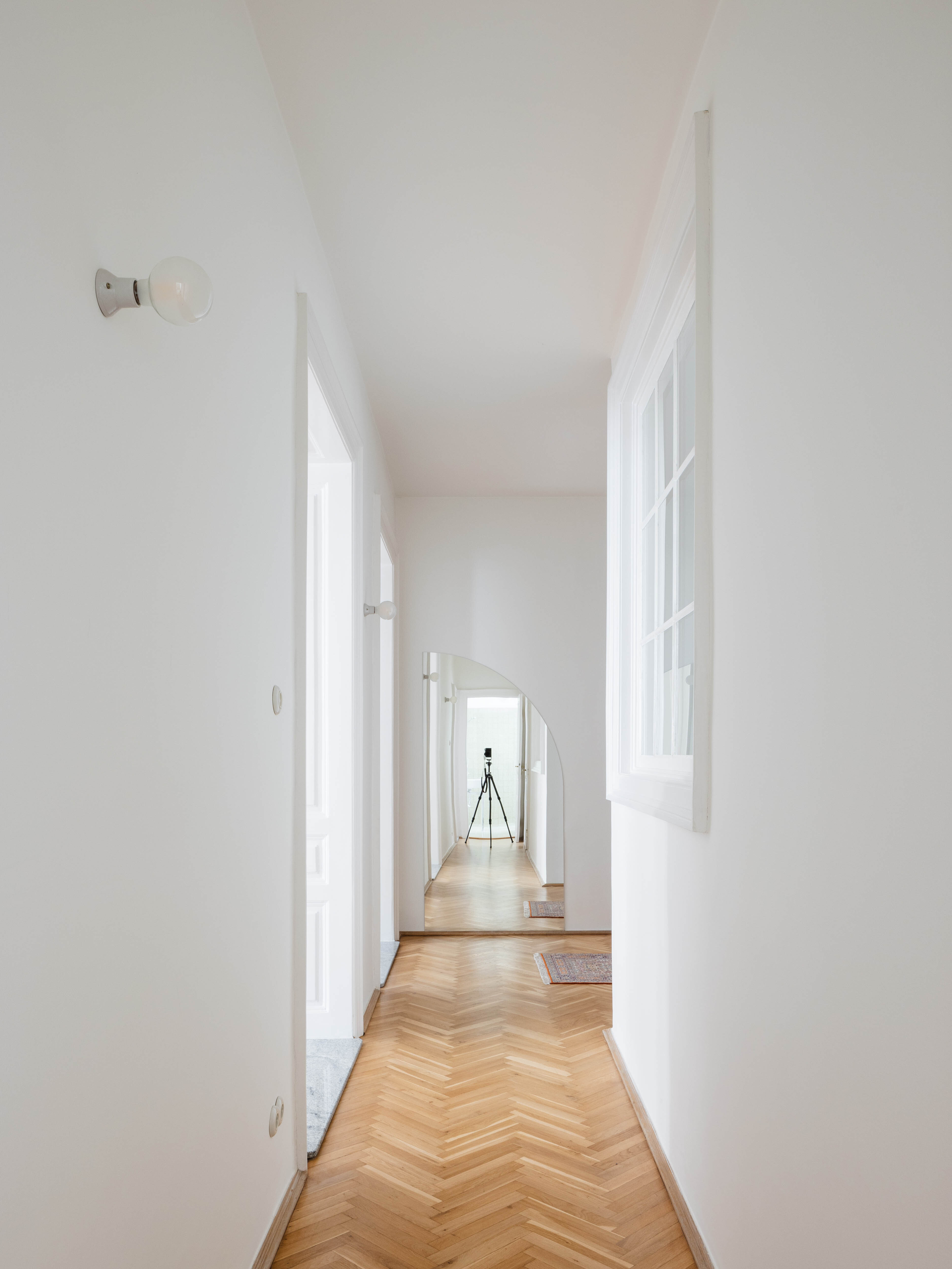 Od výstavby domu v roku 1909 (arch. Henrik Szántó) sa v byte na prvom poschodí vystriedalo niekoľko majiteľov, čo výrazne prispelo k narušeniu jeho vnútornej priestorovej a materiálovej kvality. Rekonštrukcia bytu sa snažila obnoviť plynulosť pohybu a transparentnosť, ktorú ponúkala dispozícia obytných miestností v enfiláde, a posilniť túto kvalitu vytvorením ďalších otvorov a vizuálnych prepojení v iných priestoroch bytu. Ďalším kľúčovým zámerom rekonštrukcie bolo subtílne nadviazať na pôvodnú materialitu budovy, ktorá je stále prítomná v jej spoločných priestoroch, a to najmä prácou s lokálne vyrábanými sadrovými prvkami a cementovým obkladom.