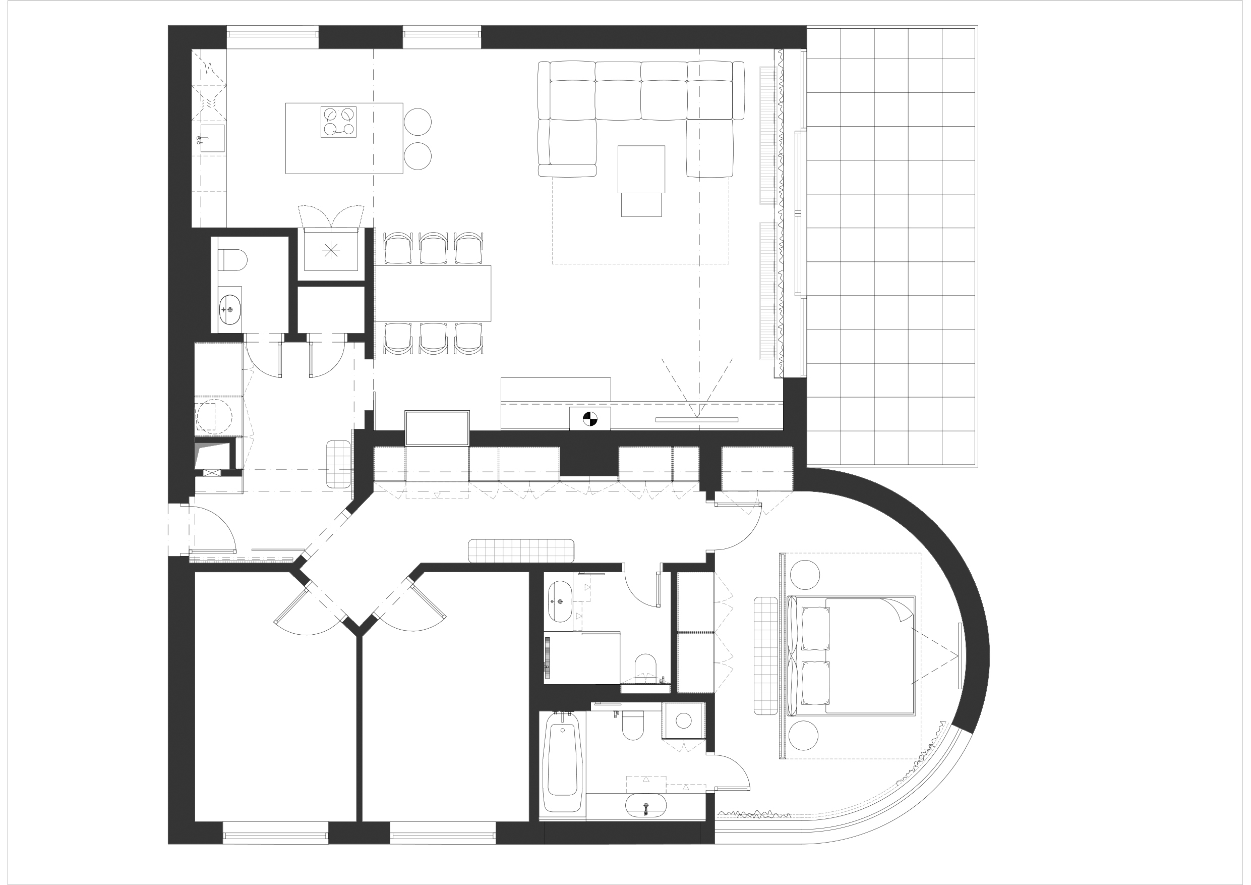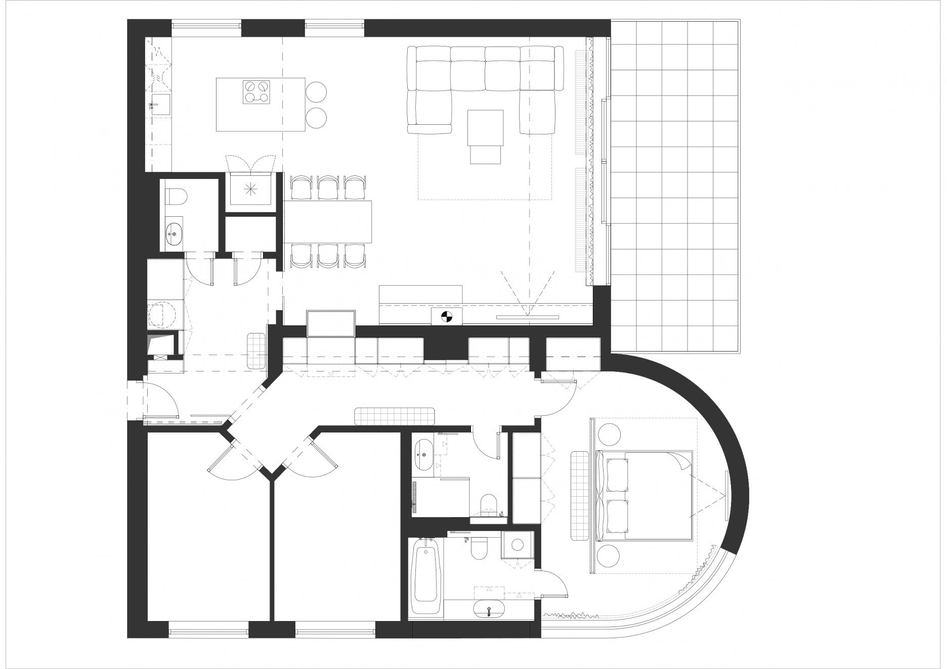 Byt má pomerne jednoduchý pôdorys s jednou špecifickou poloblúkovou miestnosťou, v ktorej sa nachádza hlavná spálňa. Tejto spálne sa týkala jedna zo zásadných zmien – otočenie pôvodnej dispozície a pridanie drevenej steny ako výrazného interiérového prvku. Tým sa dosiahlo vytvorenie samostatnej šatníkovej časti a filtrovanie vstupu do spálne a kúpeľne. Výška drevenej steny korešponduje s výškou interiérových dverí, za účelom zachovania rozptylu denného osvetlenia.