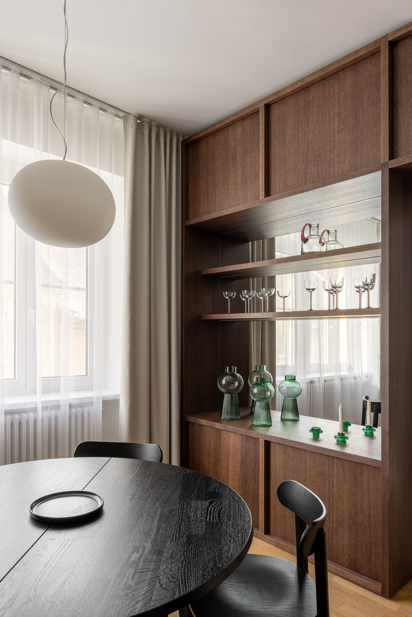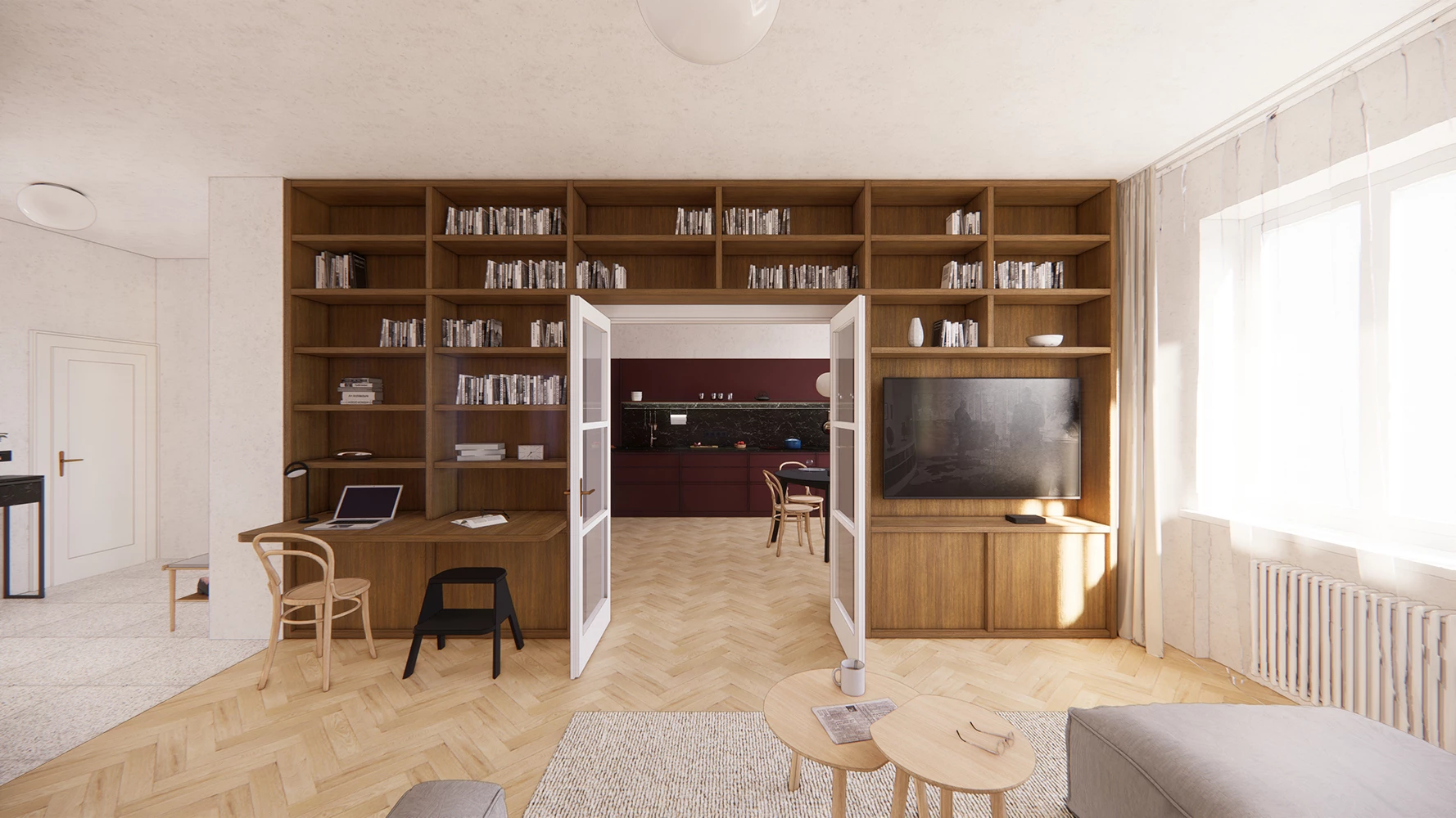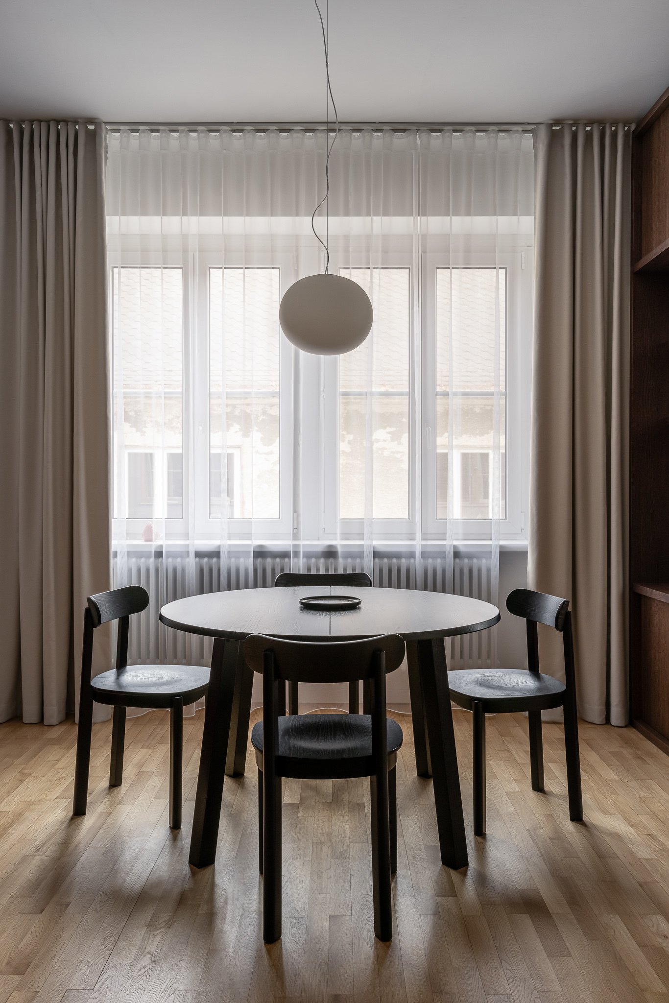 Aktuálna realizácia bratislavského ateliéru NOIZ architekti. Architektom Samuelovi Zemanovi a Andrejovi Šabovi sa podarilo pri minimalizovaní zásahov do stavebných konštrukcií výrazne optimalizovať dispozíciu a prevádzkovú schému bytu. Medzi dôležité zmeny patrilo vytvorenie novej otvorenej dennej zóny. Výraznú súčasť interiéru tvoria precízne stolárske prvky s funkčnými detailami, zhotovené podľa autorského návrhu. Jednotlivé bloky vstavaného nábytku charakterizuje výrazná farebnosť a prírodné textúry materiálov, ktoré nechávajú vyniknúť súdobú vrstvu na pozadí pôvodnej stavebnej obálky.