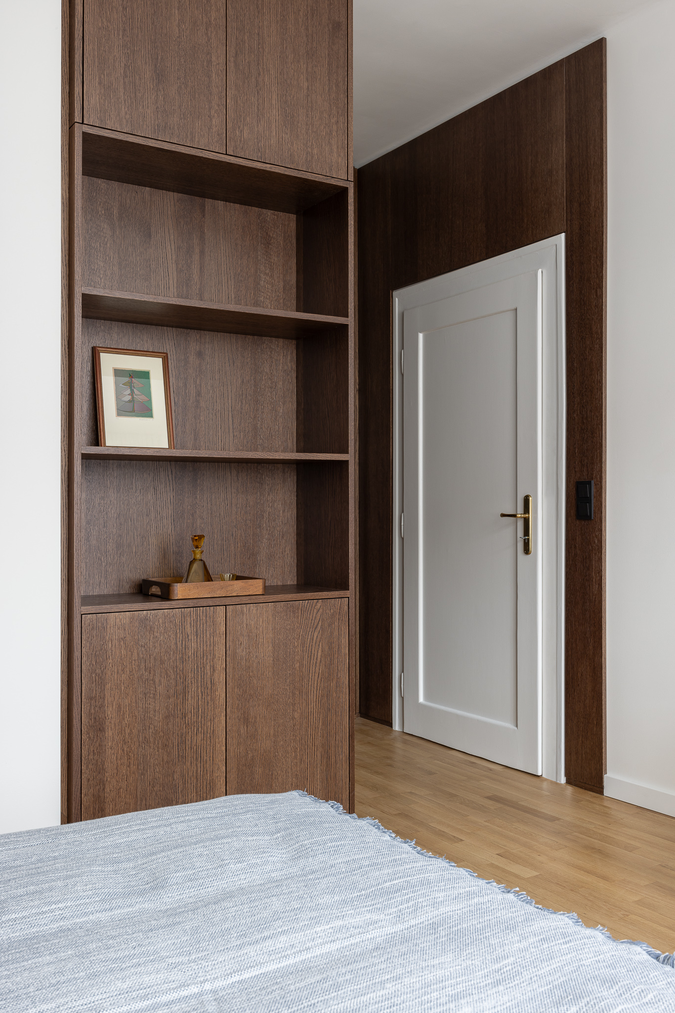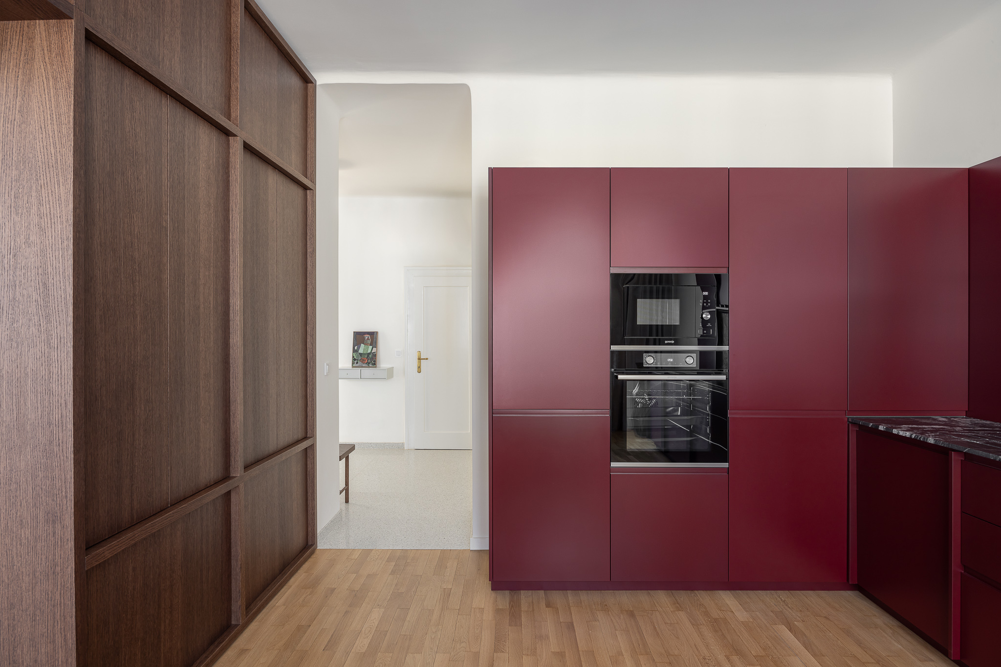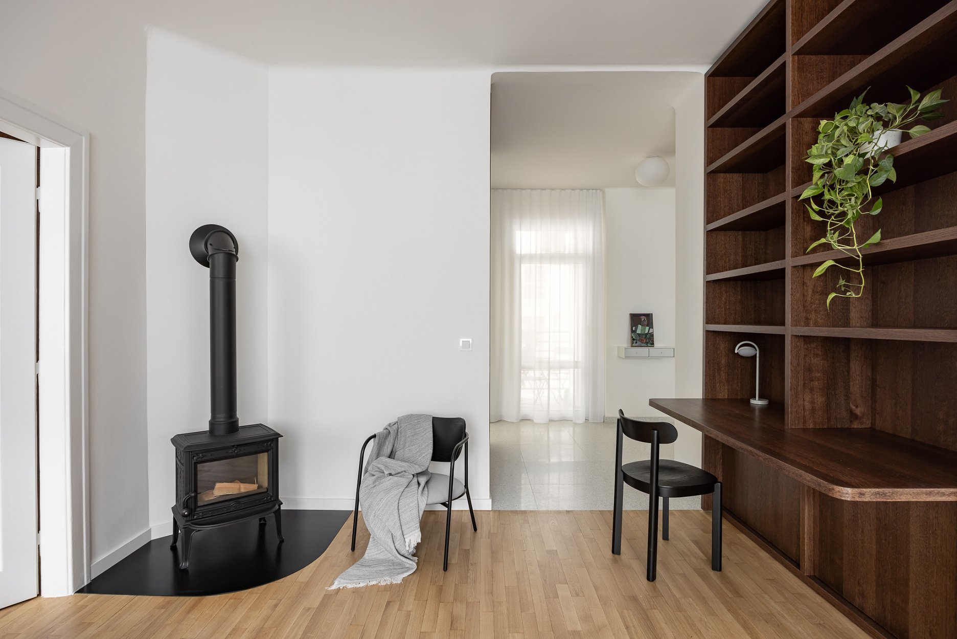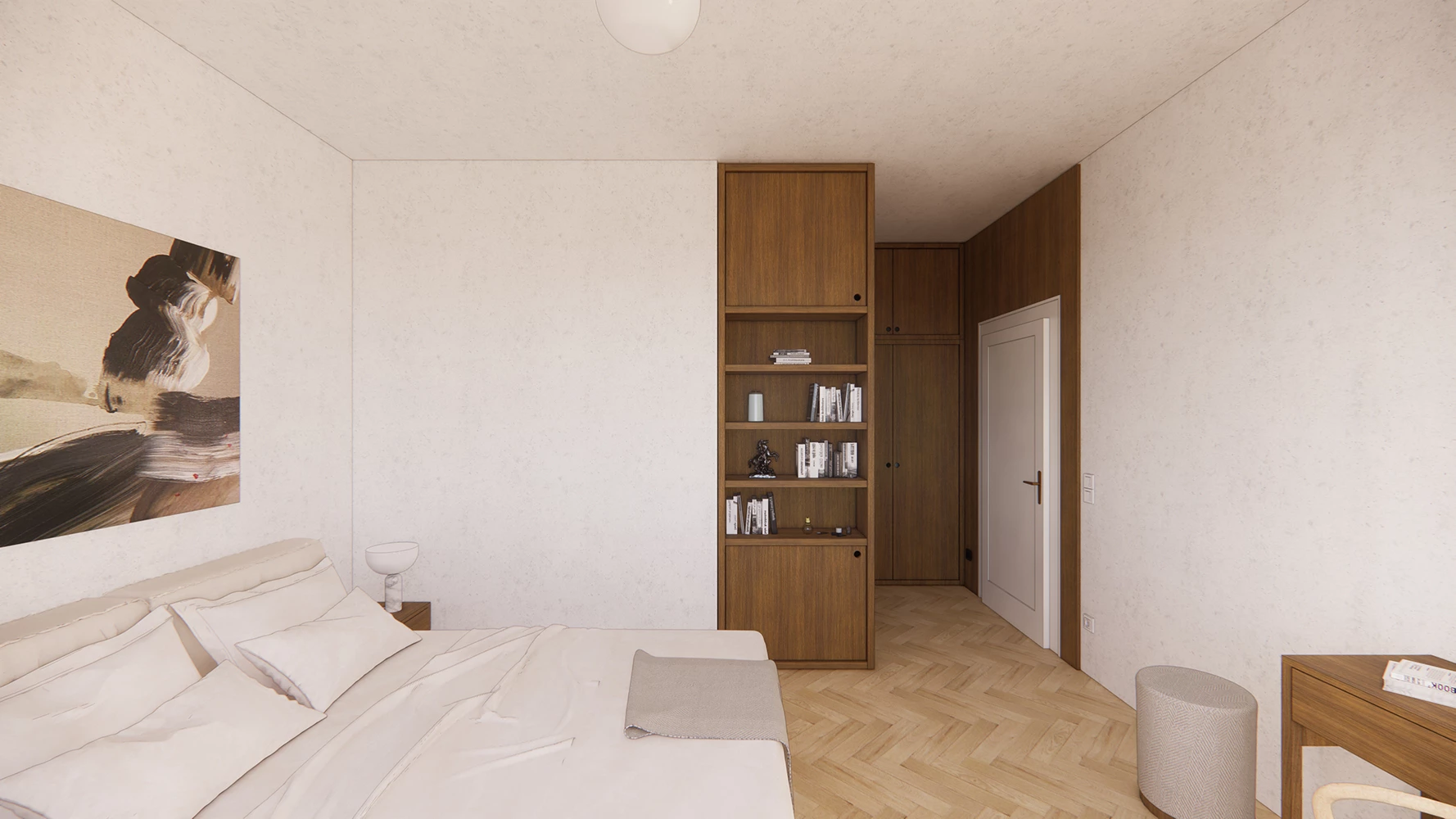 Aktuálna realizácia bratislavského ateliéru NOIZ architekti. Architektom Samuelovi Zemanovi a Andrejovi Šabovi sa podarilo pri minimalizovaní zásahov do stavebných konštrukcií výrazne optimalizovať dispozíciu a prevádzkovú schému bytu. Medzi dôležité zmeny patrilo vytvorenie novej otvorenej dennej zóny. Výraznú súčasť interiéru tvoria precízne stolárske prvky s funkčnými detailami, zhotovené podľa autorského návrhu. Jednotlivé bloky vstavaného nábytku charakterizuje výrazná farebnosť a prírodné textúry materiálov, ktoré nechávajú vyniknúť súdobú vrstvu na pozadí pôvodnej stavebnej obálky.