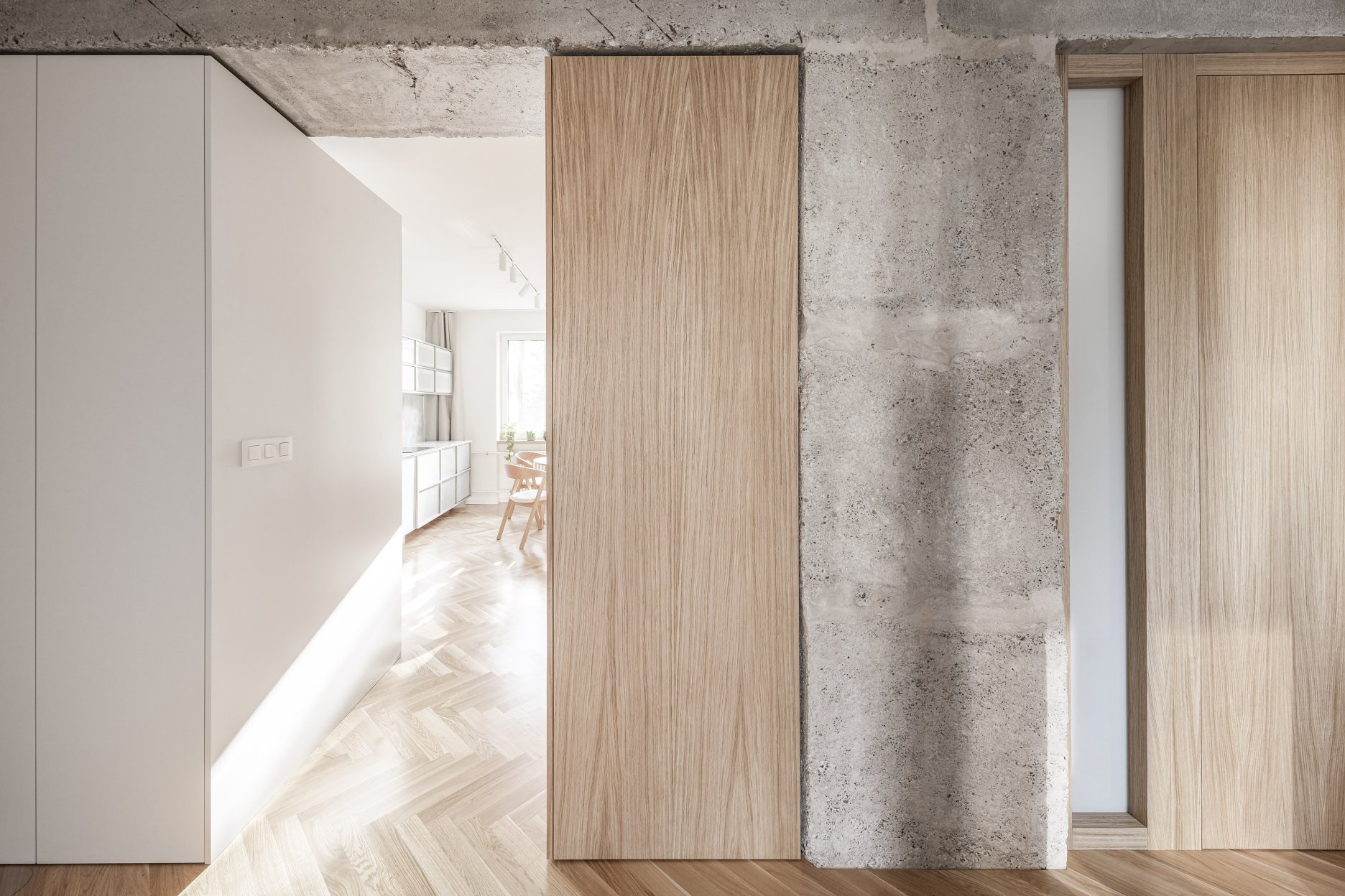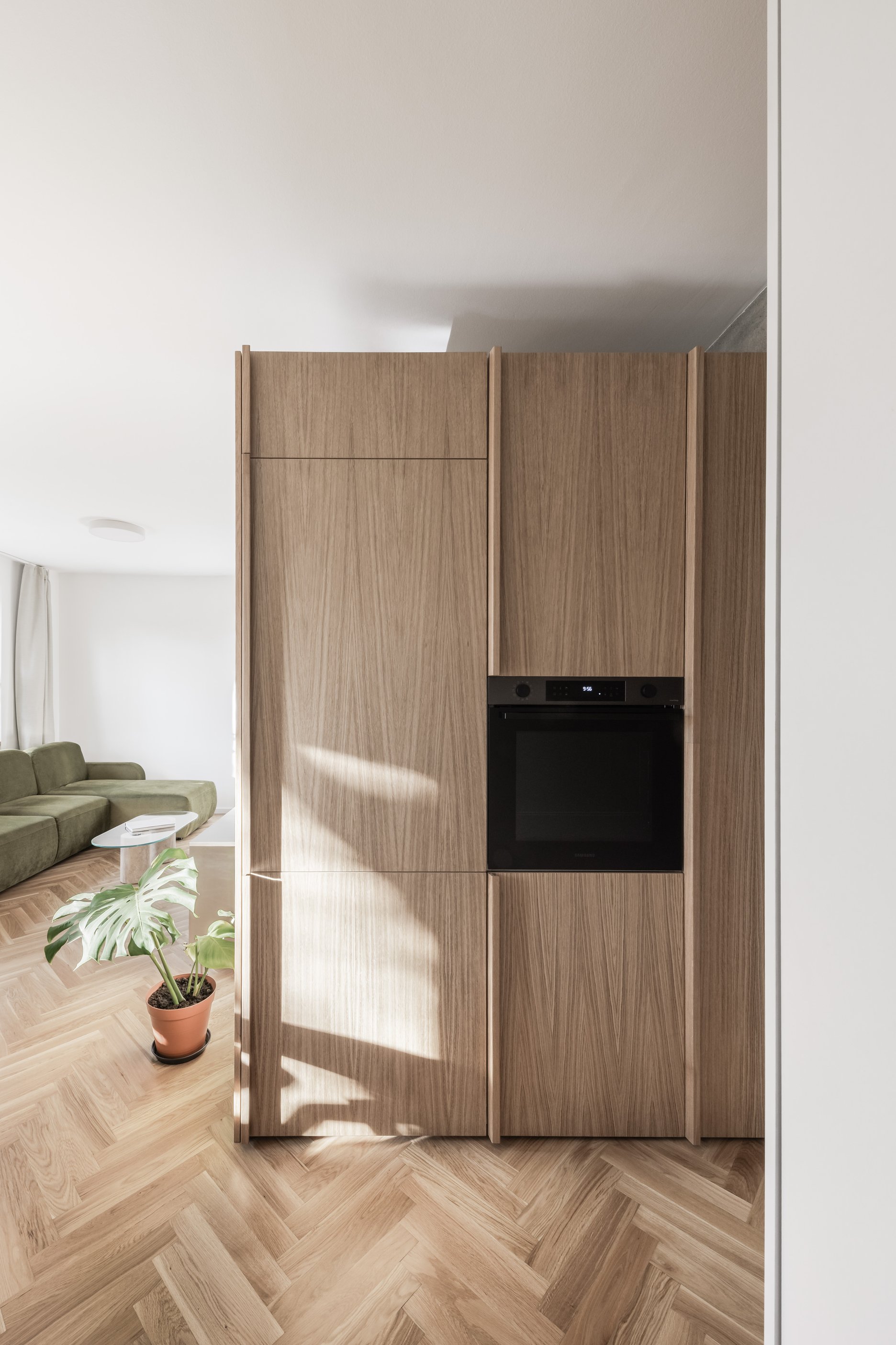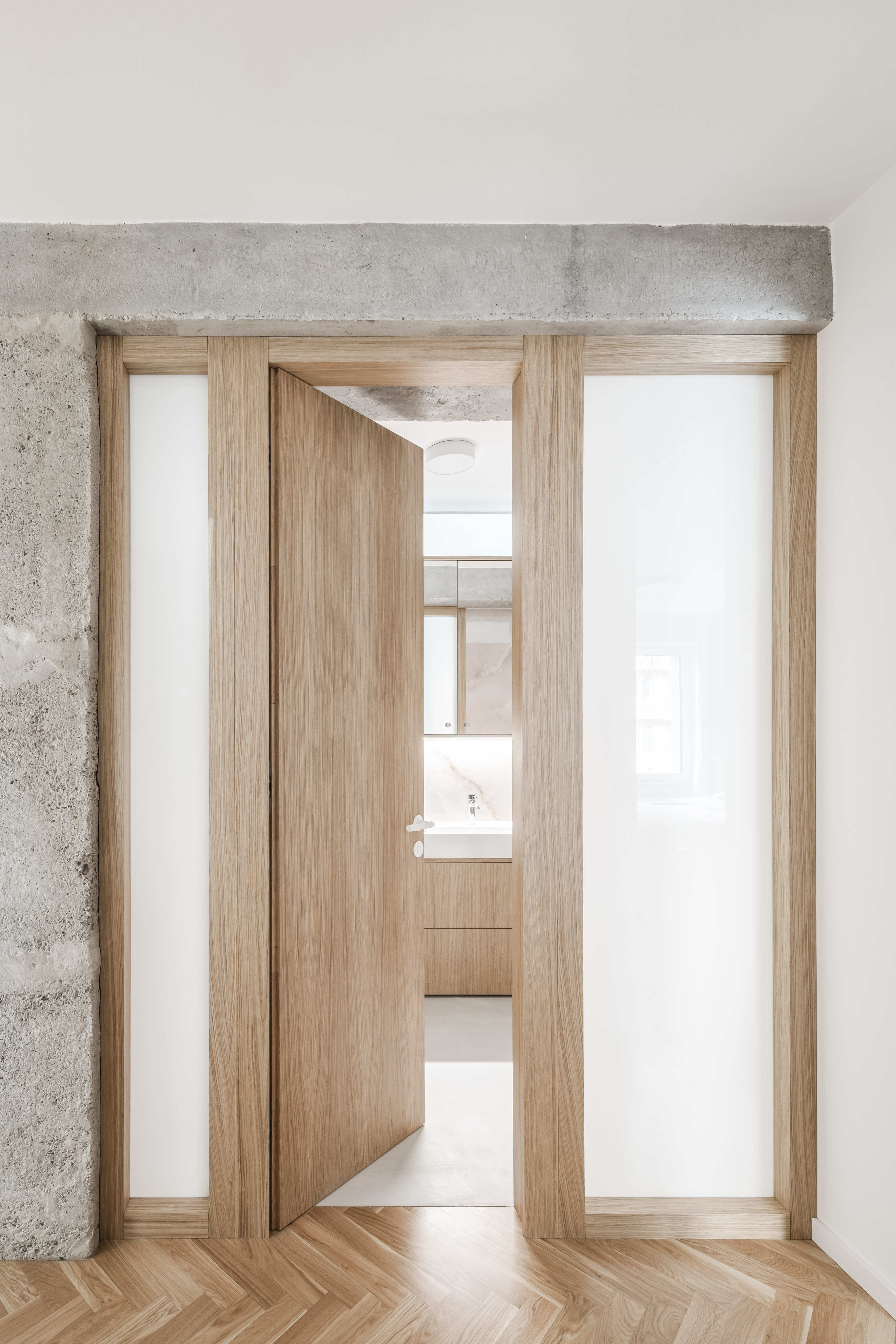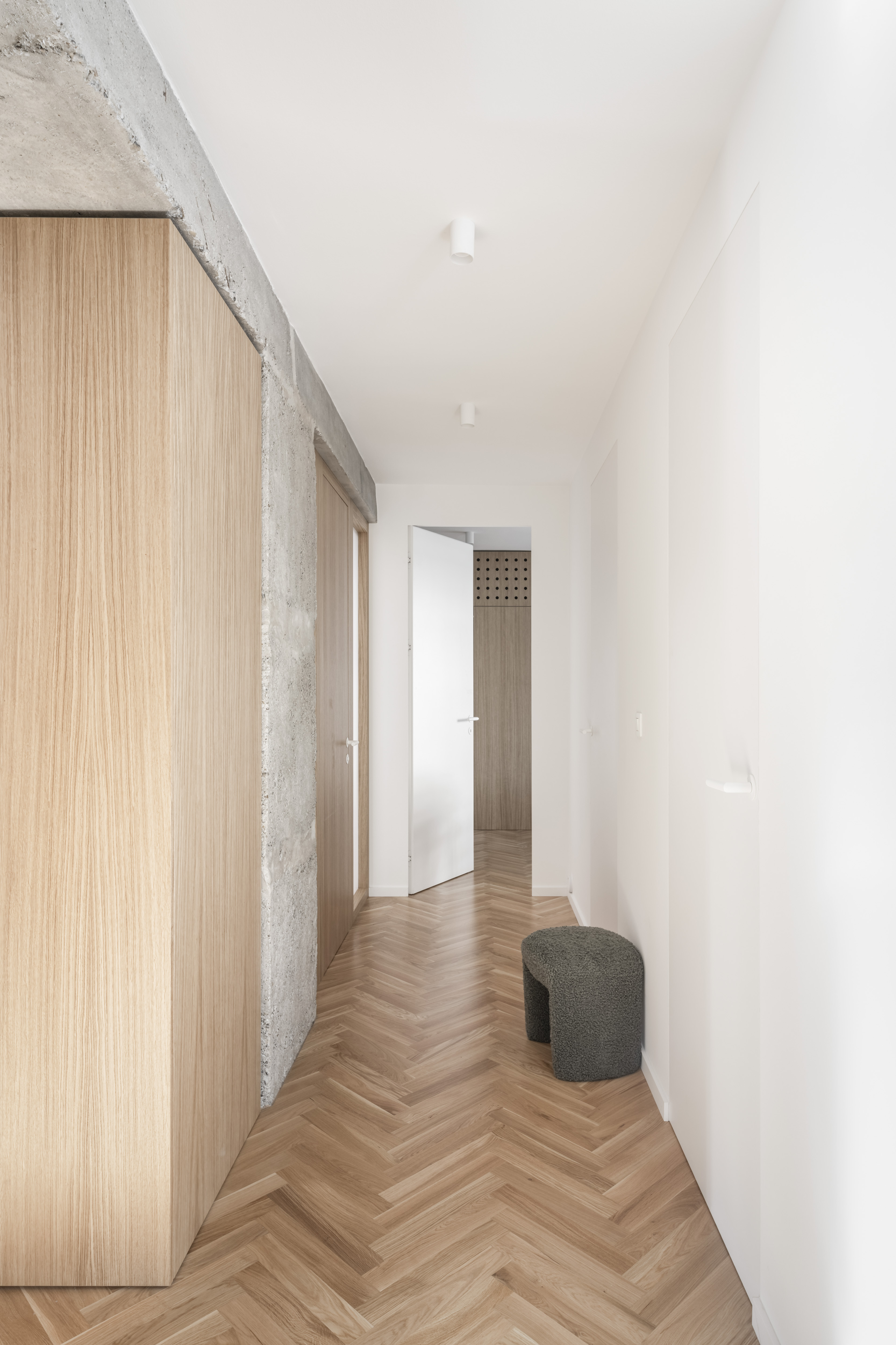 V interiéri prevládajú svetlé farby a prírodné materiály. Drevená vlysová podlaha uložená do stromčeka plynule prechádza celým obytným priestorom. V kúpeľni a WC ju dopĺňajú monochromatické liate mikrocementové podlahy. Čistota detailu je umocnená využitím bezzárubňového dverného systému, výškovo nadväzujúceho na hranu betónového prekladu. V byte sa nachádza množstvo úložných priestorov, ktoré tvoria najmä nábytkové zostavy splývajúce so stenami, čím sa zachováva minimalistický charakter interiéru.