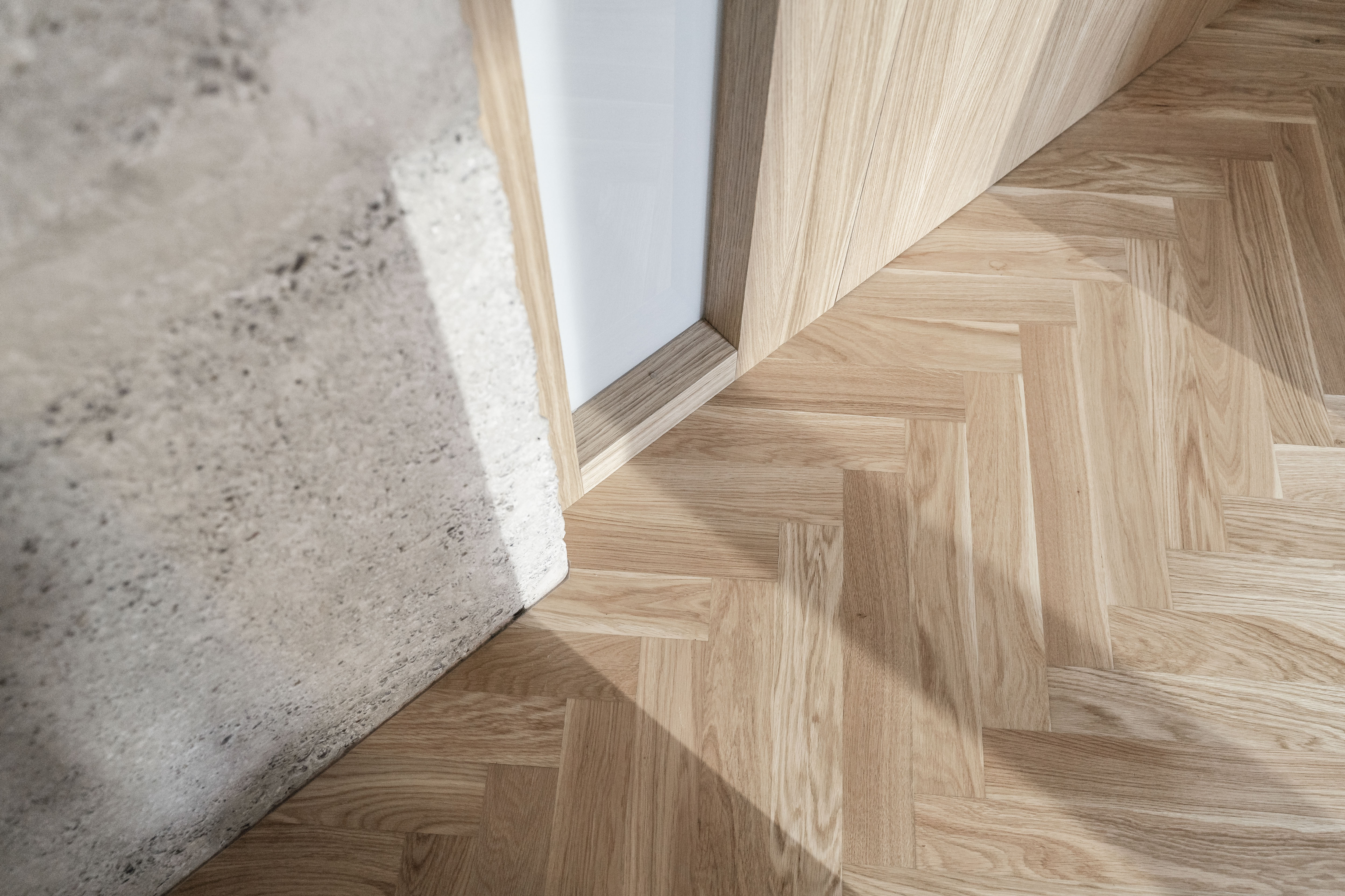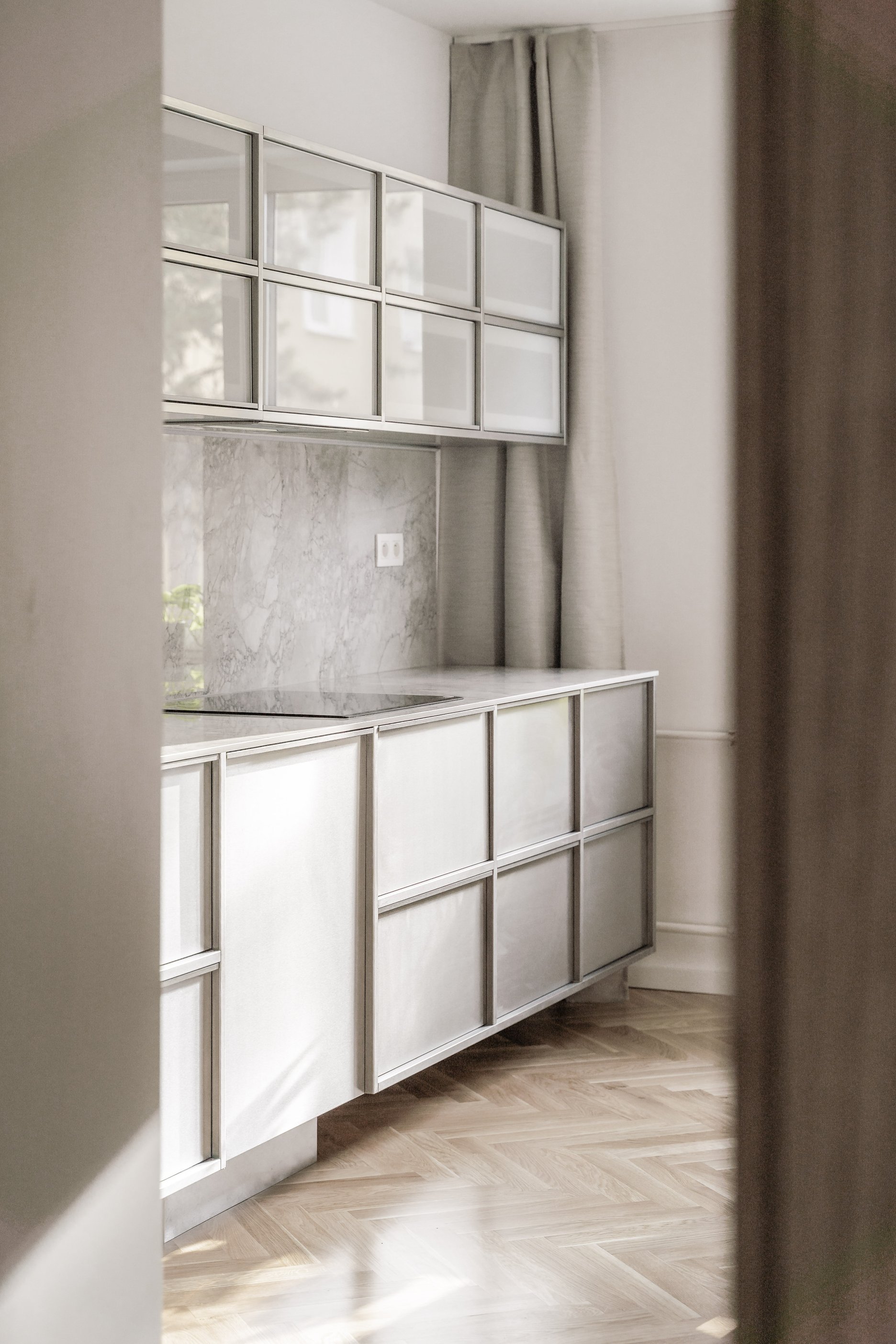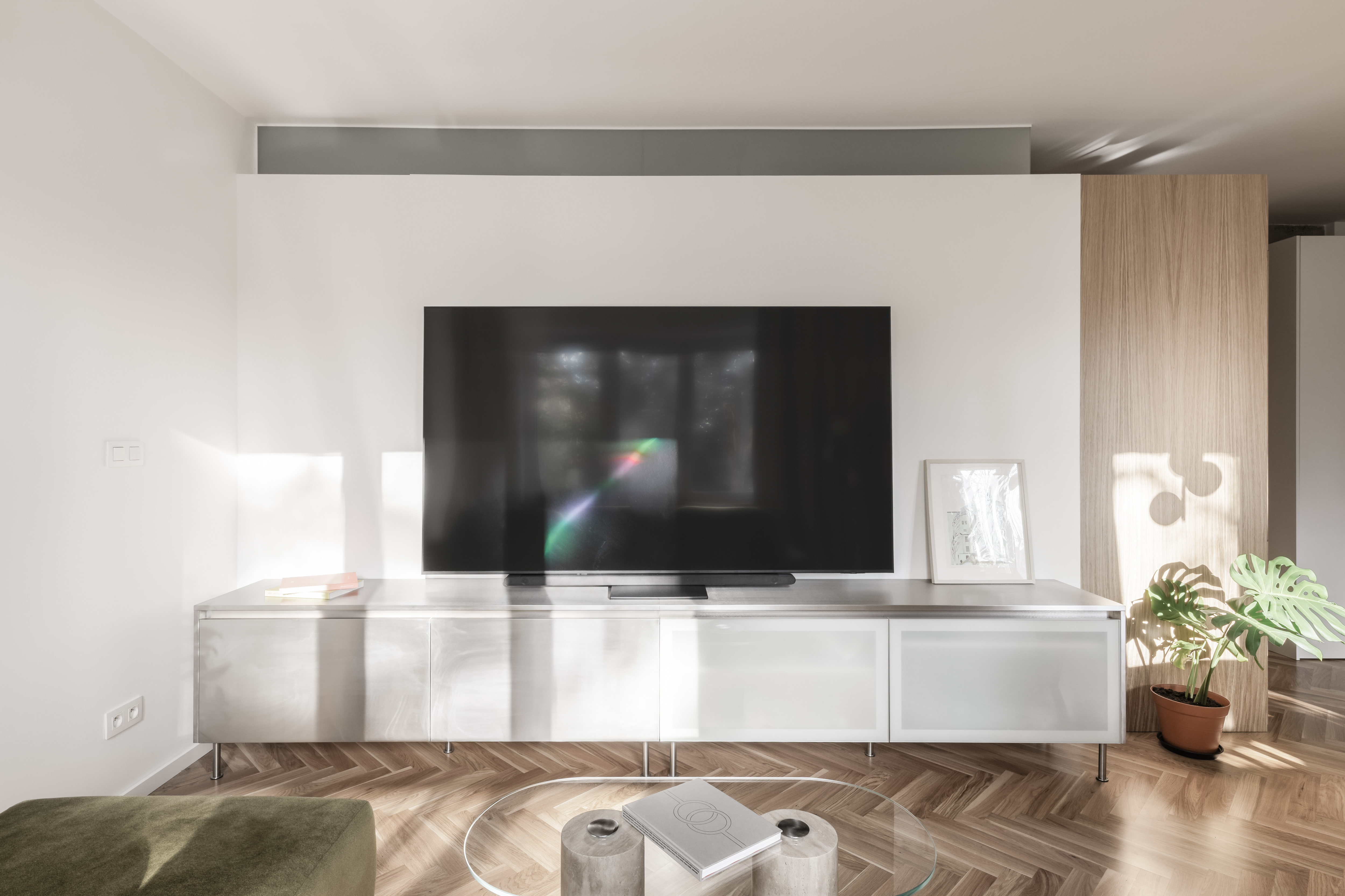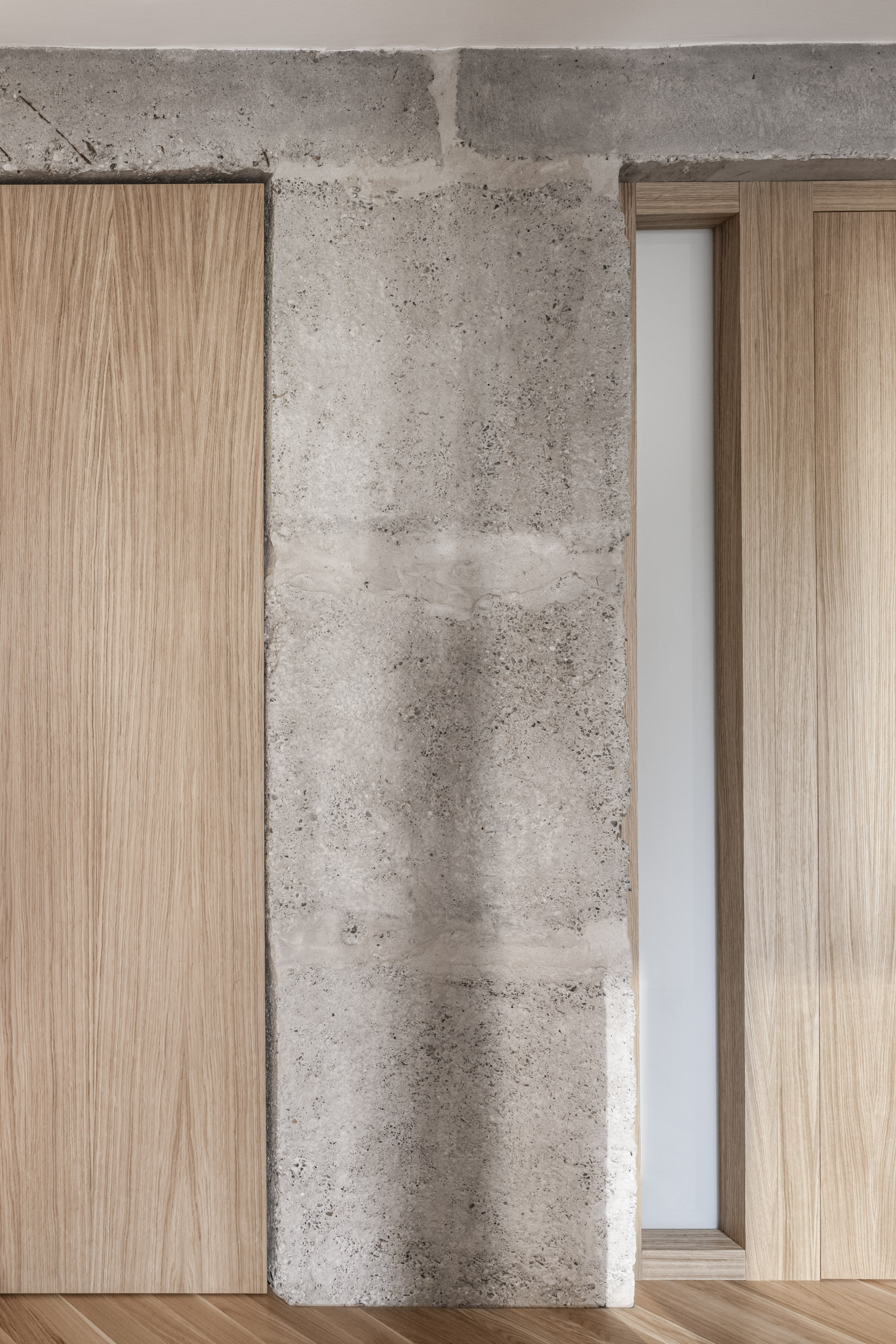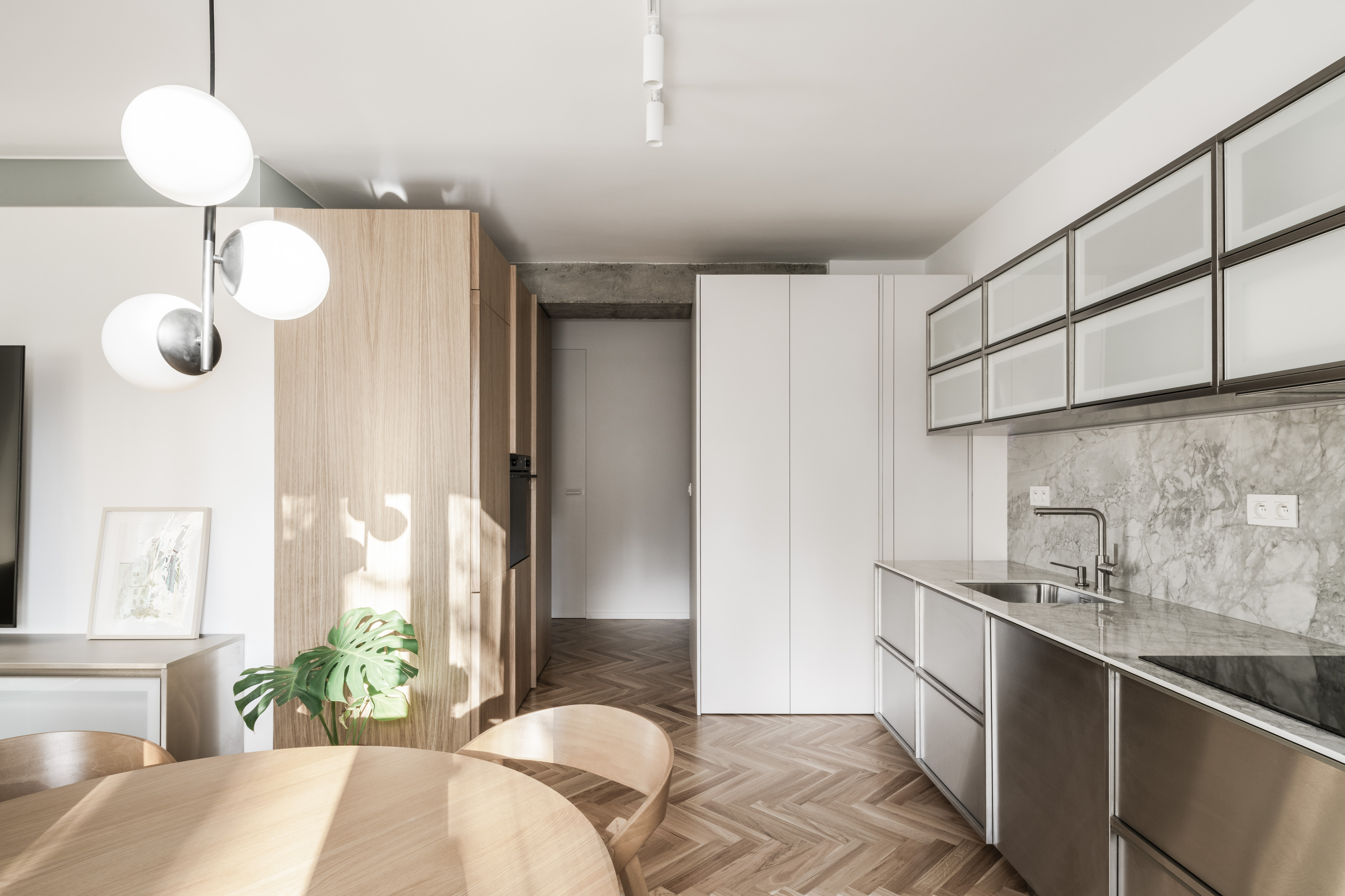 V interiéri prevládajú svetlé farby a prírodné materiály. Drevená vlysová podlaha uložená do stromčeka plynule prechádza celým obytným priestorom. V kúpeľni a WC ju dopĺňajú monochromatické liate mikrocementové podlahy. Čistota detailu je umocnená využitím bezzárubňového dverného systému, výškovo nadväzujúceho na hranu betónového prekladu. V byte sa nachádza množstvo úložných priestorov, ktoré tvoria najmä nábytkové zostavy splývajúce so stenami, čím sa zachováva minimalistický charakter interiéru.