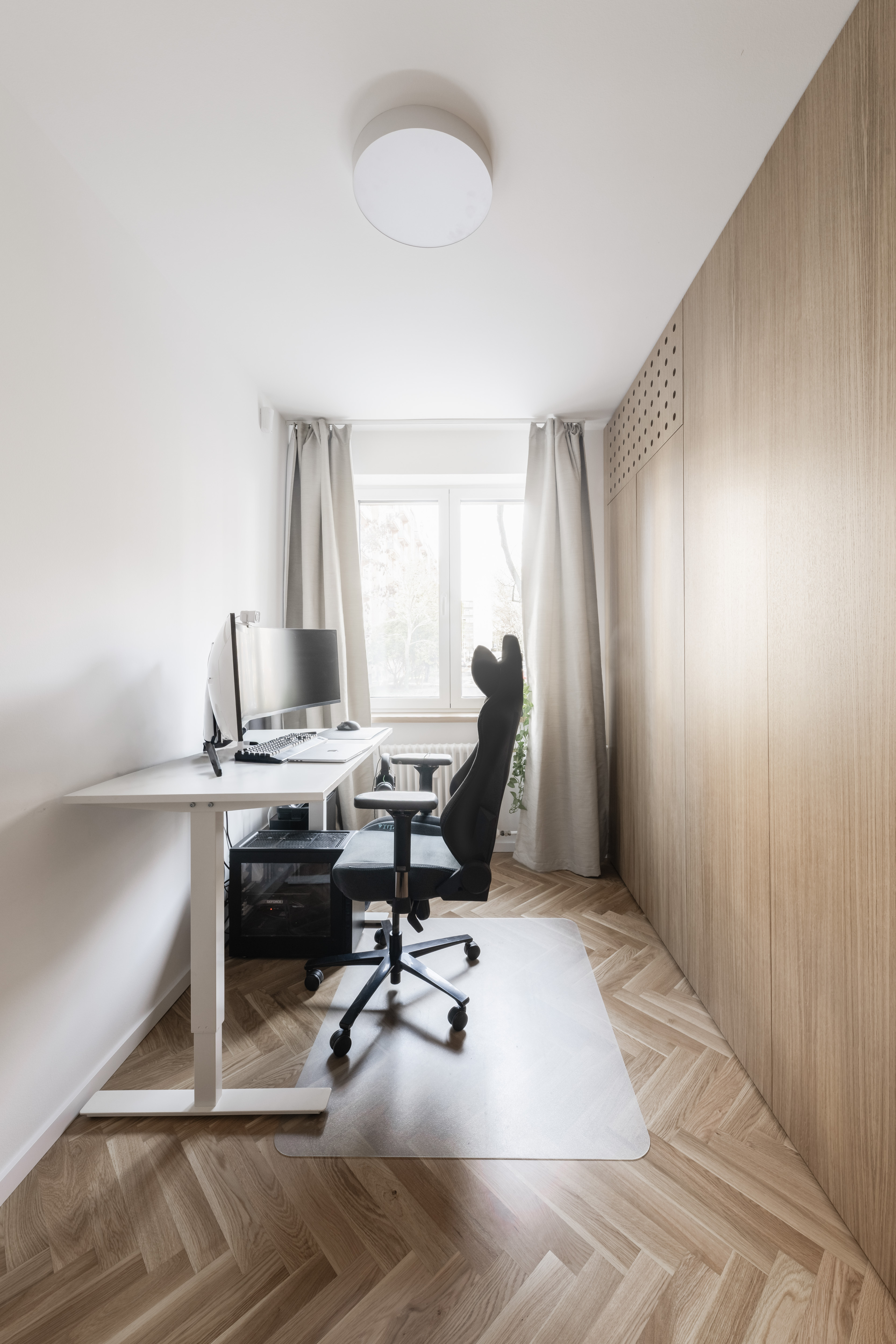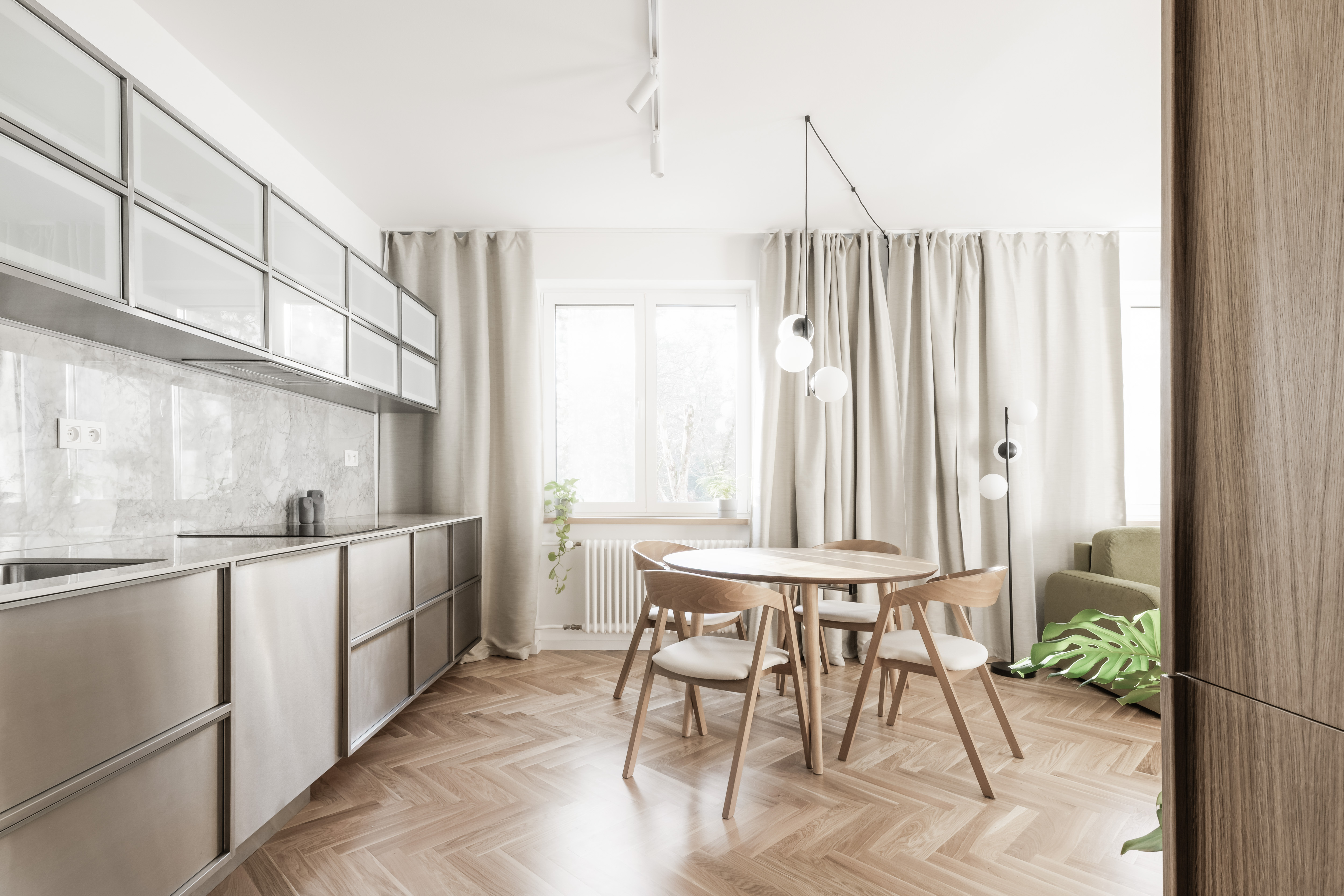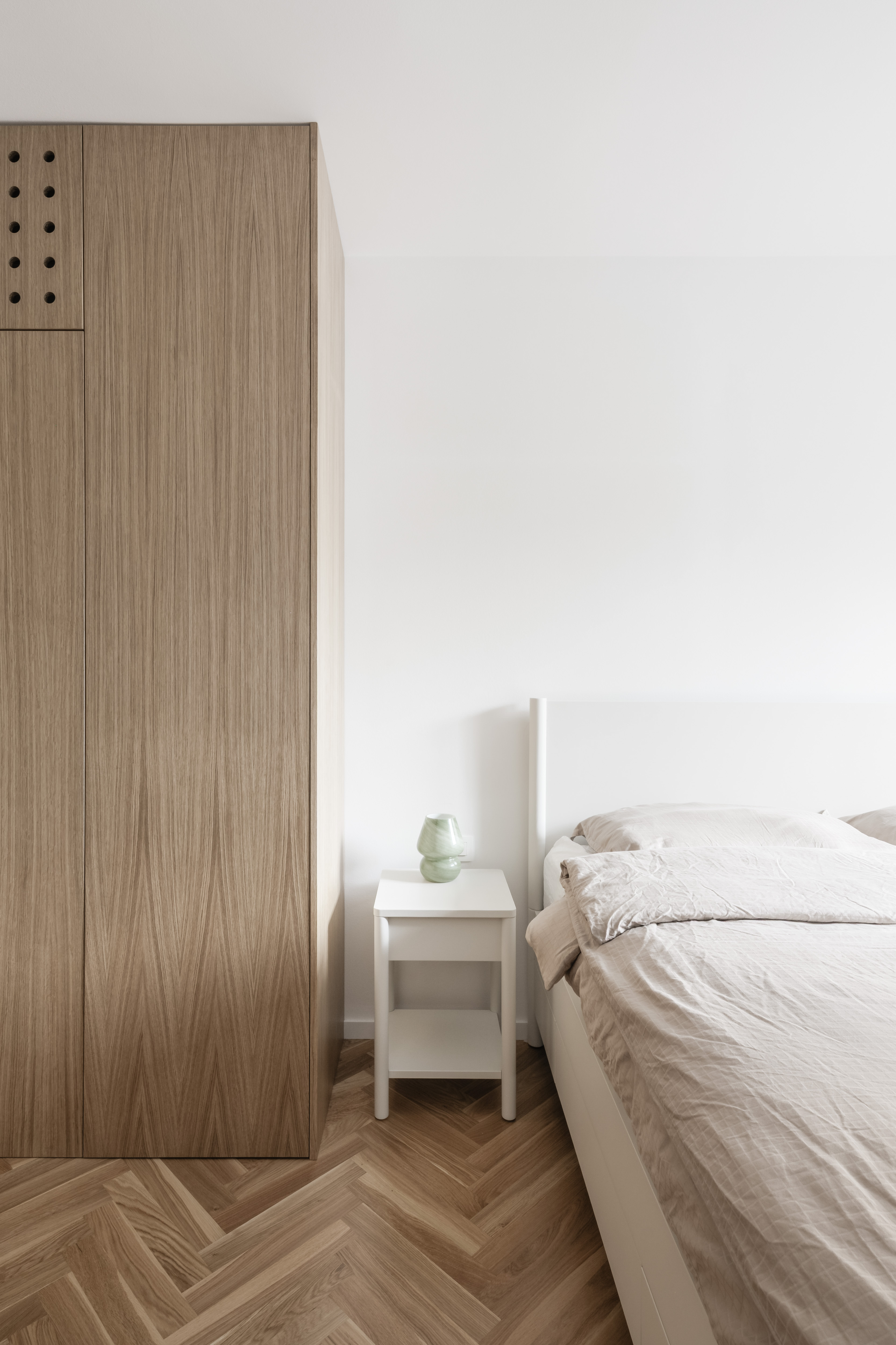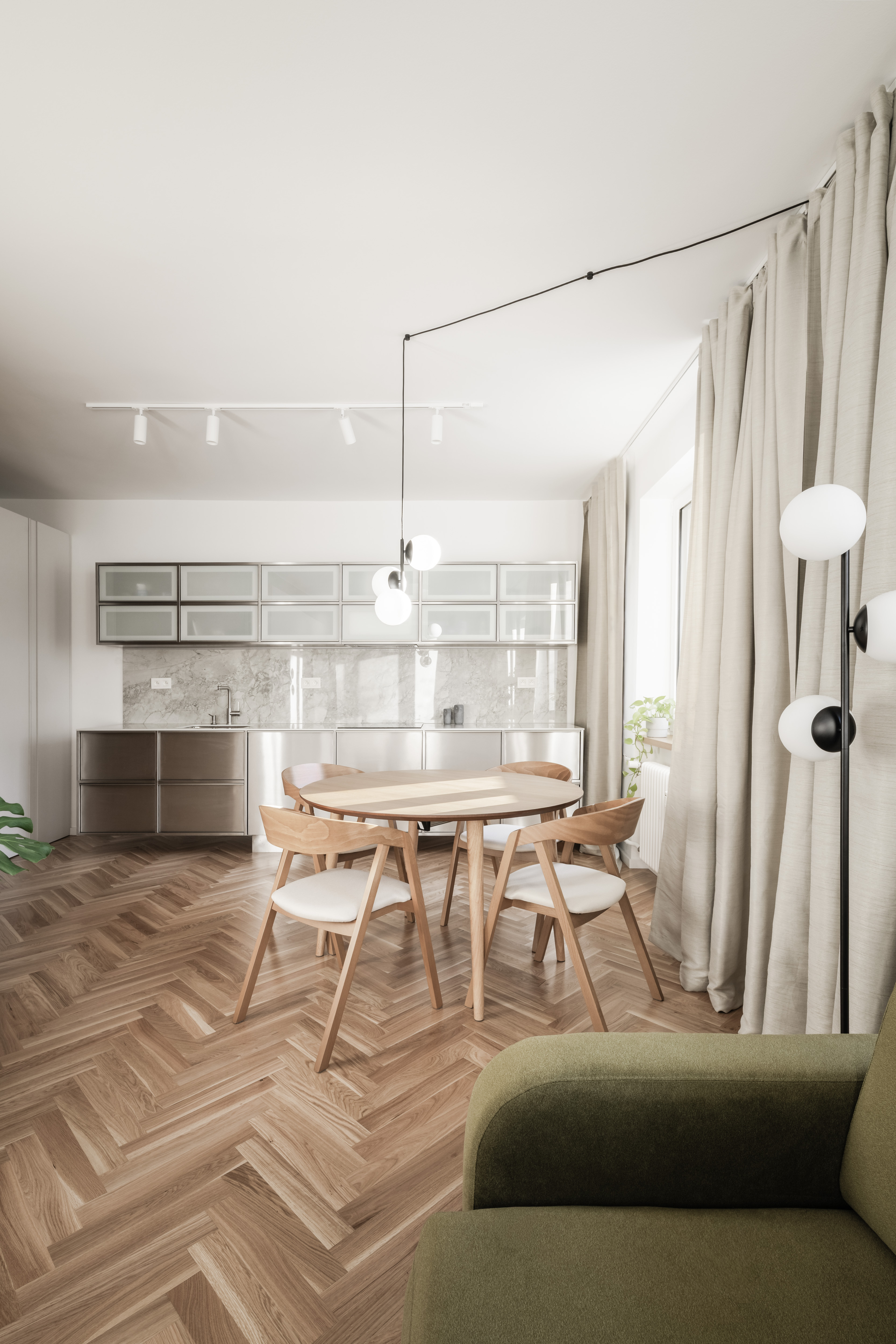 V interiéri prevládajú svetlé farby a prírodné materiály. Drevená vlysová podlaha uložená do stromčeka plynule prechádza celým obytným priestorom. V kúpeľni a WC ju dopĺňajú monochromatické liate mikrocementové podlahy. Čistota detailu je umocnená využitím bezzárubňového dverného systému, výškovo nadväzujúceho na hranu betónového prekladu. V byte sa nachádza množstvo úložných priestorov, ktoré tvoria najmä nábytkové zostavy splývajúce so stenami, čím sa zachováva minimalistický charakter interiéru.