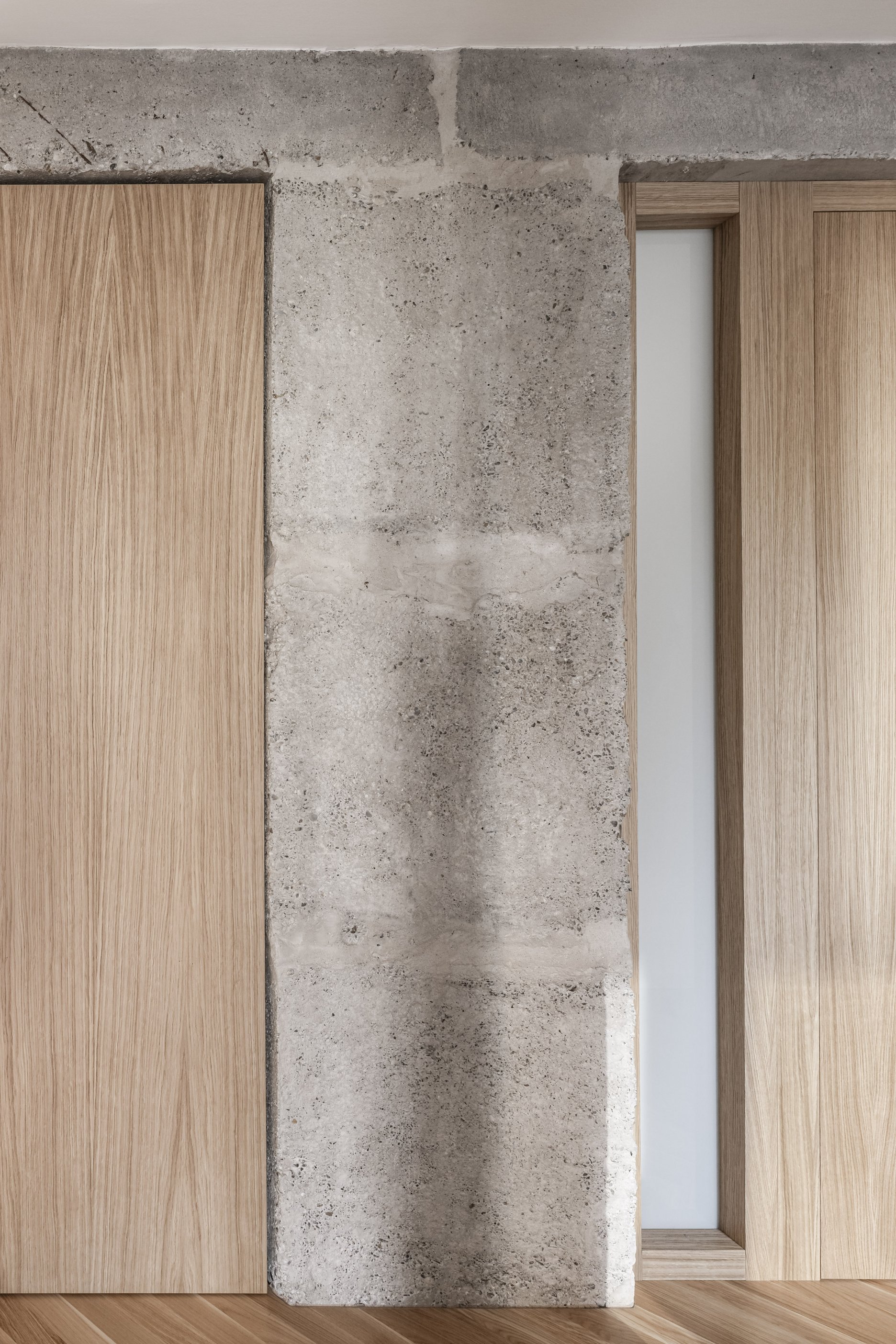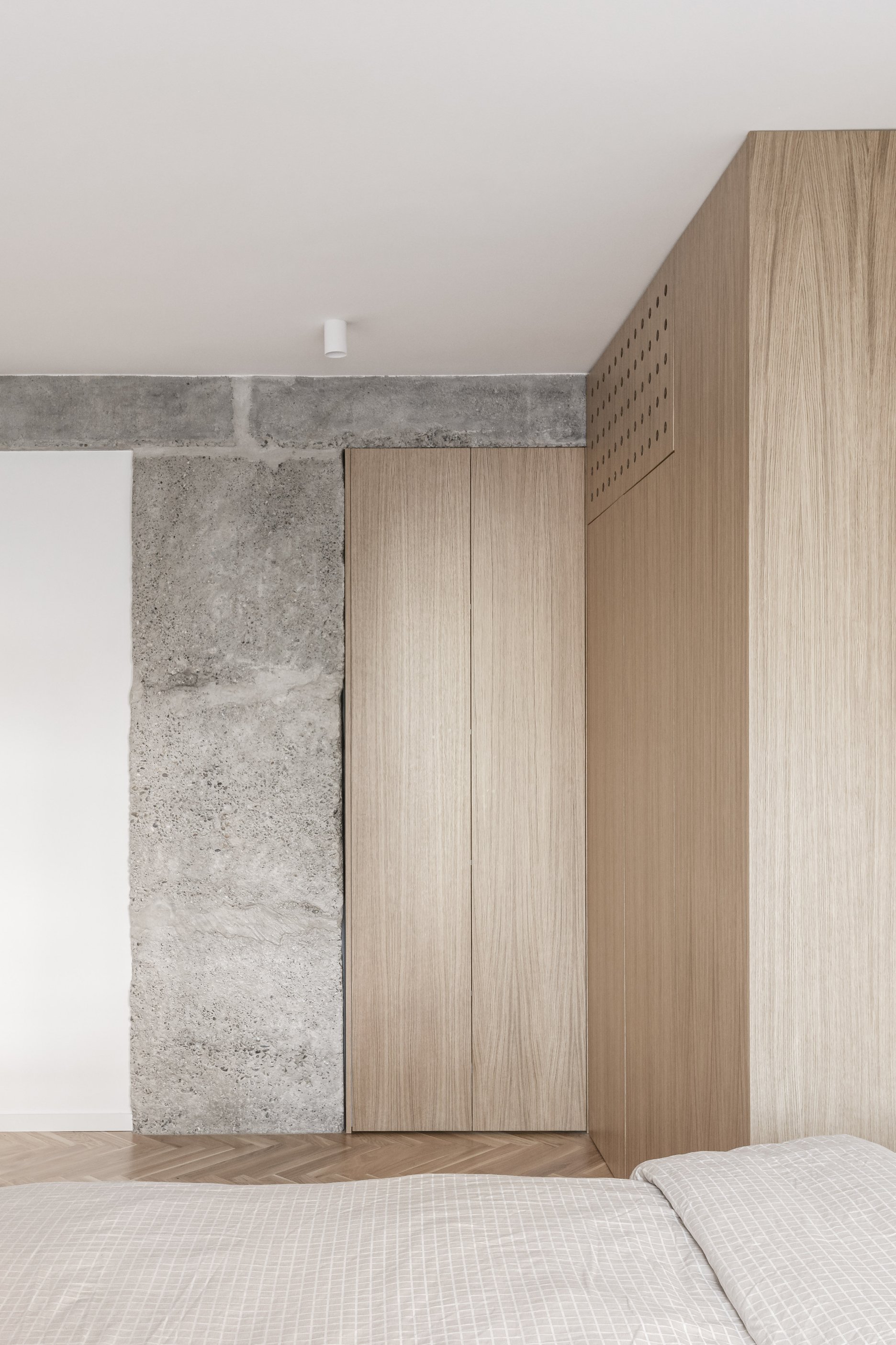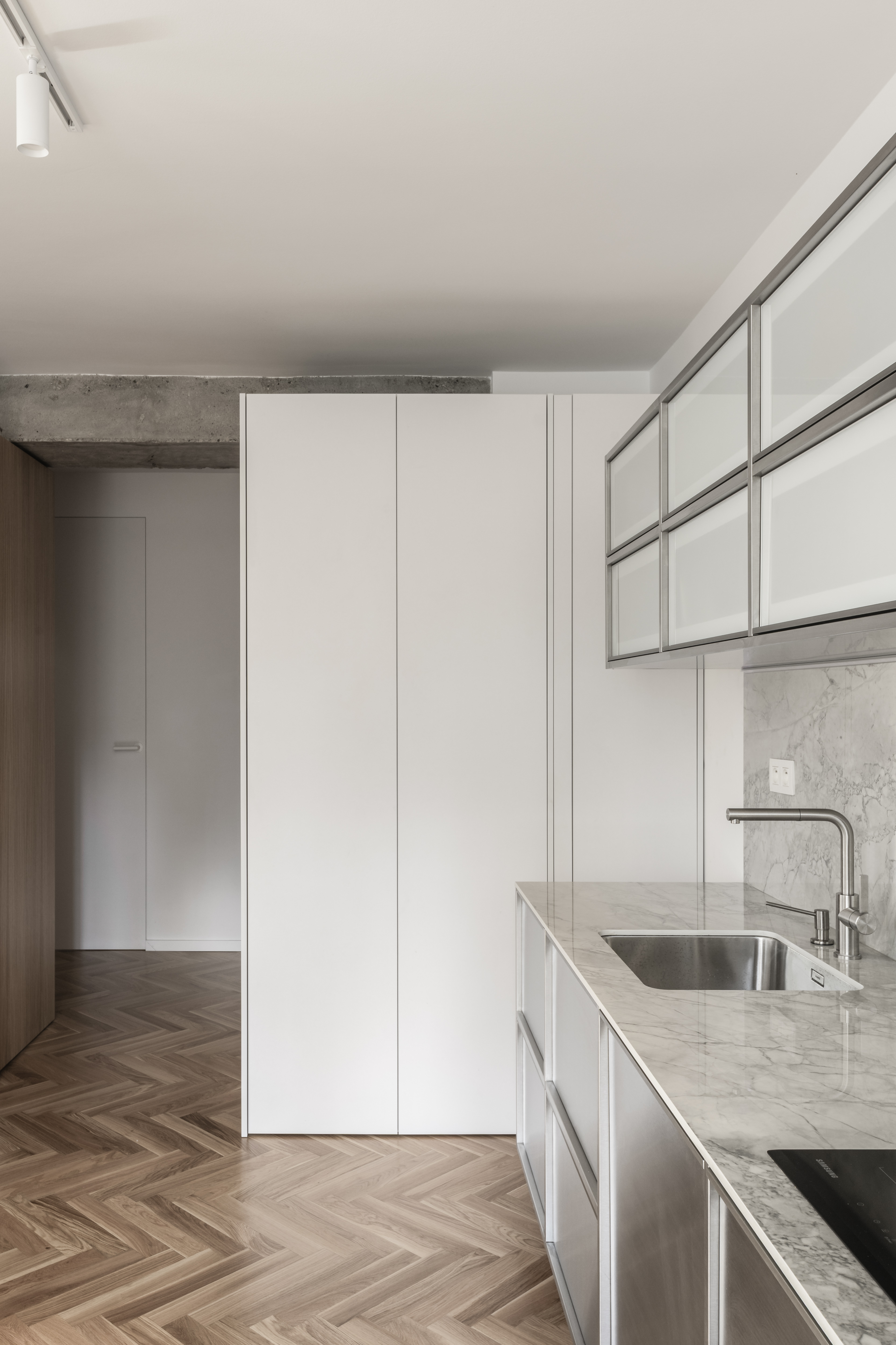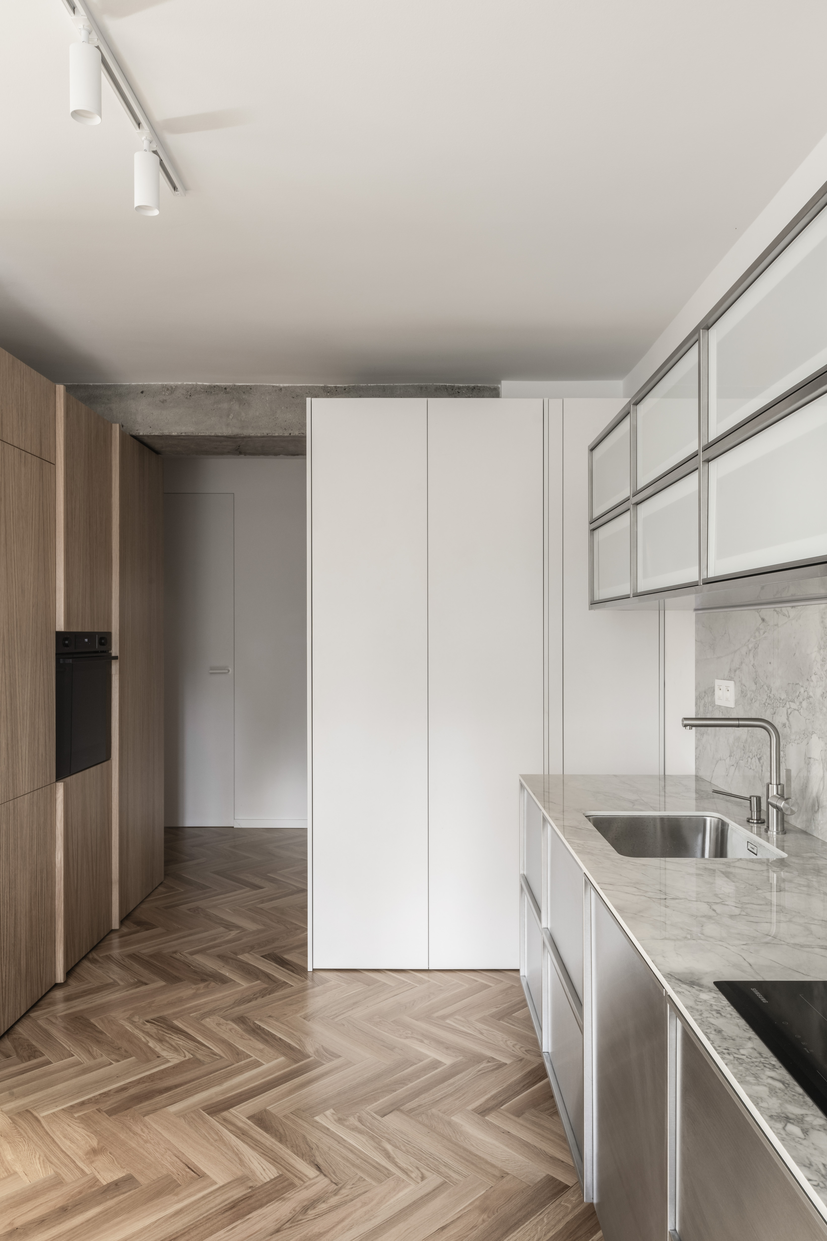 Rekonštrukcia bytu v Bratislave z dielne abrama architekti pracuje s kontrastom priznaných pôvodných konštrukcií a nových precíznych detailov. Priestor plynie okolo centrálneho kubusu hygienického zázemia, ktorý spolu s nosným systémom prirodzene definuje denné a nočné zónovanie bytu. Finálne architektonické riešenie formujú integrované úložné prvky, bezzárubňové dvere a nerezové akcenty, ktoré podčiarkujú surovosť betónu.