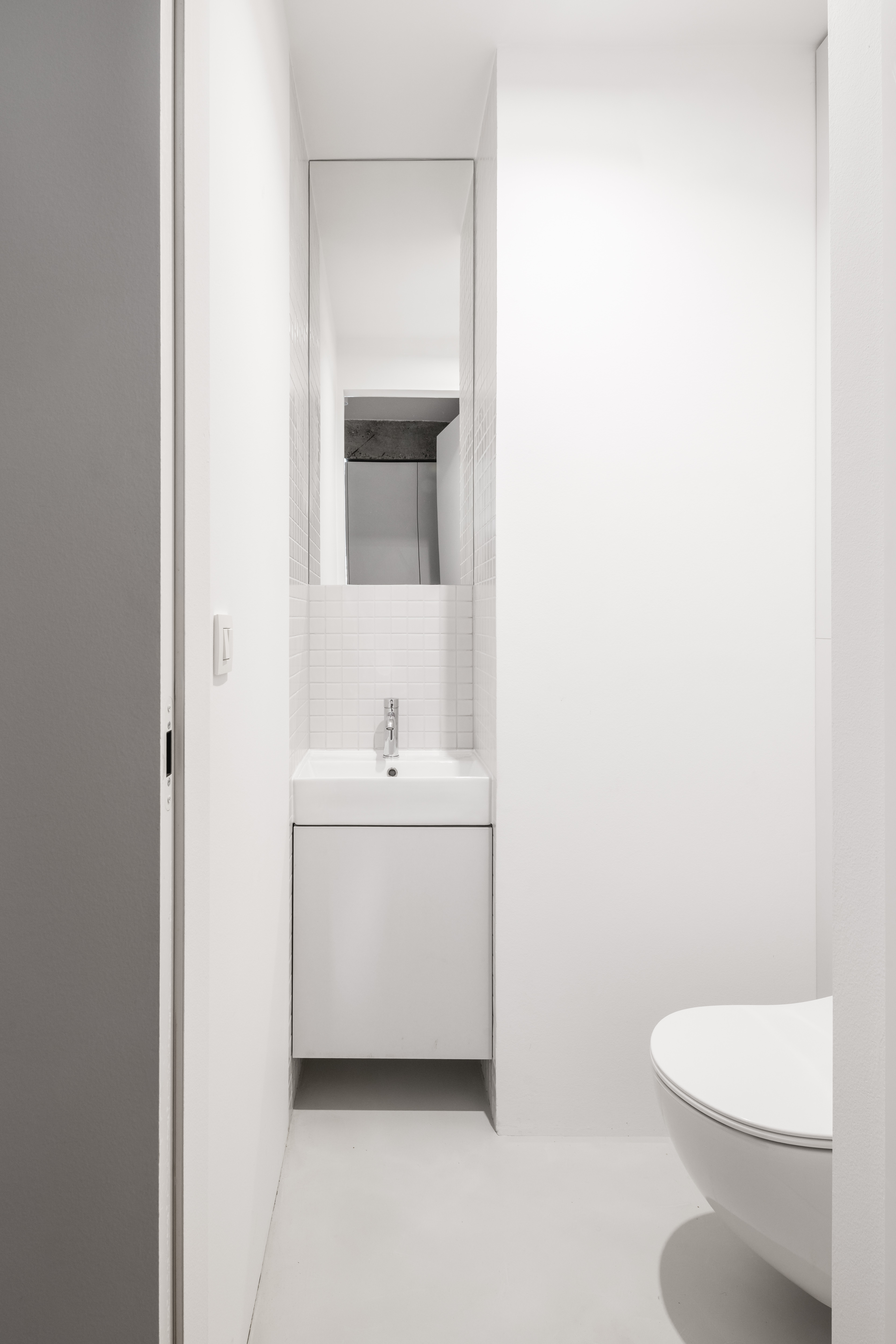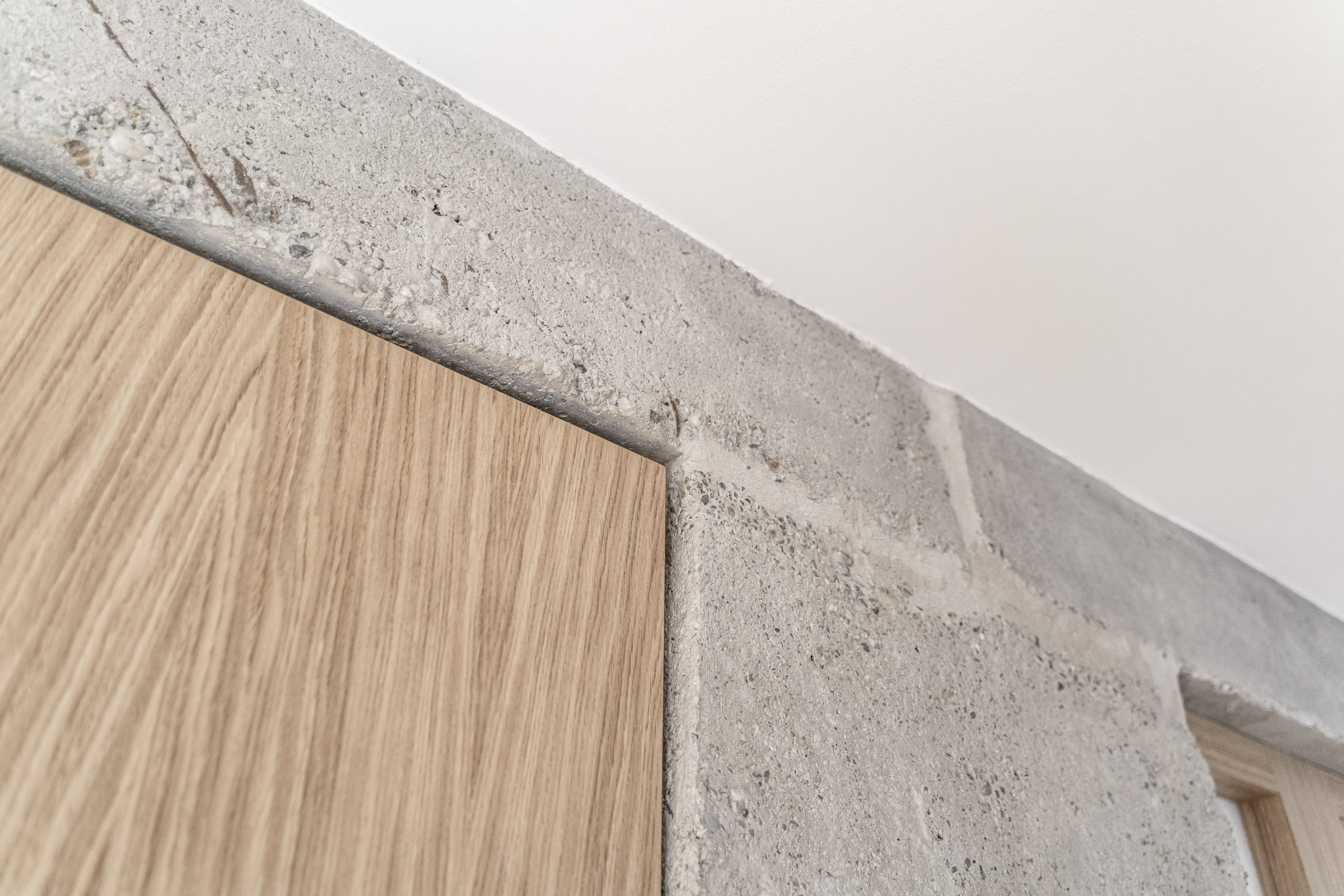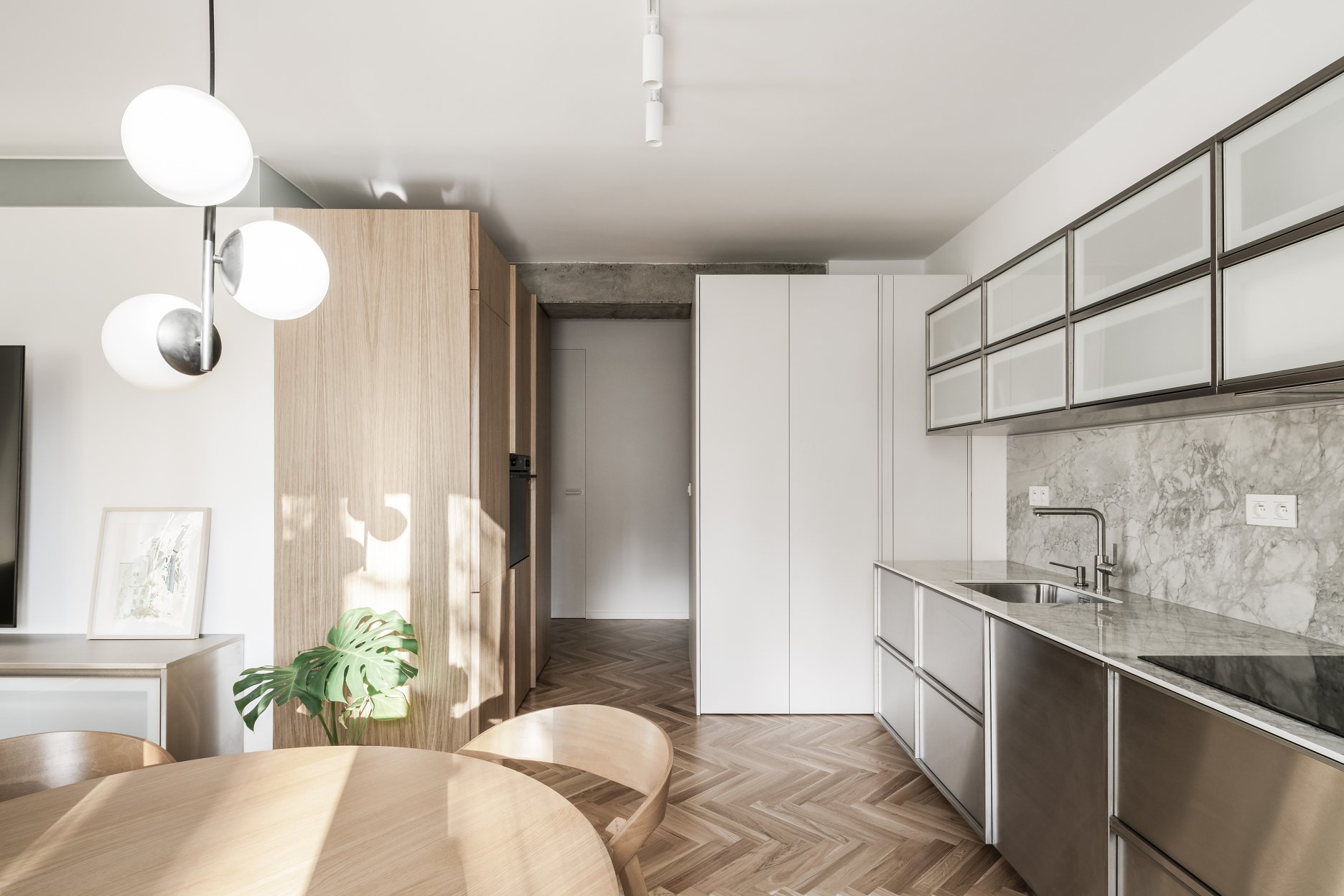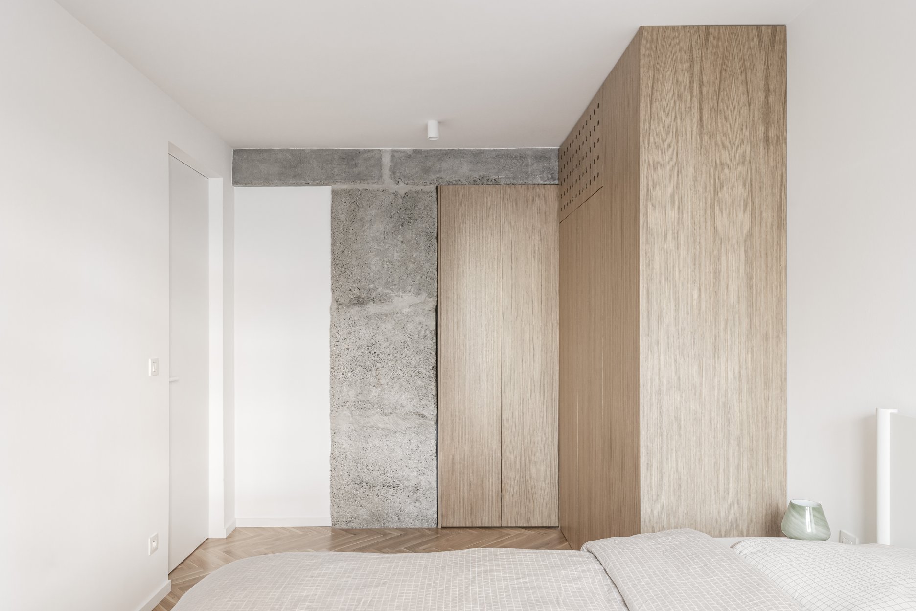 Rekonštrukcia bytu v Bratislave z dielne abrama architekti pracuje s kontrastom priznaných pôvodných konštrukcií a nových precíznych detailov. Priestor plynie okolo centrálneho kubusu hygienického zázemia, ktorý spolu s nosným systémom prirodzene definuje denné a nočné zónovanie bytu. Finálne architektonické riešenie formujú integrované úložné prvky, bezzárubňové dvere a nerezové akcenty, ktoré podčiarkujú surovosť betónu.