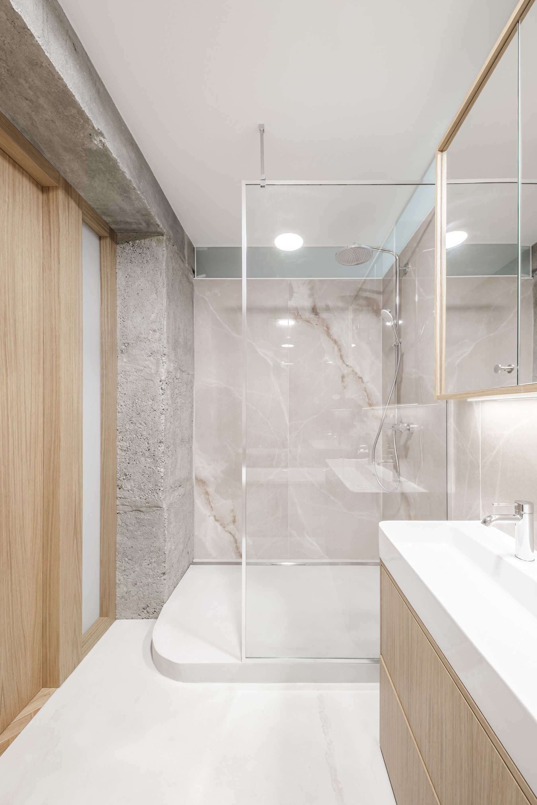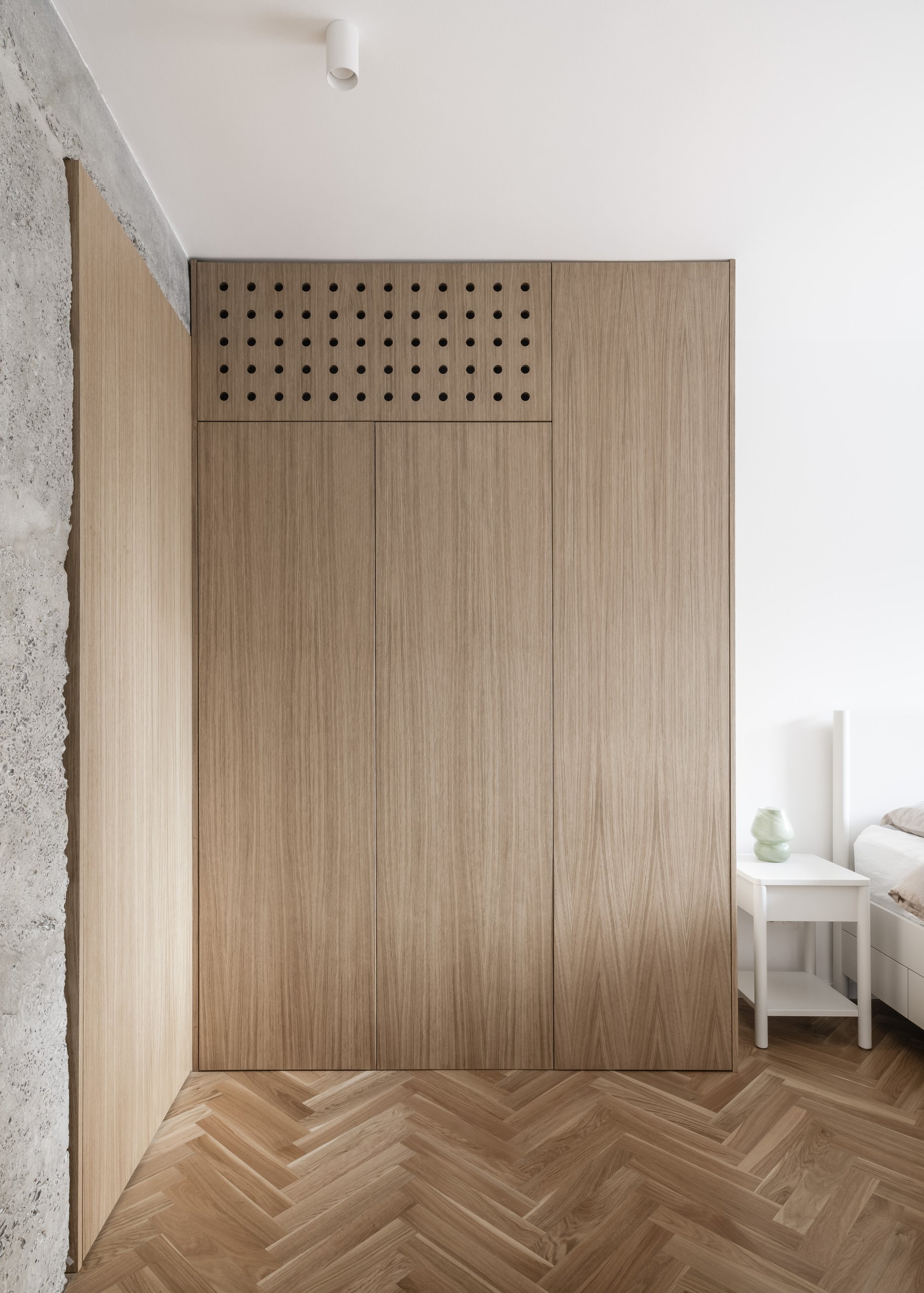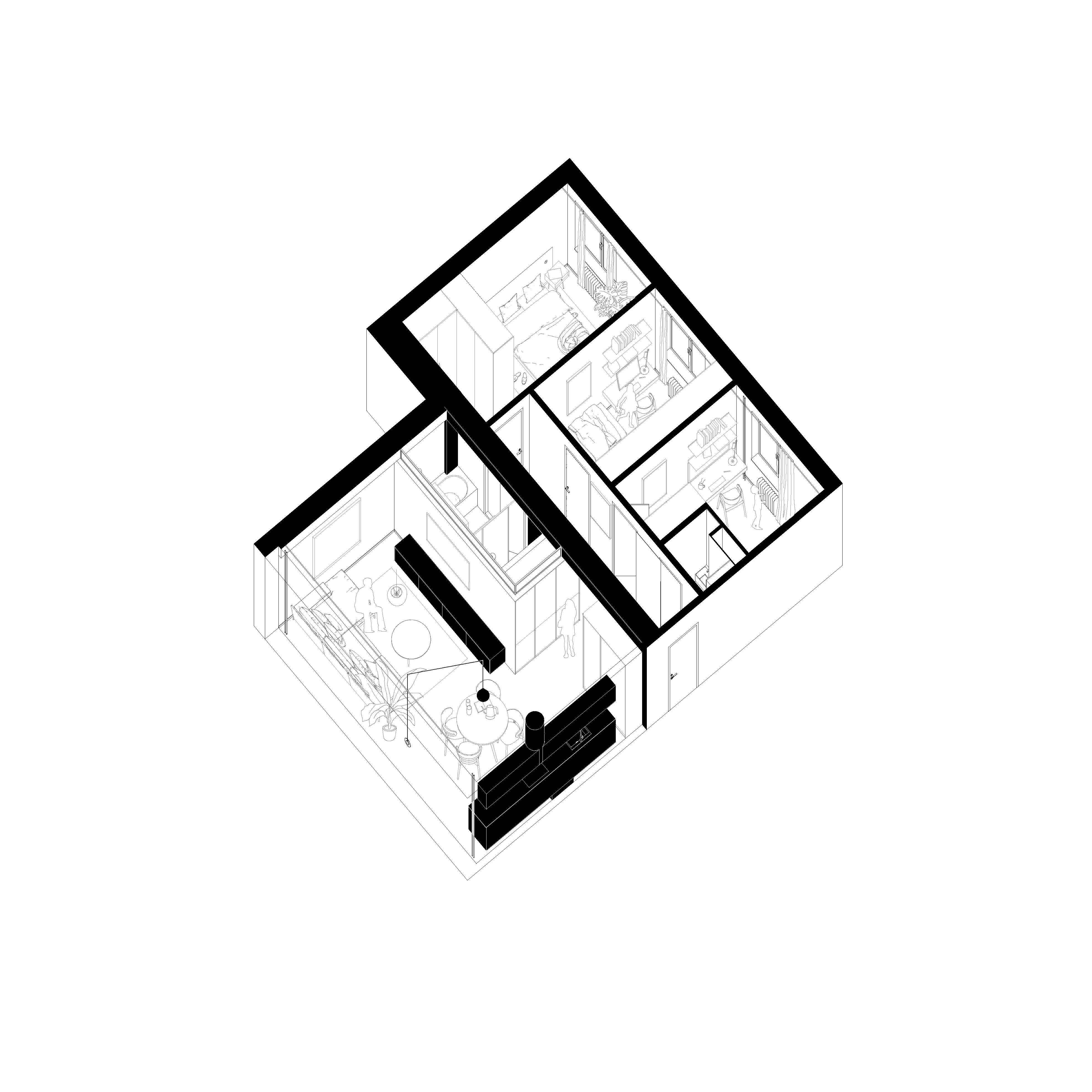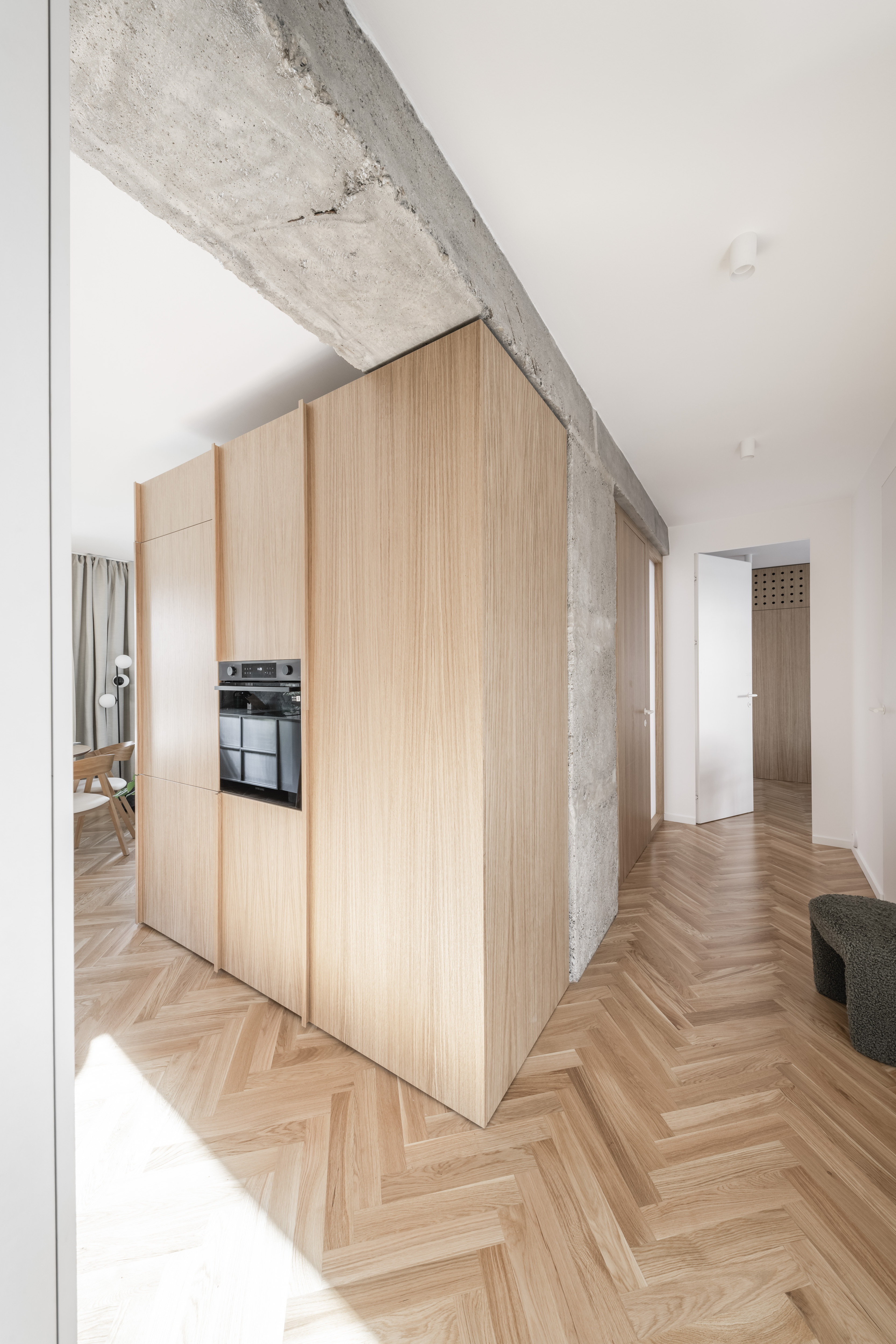 Dominantou bytu sa stáva centrálne umiestnený kubus obsahujúci hygienické zázemie v podobe kúpeľne. Tento prvok je od stropných konštrukcií odseparovaný svetlíkom, čo podčiarkuje jeho vloženie do priestoru. Celý centrálny systém je preseknutý obnaženým nosným systémom bytu tiahnucom sa po celej dispozícii. Tento výrazný moment nám priestor nerozdeľuje len esteticky, ale aj funkčne – na dennú spoločenskú časť (obývacia izba s kuchyňou) a nočnú/obytnú časť v podobe izieb a hygienického zázemia. Ako akcent podporujúci surovosť betónových konštrukcií vystupujú nábytkové zostavy realizované z nereze, napríklad kuchynská linka a TV zostava.