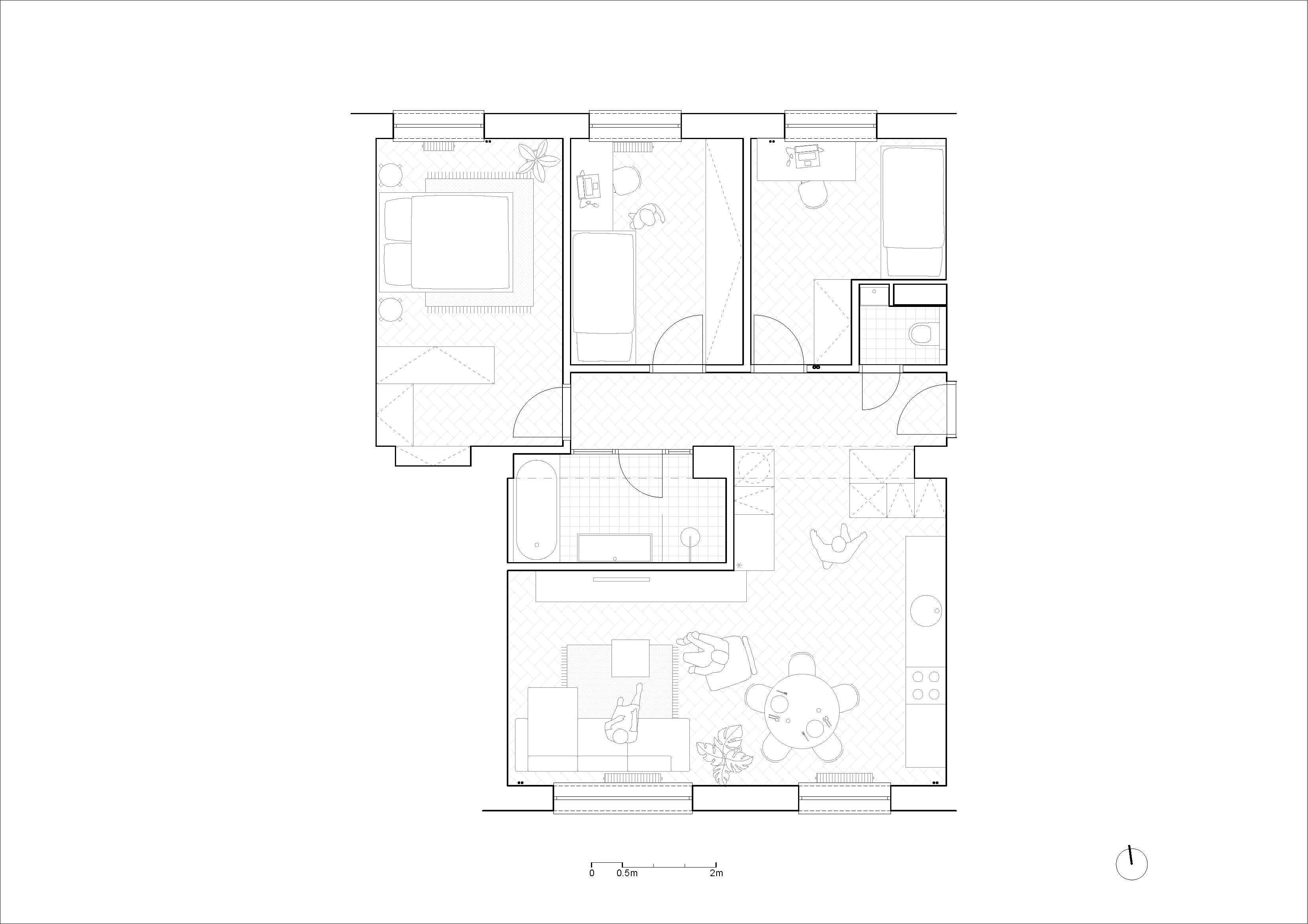 Pôvodnú, striktne definovanú dispozíciu rozdelenú na jednotlivé uzavreté miestnosti so slabším presvetlením obslužných priestorov vystriedal koncept otvoreného bývania. Odstránením bariér v podobe priečok vzniklo srdce bytu – denná zóna, ktorá je presvetlená, opticky zväčšuje priestor a vytvára otvorené miesto na trávenie spoločného času. Ďalšou veľkou zmenou bola úprava veľkosti izieb tak, aby v budúcnosti mohli plniť úlohu spálne a dvoch menších, rovnocenných izieb. Samozrejmosťou bolo aj zväčšenie kúpeľne, ktorej finálnou súčasťou je vaňa aj rozmerný sprchový kút.