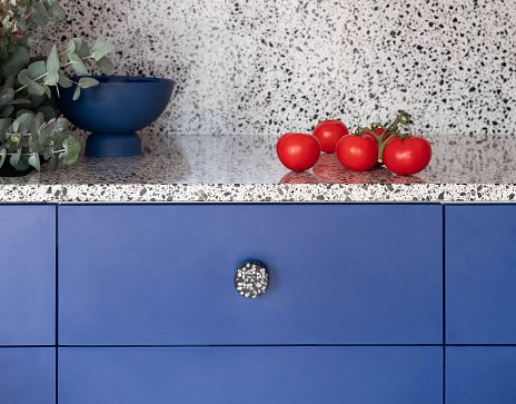 Úpravou dispozície v podobe presunu wc na úkor šatníka (obhájené motiváciou nakupovať menej) sa zjednotil hygienický blok a presvetlili aj vstupné, najhlbšie časti rohového bytu. Nafúknutý objem kuchyne maskuje jadrá a stĺpy na obvodovej stene, rozširuje pracovnú plochu do hĺbky. Spolu s ostrovom, okolo ktorého sa točí (a behá) väčšina denných aj večerných rituálov, supluje svojou aktivitou ukrojené metre obývačky.