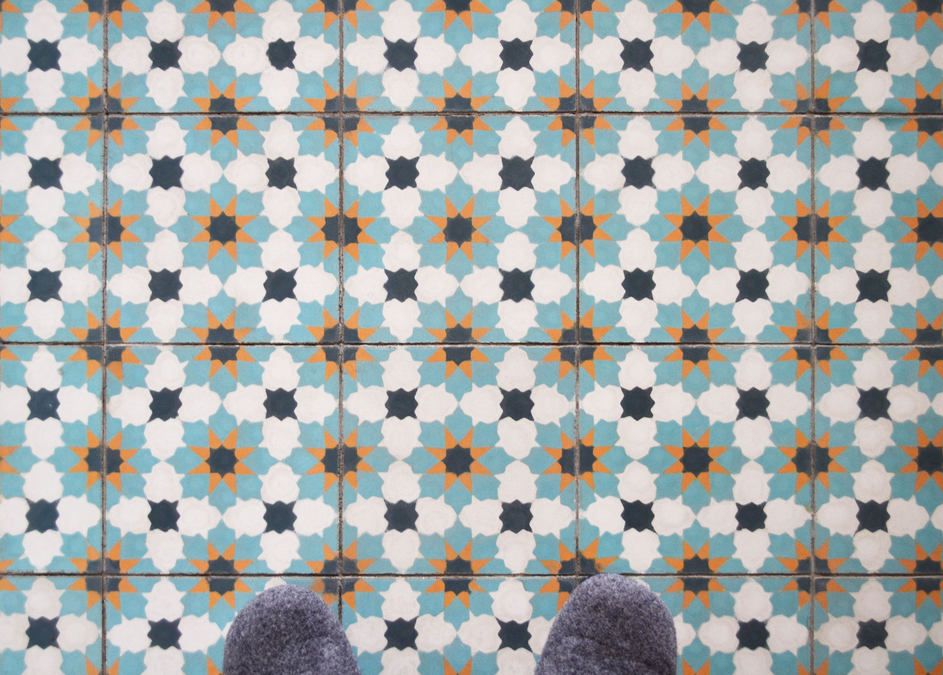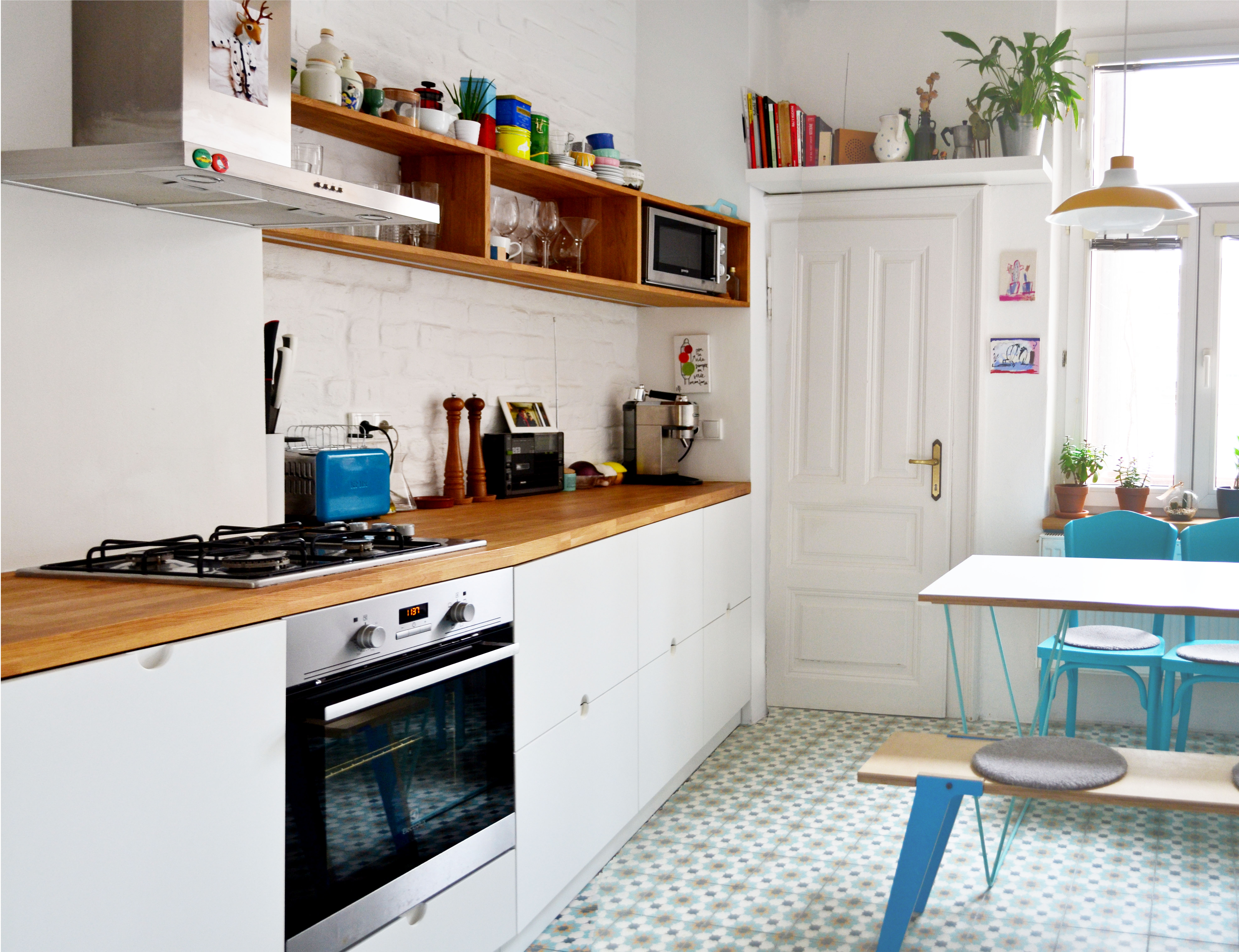 Cementové dlaždice s ornamentálnym vzorom, kuchynská linka zalomená k osteniu špajzových dverí, jednoduchá lavica a stôl so subtílnou kovovou podnožou...