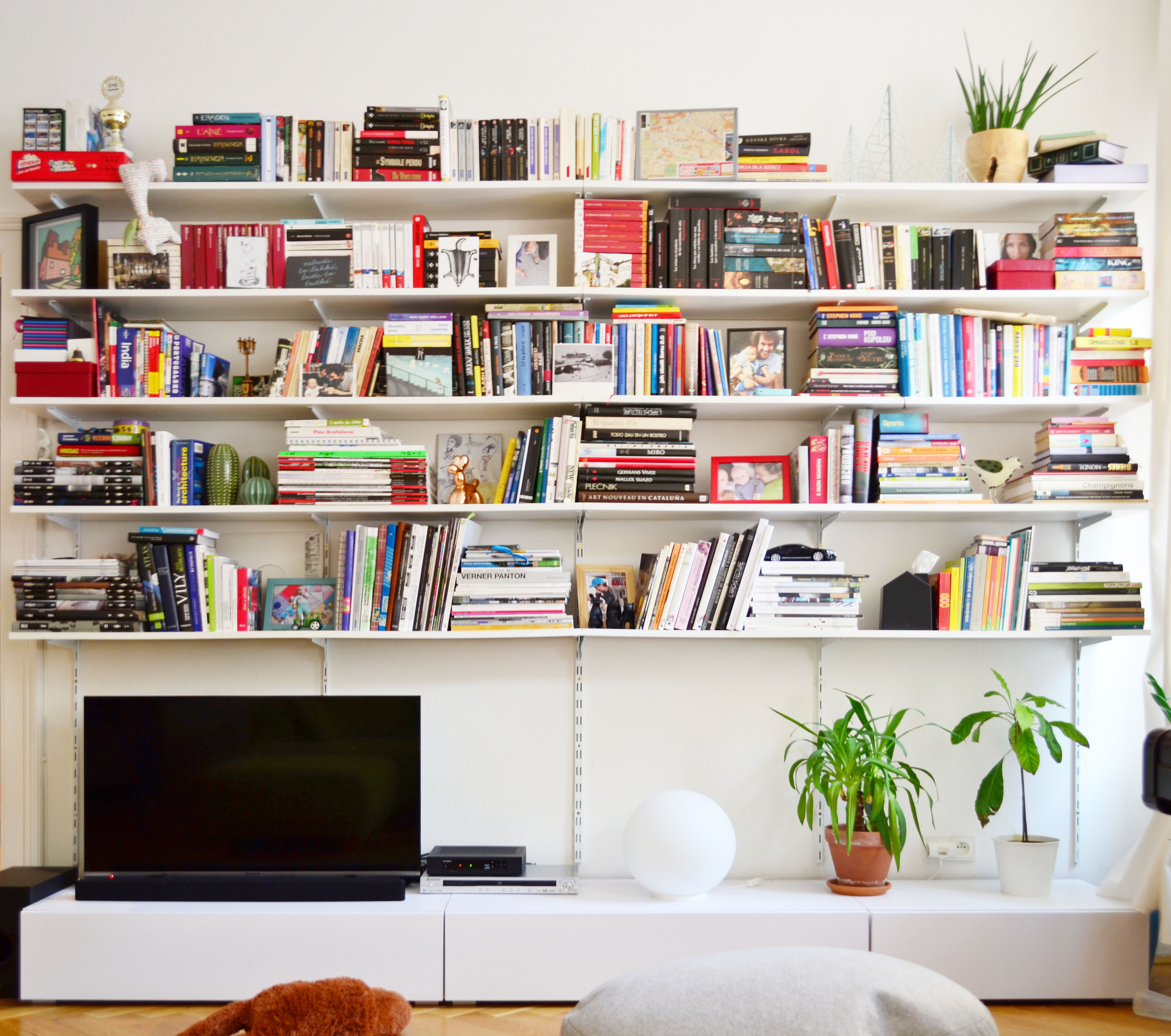 Variabilný policový systém, ktorý je využitý ako otvorená knižnica, ilustruje fokus na praktickú stránku veci.