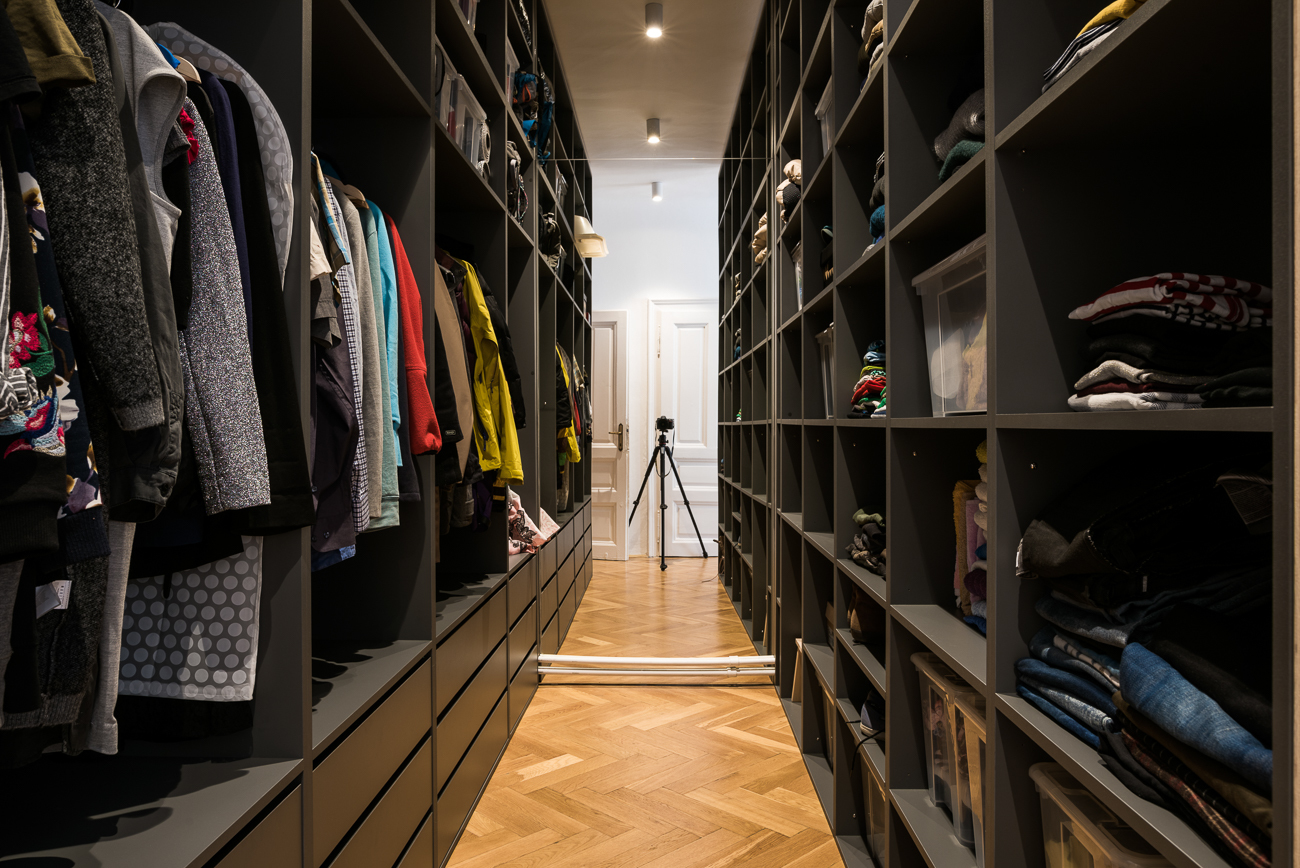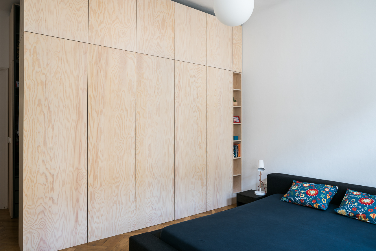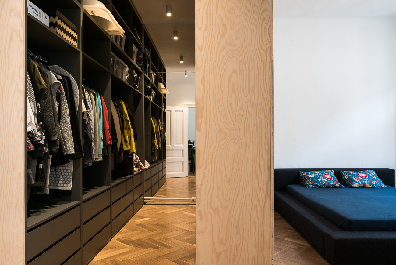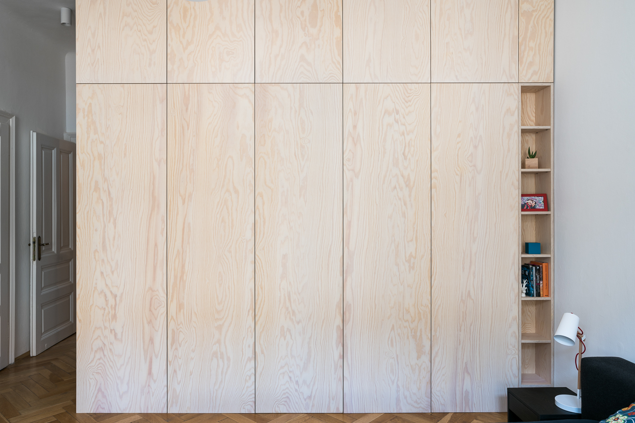 Šatník nepôsobí stiesnene aj vďaka zrkadlovej stene. Prírodnú farebnosť borovicovej preglejky strieda z vnútornej strany tmavé lamino.