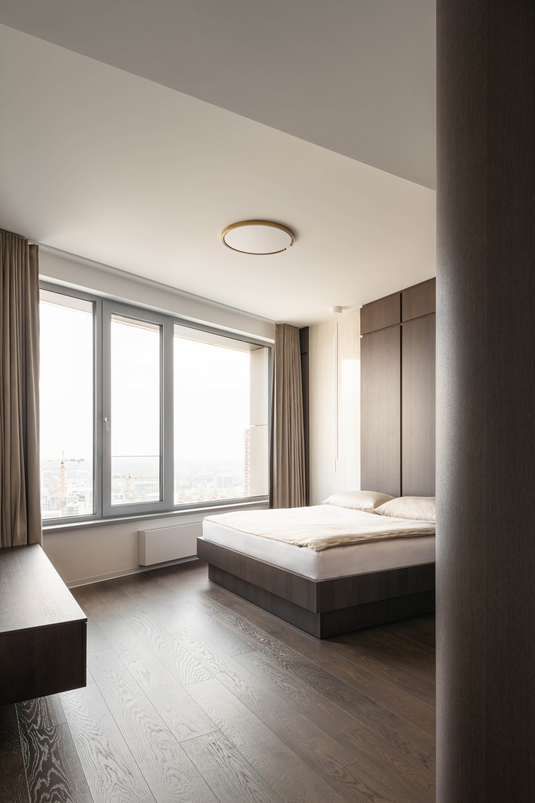 Byt ponúka množstvo priehľadov naprieč dispozíciou, umocnených hrou so zrkadlovými plochami. Ako akcent v interiéri pôsobí drevený obklad, prechádzajúci ako chrbtica naprieč celým priestorom.