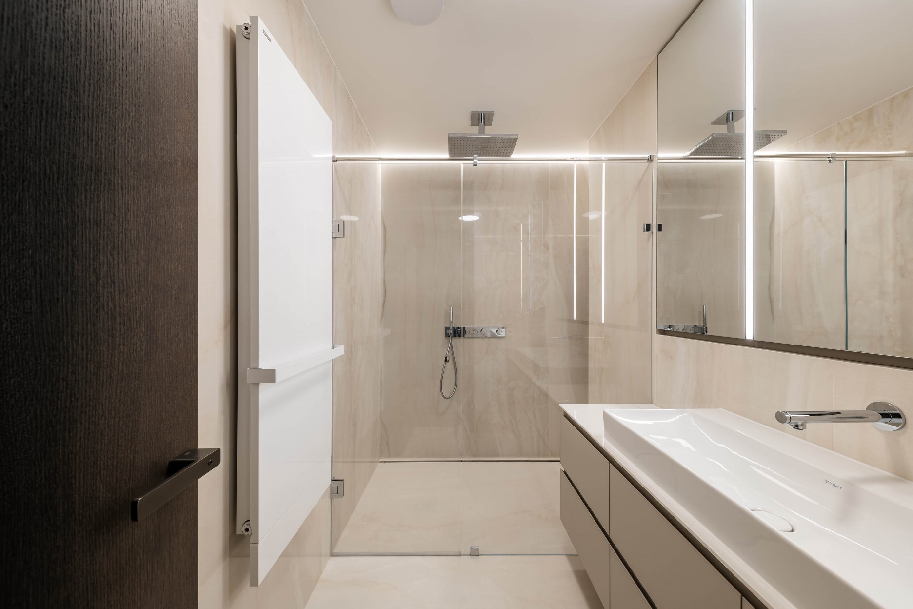 Materialita zvolená pre tento priestor korešponduje so zámerom vytvorenia uhladeného a reprezentatívneho priestoru, ktorý je zároveň praktický. Tmavšie odtiene prírodných materiálov – drevenej podlahy, dyhovaných obkladov a nábytku – dopĺňajú svetlé povrchy v hygienickom zázemí a kuchyni.
