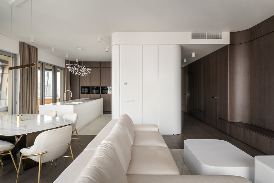 Architektonické riešenie bytu, vrátane organických fragmentov a voľby materiálov, vytvára rámec, ktorý vhodne zapadá do prostredia.