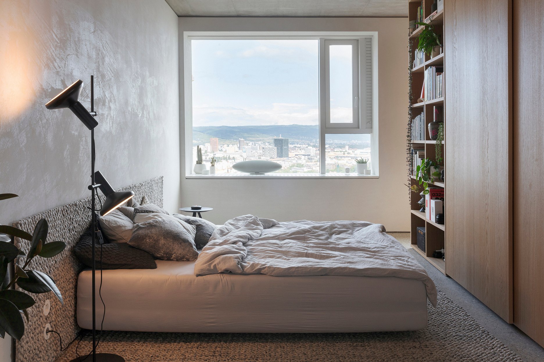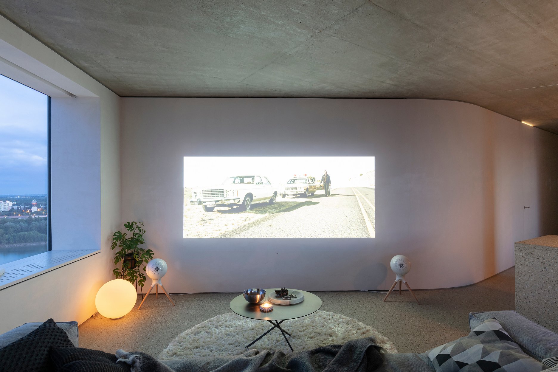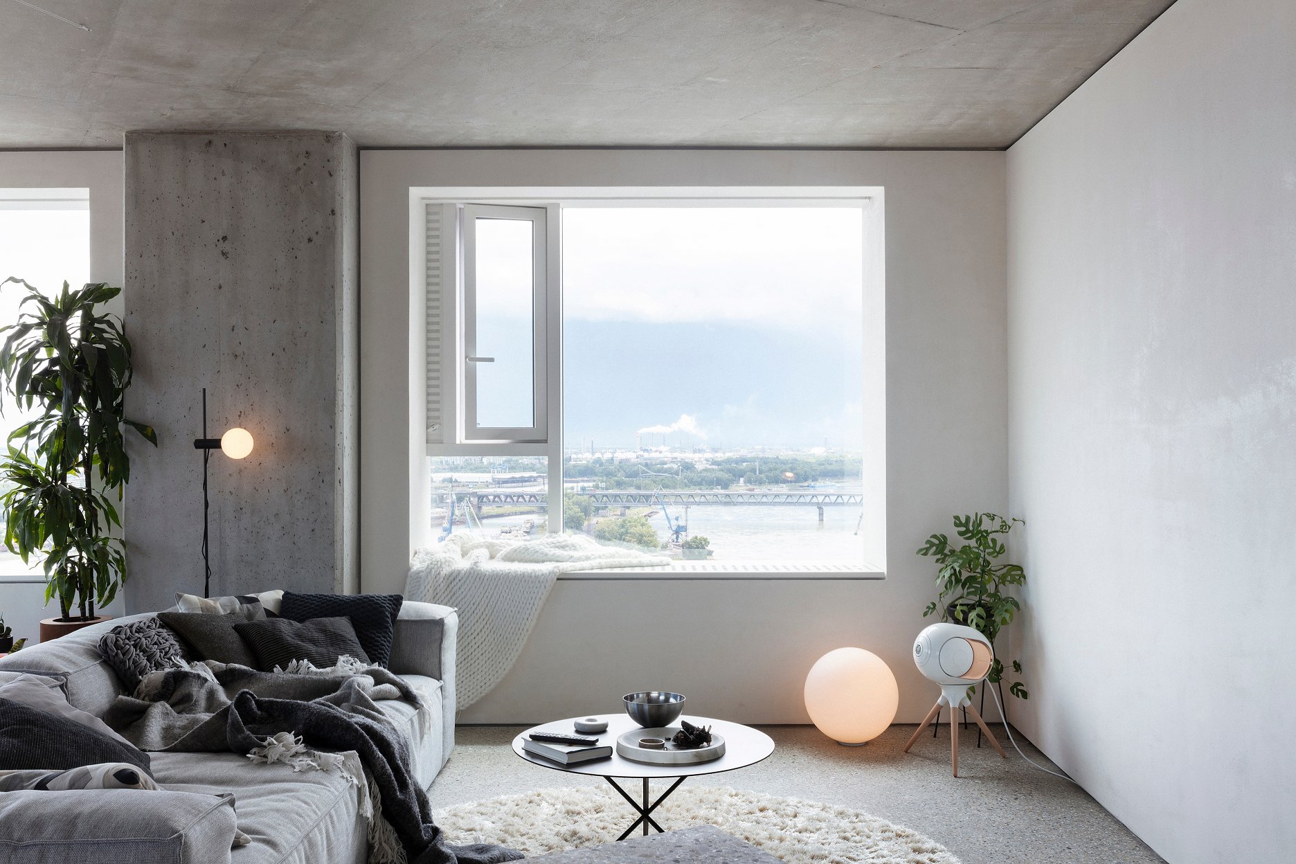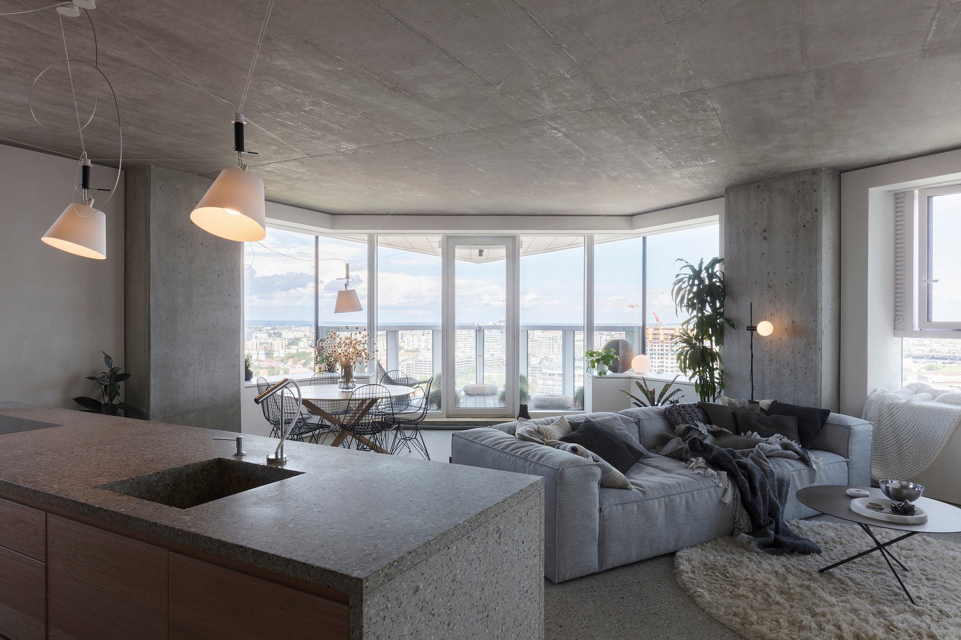 Interiér v jednom z dvojice vežiakov Panorama Towers. Architektom sa podarilo účelne využiť netradičný pôdorys bytu, vpísaný do trojuholníkovej obálky výškovej budovy.