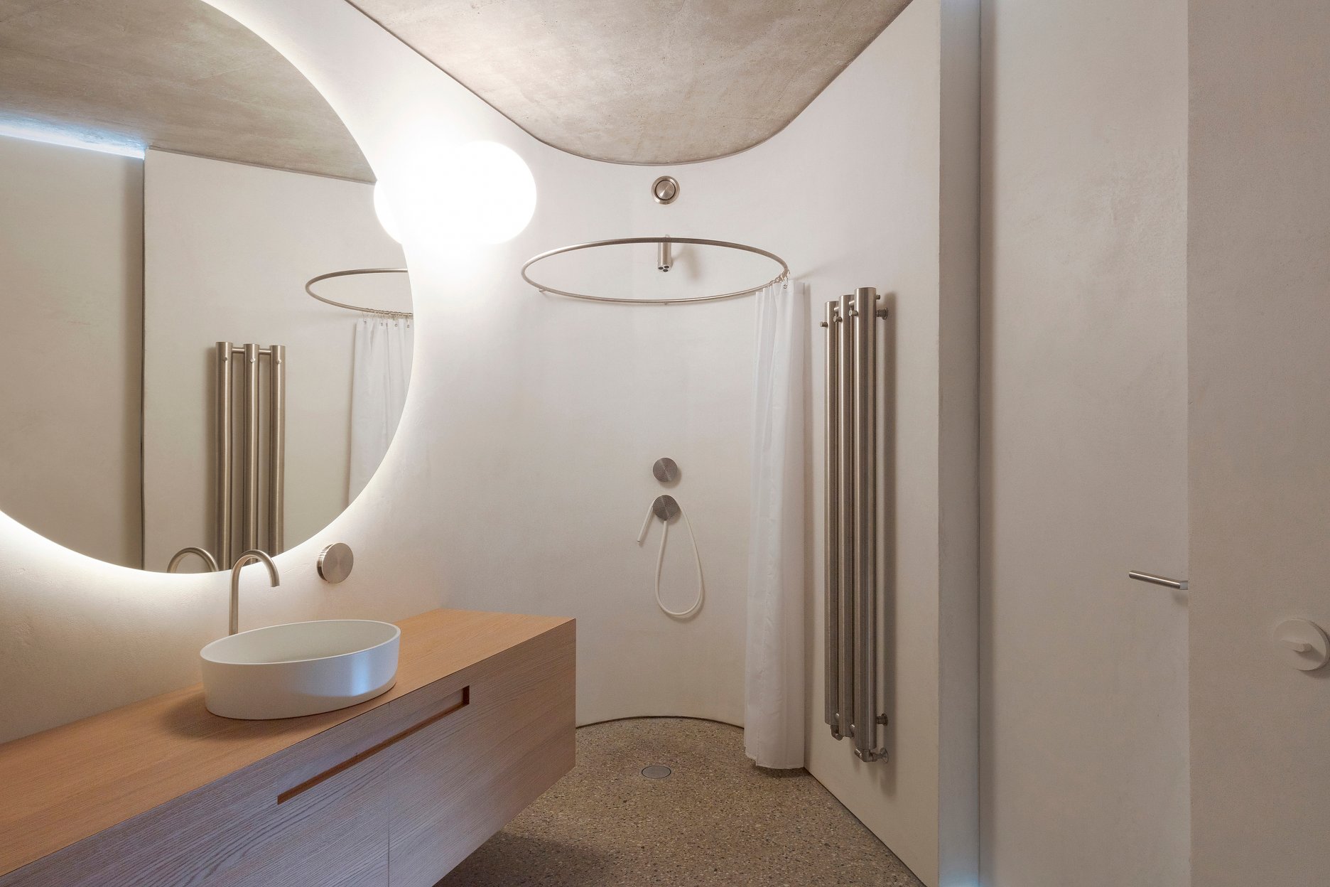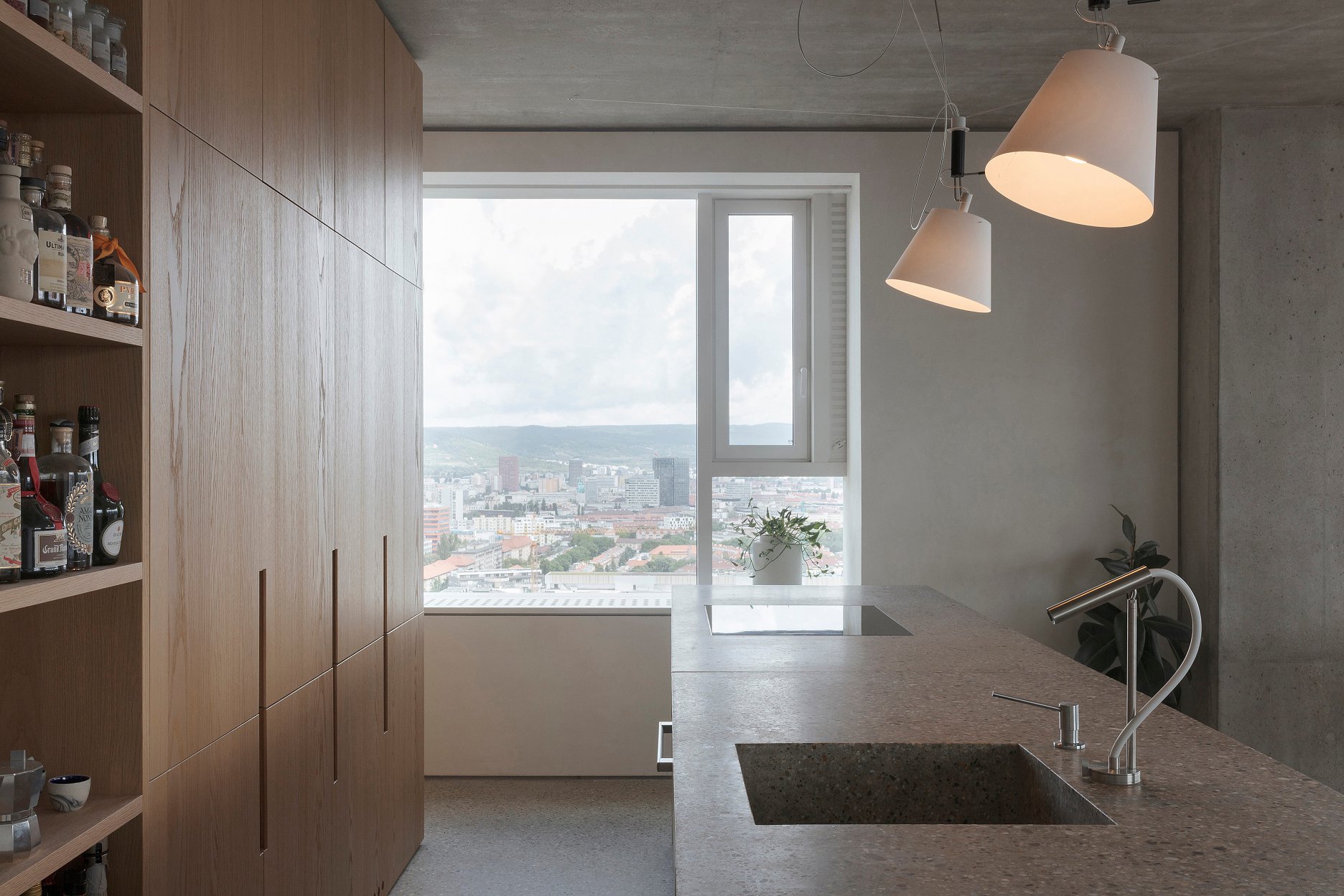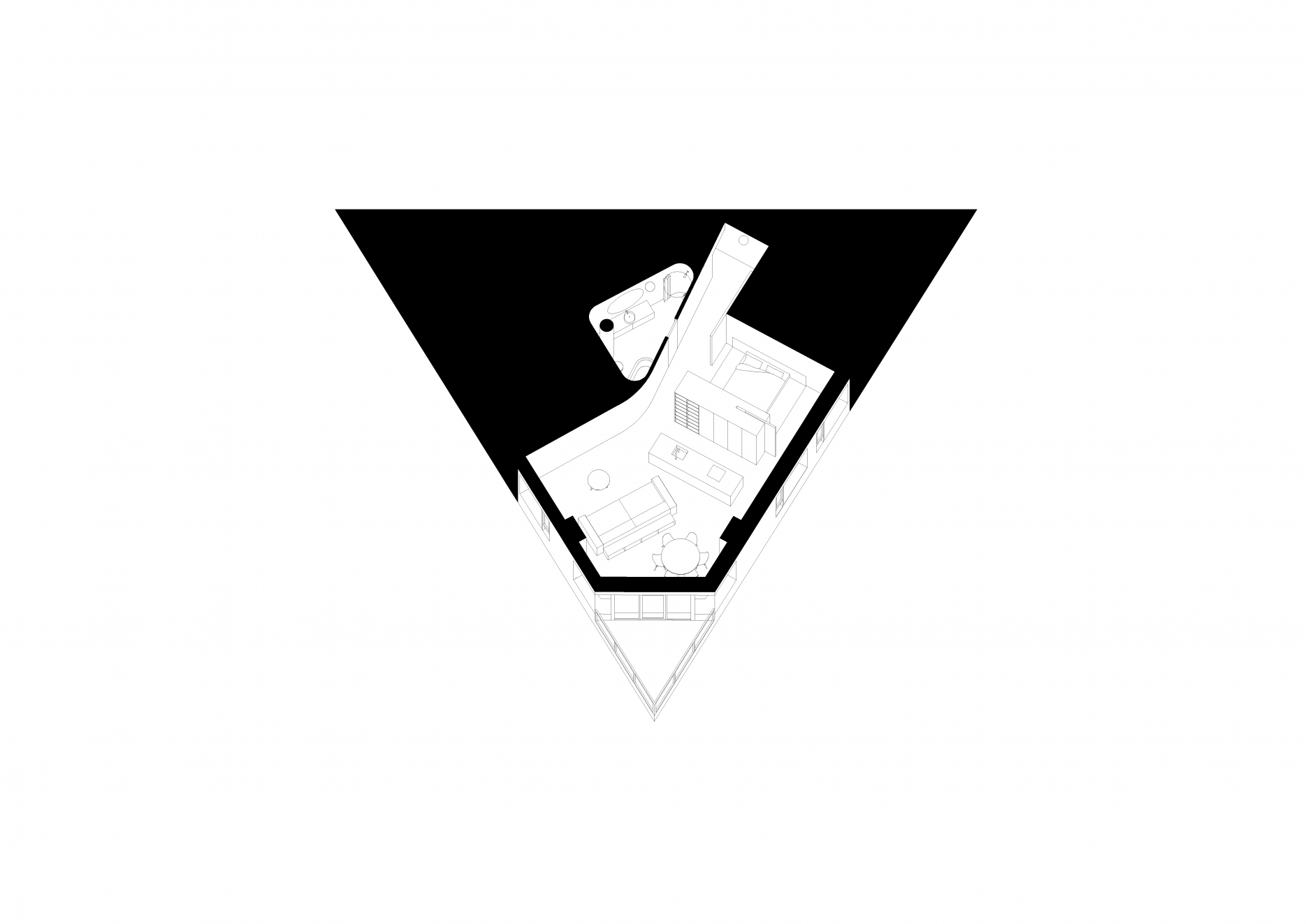 Interiér bytu je výsledkom snahy dosiahnuť konsenzus medzi nastavením štandardu developerského projektu a “neštandardu” predstavy o výsledku. Vzhľadom k tomu, že návrh nespĺňal žiadnu kategóriu klientských zmien bolo nutné docieliť skolaudovateľný kompromis. Jeho hlavnou ambíciou bolo v čo najväčšej miere zachovať materialitu hrubej stavby v celkovej koncepcii bytu. Zdanlivo komplikovaná pôvodná dispozícia sa tu ukázala ako veľmi tvárna a jedinečná. Do zdarilého výsledku konverzácie sú v samotnom riešení iba vkladané funkčné objekty odzrkadľujúce životný štýl používateľa.