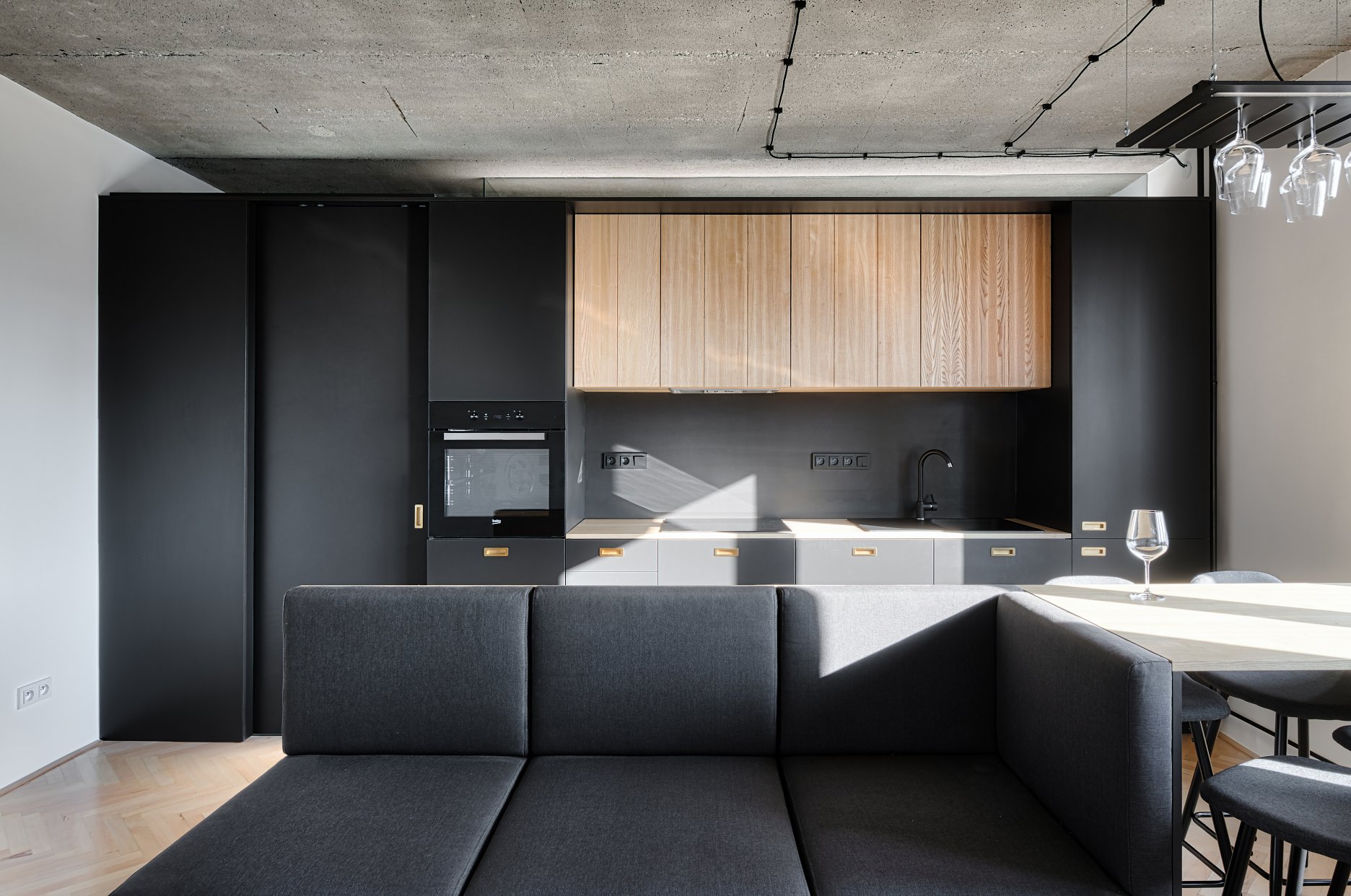 Záměr oddělit původní a nové výborně zapadl do požadavků klientky na menší “dvoupokojáč” s prostornější koupelnou v dominantní černé barvě.