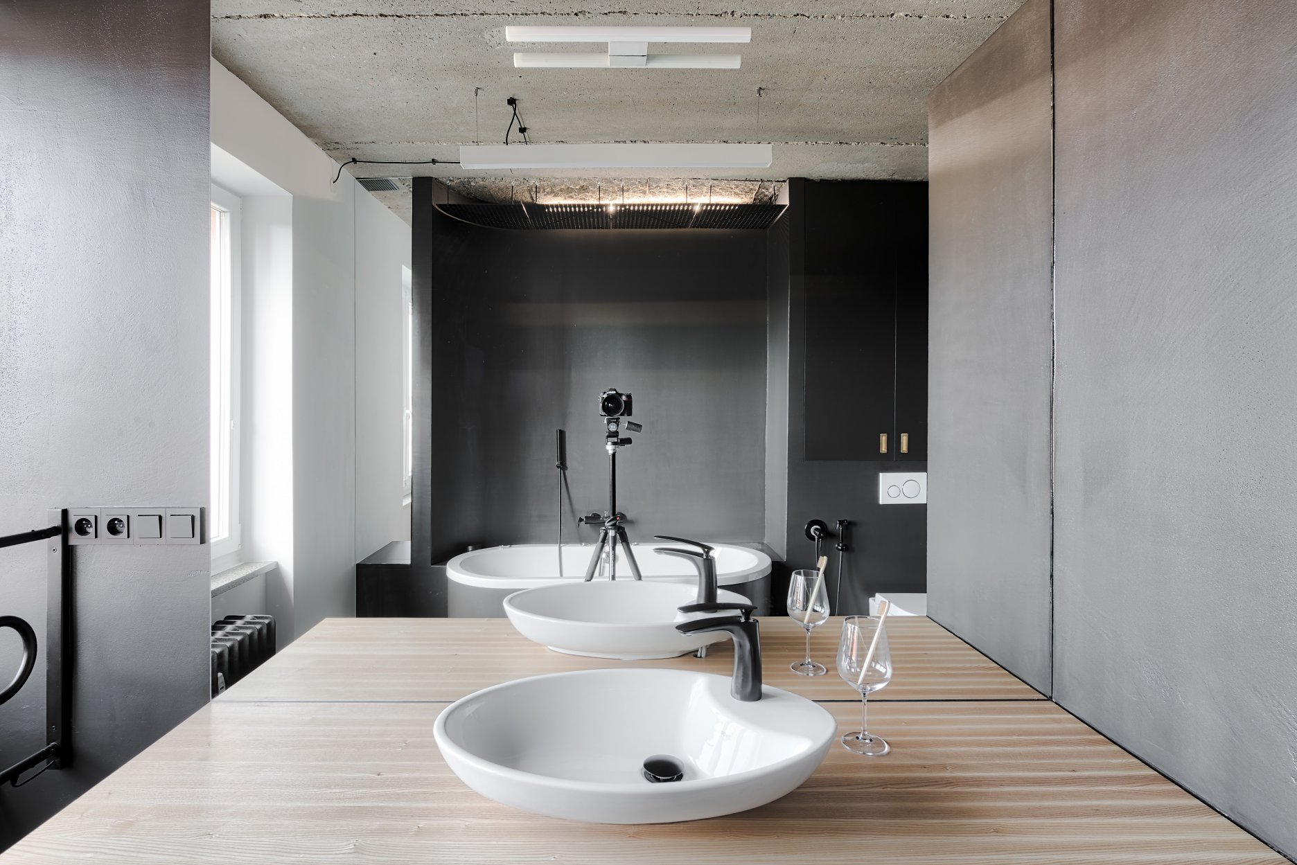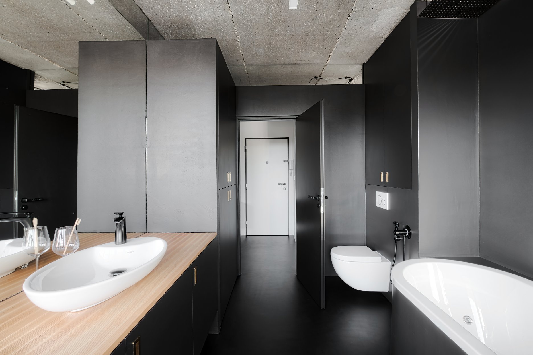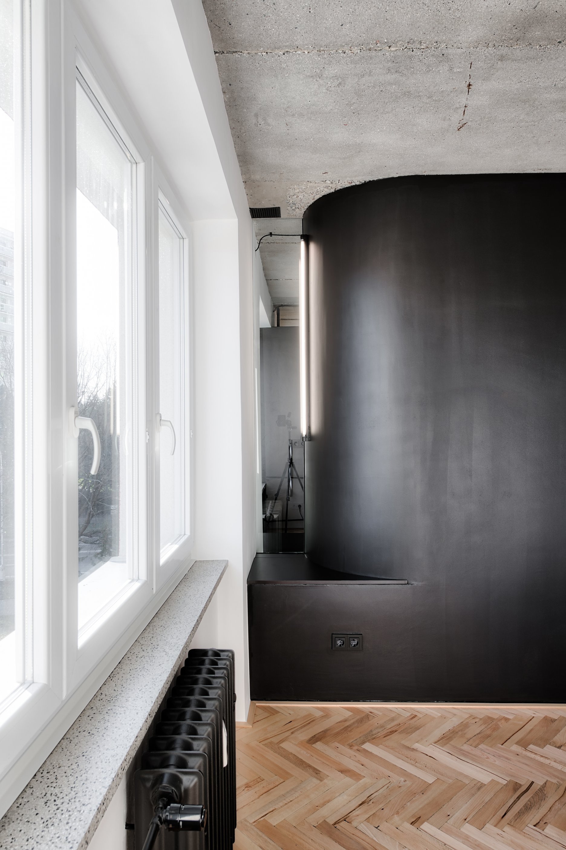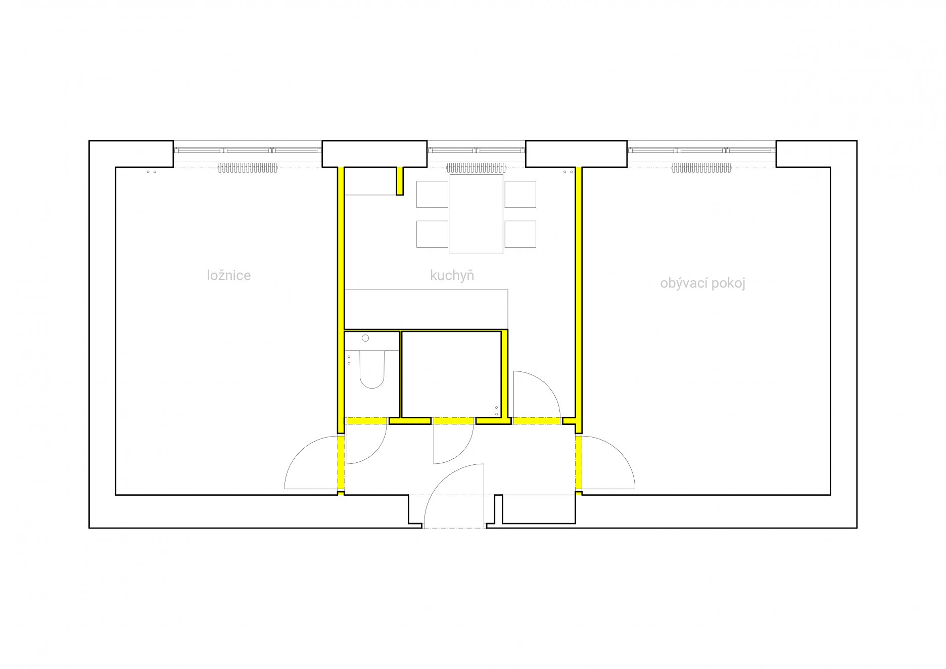 Již při první prohlídce jsme objevili kvality tohoto bytu, co se následně projevilo do takové míry, že bylo potřebné značně nahradit jenom centrální hygienické jádro. Původní členění na WC, koupelnu a kuchyň bylo sloučeno do spoločné, prostornější dispozice koupelny, která je pro jednoho uživatele komfortnější a kuchyňská linka je nově orientována do obývacího pokoje s místem pro stolování. Koupelna je následně ergonomicky tvarována dle činností, které v ní probíhají a daností panelové výstavby. Tím jsme taky do koupelny mohli přivést více přirozeného světla, které pak přes prosklení pod stropem dopadá až ke vstupu bytu, který byl původně bez přirozeného světla. Výsledek proto působí striktně a jednoduše.