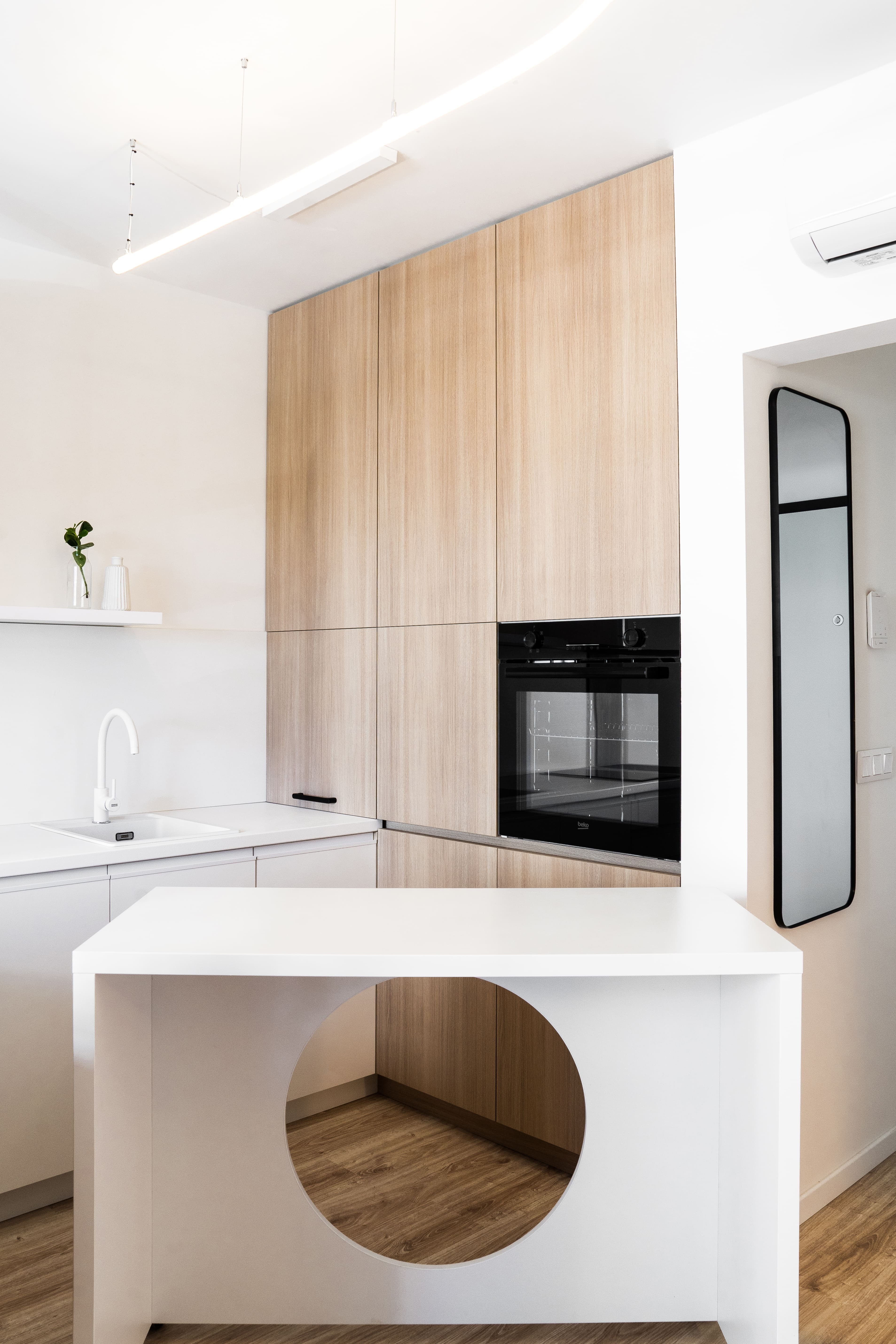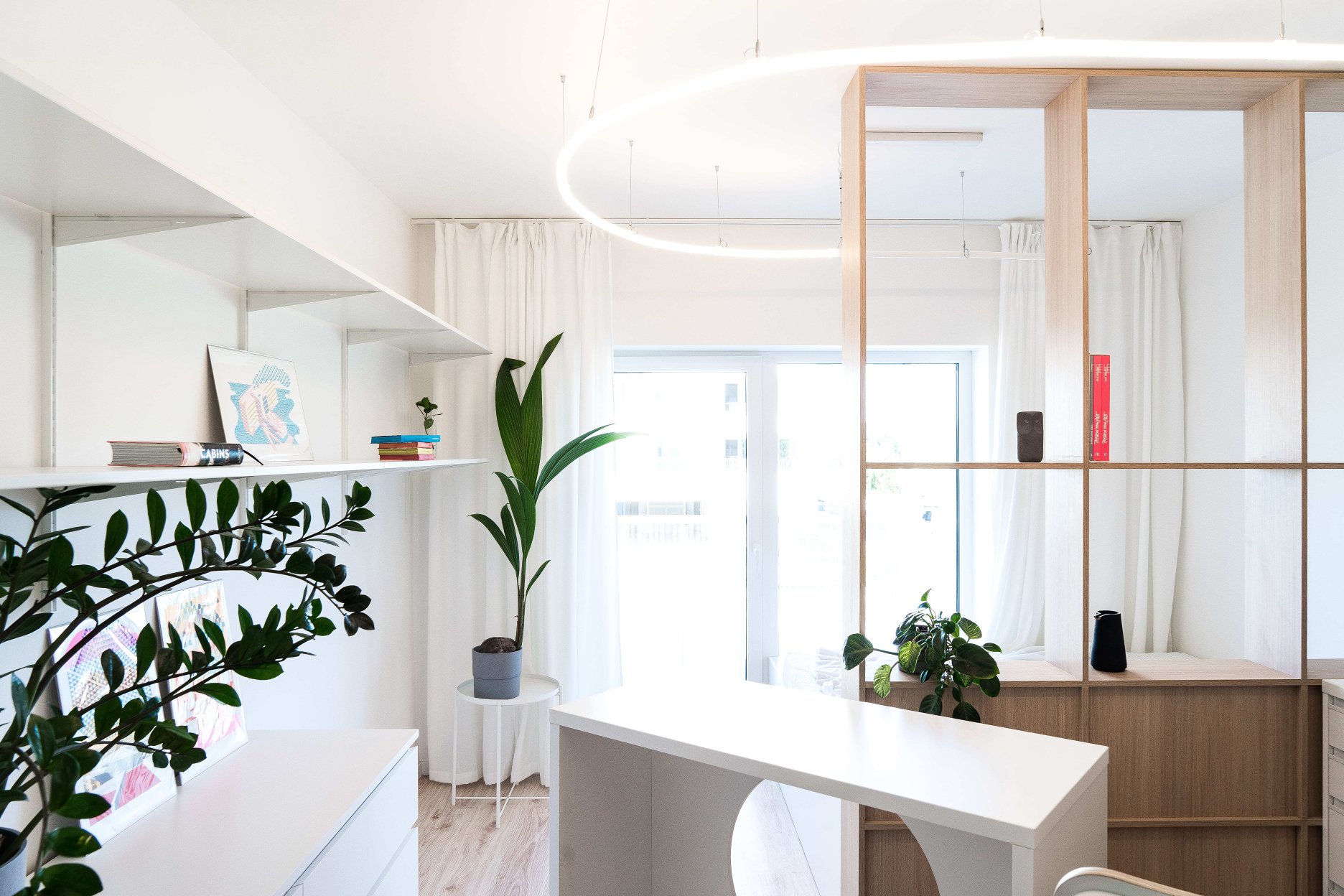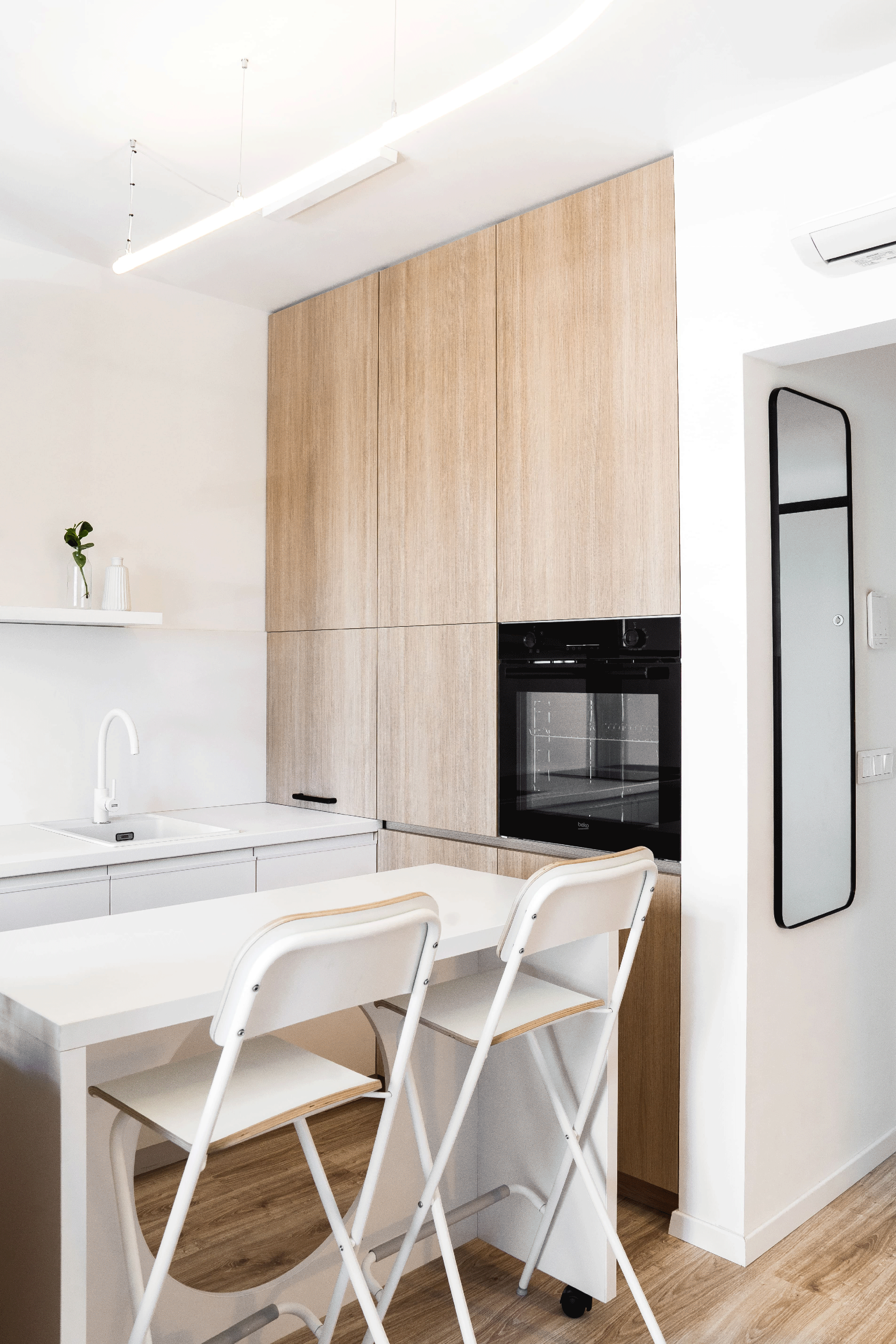 Kľúčovým prvkom interiéru je mobilný pracovný stôl na kolieskach, ktorý slúži ako kuchynský ostrovček, barové sedenie aj miesto na prácu. Tento multifunkčný prvok člení dispozíciu a zároveň do priestoru vnáša potrebnú flexibilitu. Dopĺňa ho jemné lineárne svietidlo zavesené na subtílnej lankovej konštrukcii, ktoré prepája kuchynskú časť s nočnou zónou.