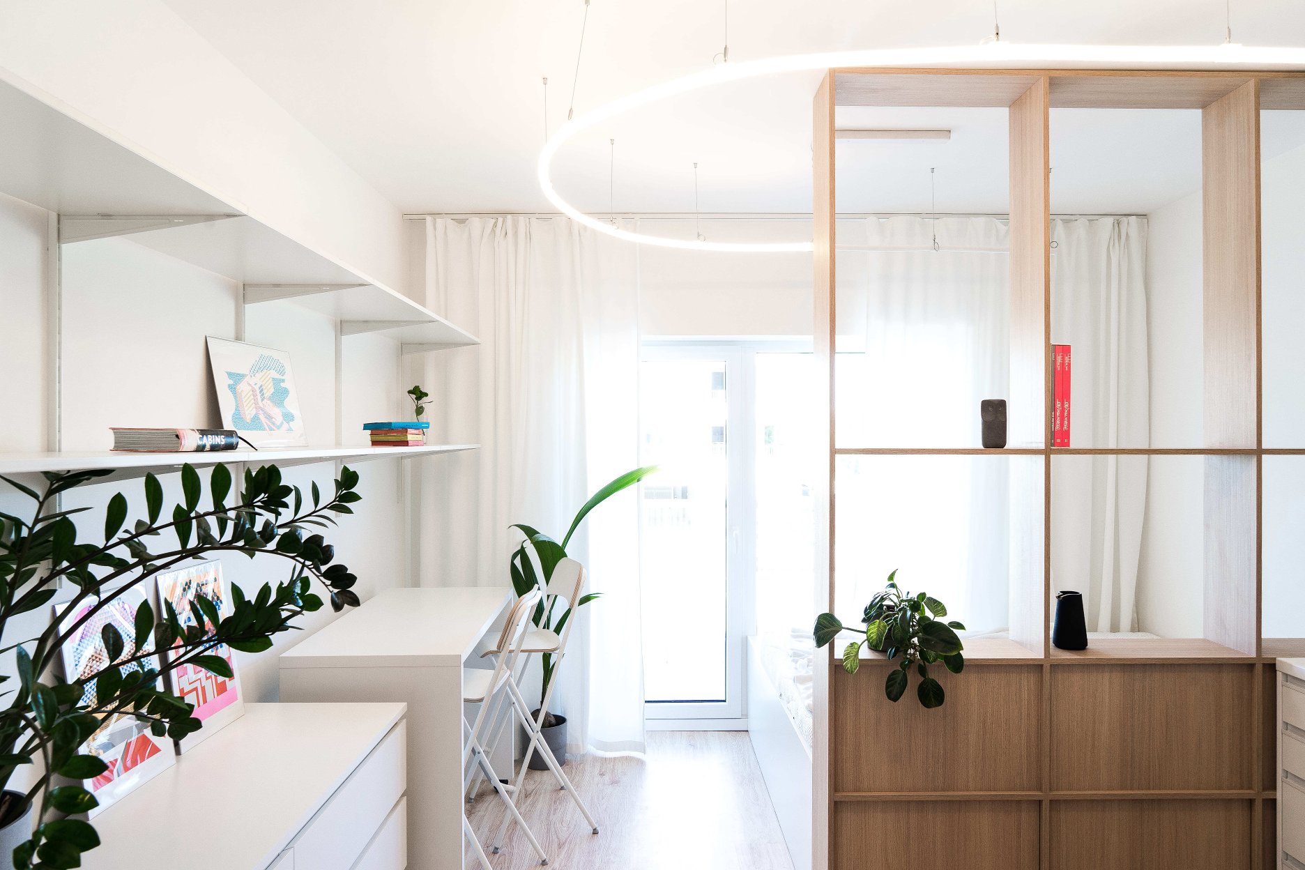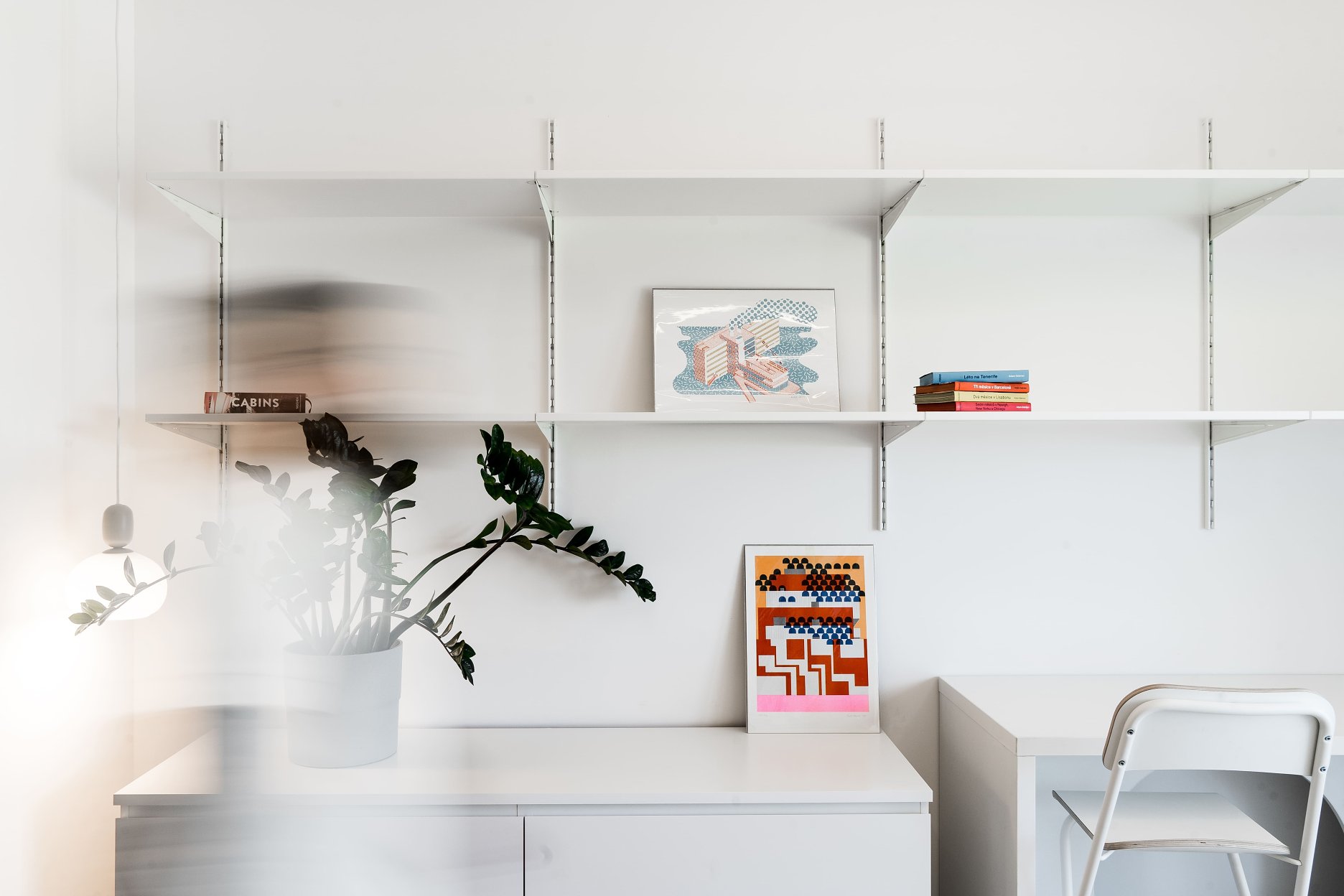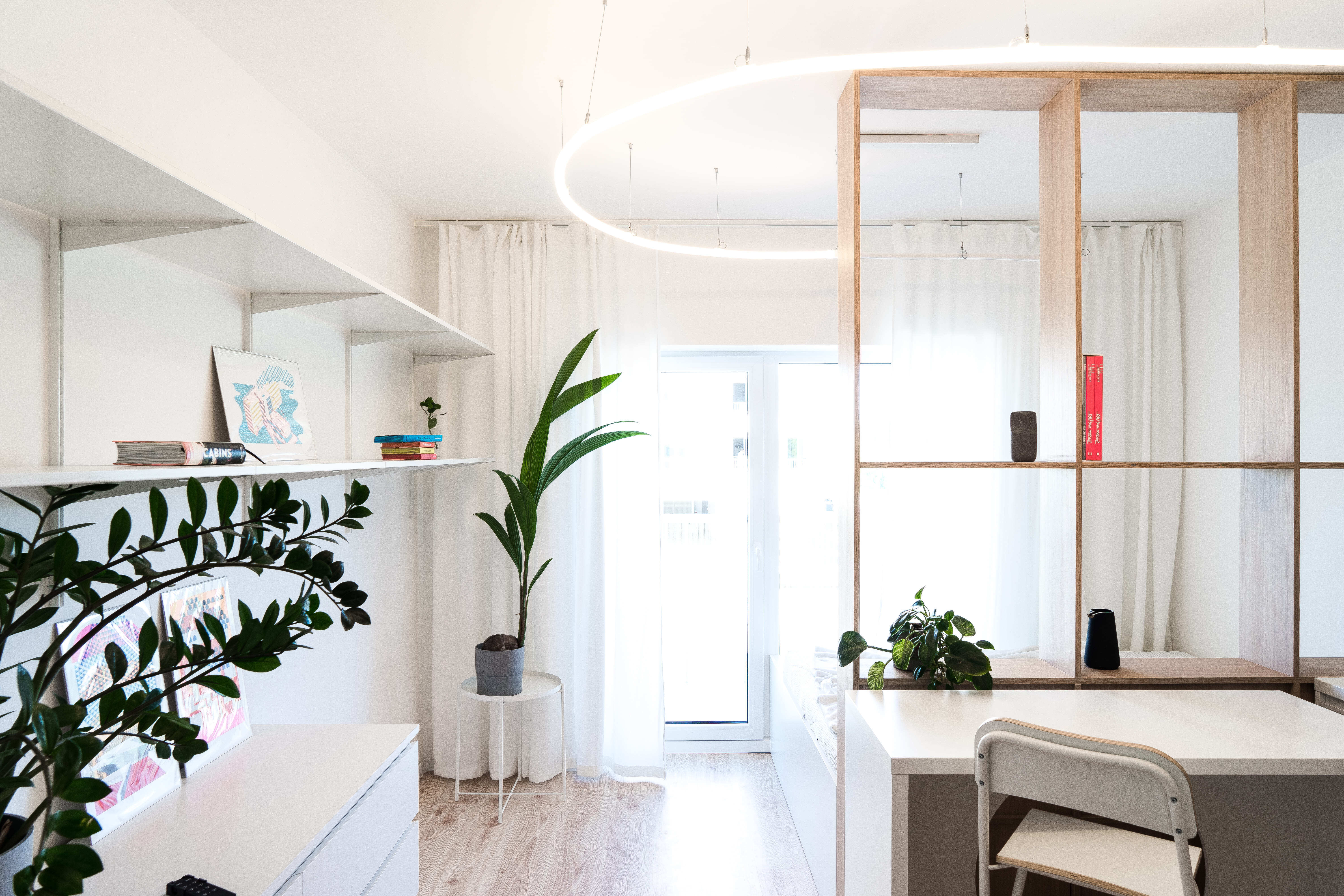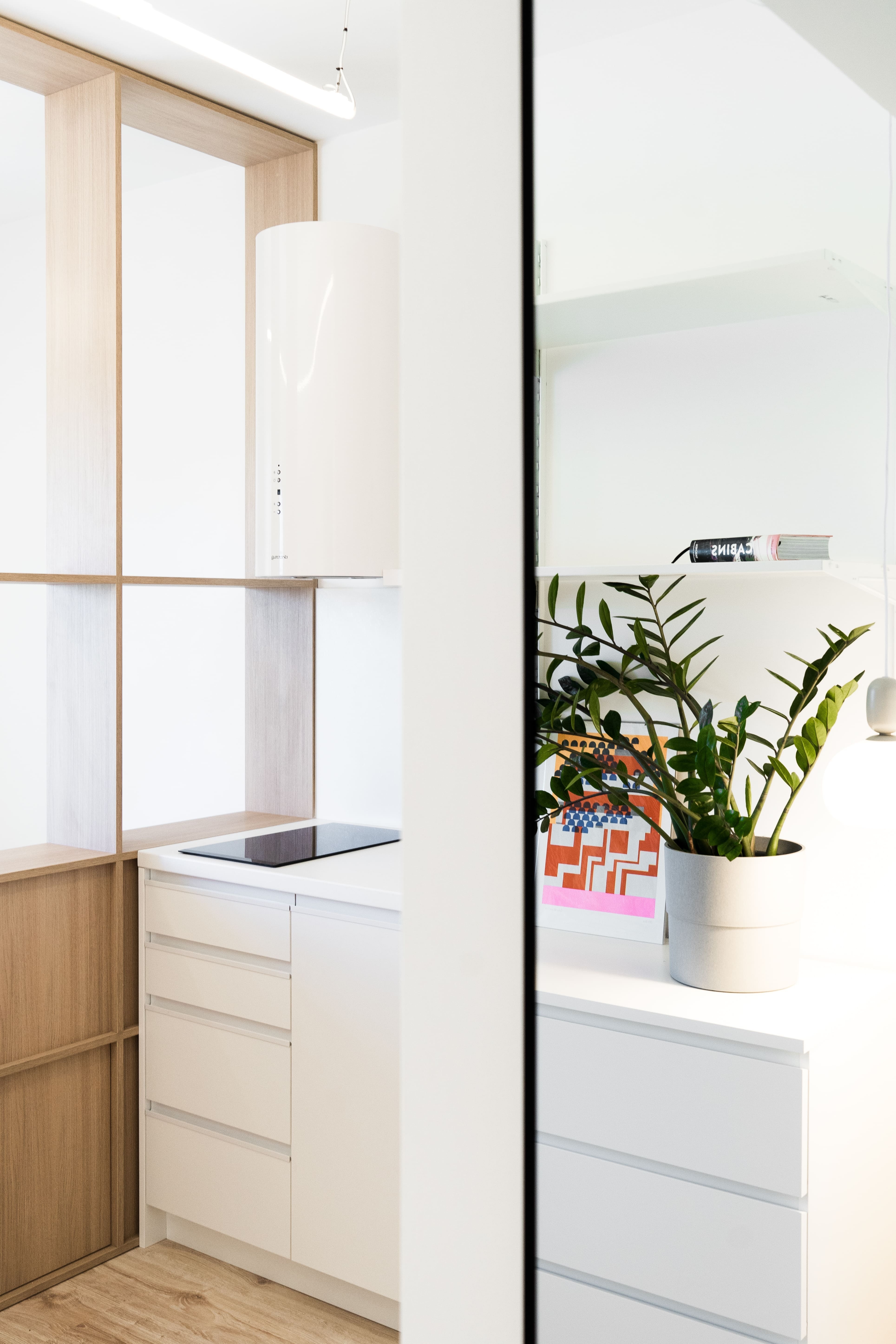 Kľúčovým prvkom interiéru je mobilný pracovný stôl na kolieskach, ktorý slúži ako kuchynský ostrovček, barové sedenie aj miesto na prácu. Tento multifunkčný prvok člení dispozíciu a zároveň do priestoru vnáša potrebnú flexibilitu. Dopĺňa ho jemné lineárne svietidlo zavesené na subtílnej lankovej konštrukcii, ktoré prepája kuchynskú časť s nočnou zónou.