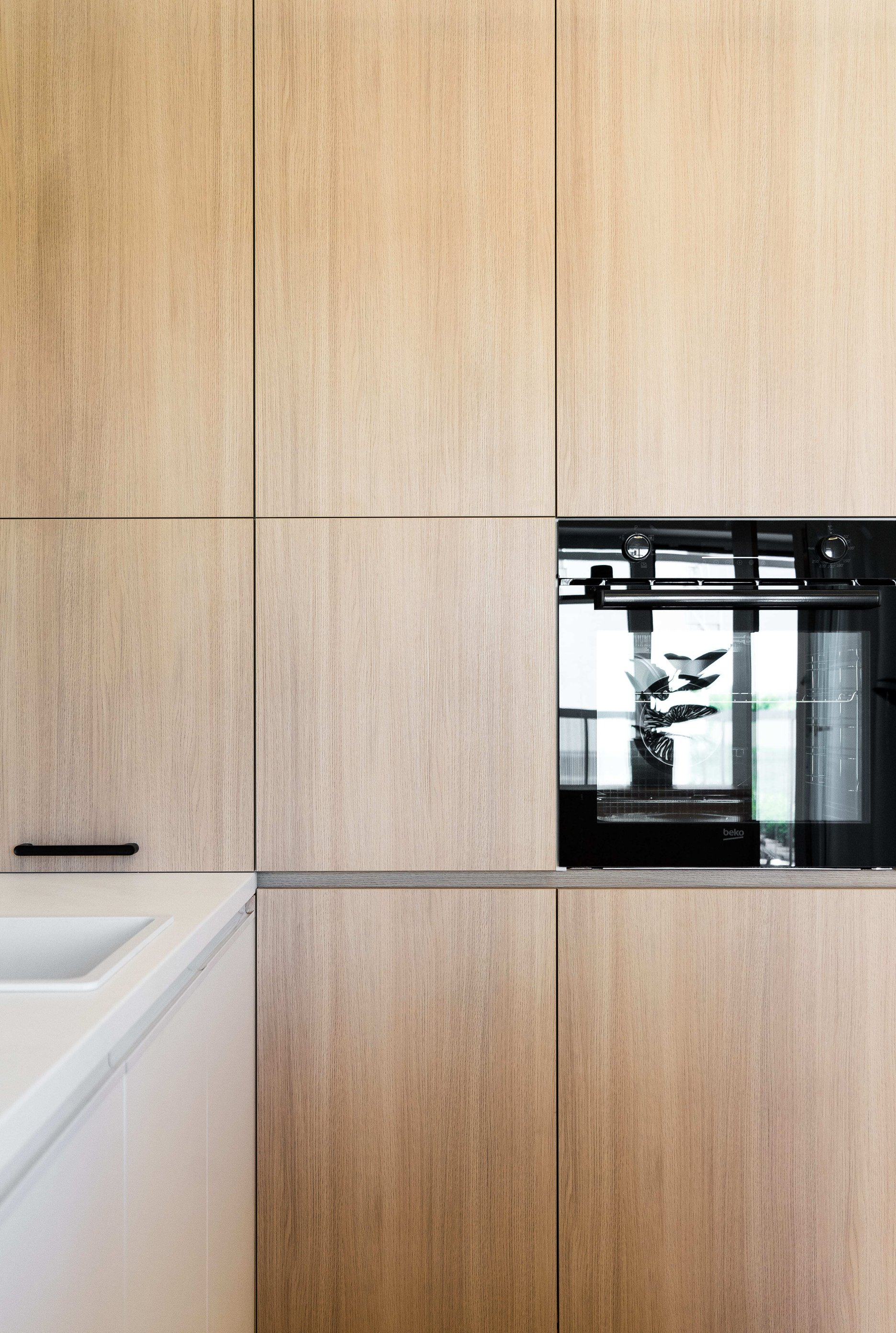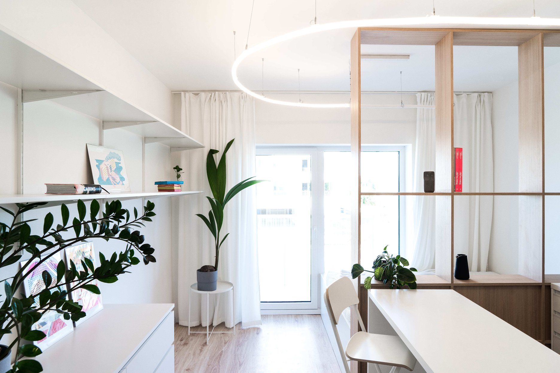 Farebné a materiálové riešenie je založené na svetlých tónoch. Biela v kombinácii s dekorom prírodného dreva priestor zjemňuje a umocňuje pocit vzdušnosti. Nábytok je navrhnutý úsporne, bez zbytočných vizuálnych nánosov, pričom každý prvok má jasnú funkciu. Dôraz na funkčnosť umožnil využiť obmedzený priestor bytu.