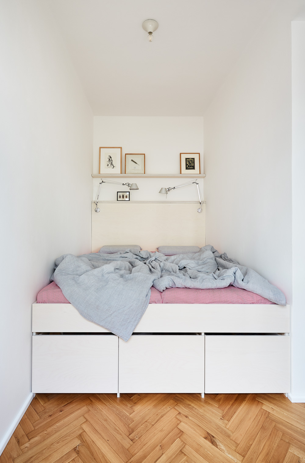 V novej spálni je tiež rozkladací stôl na šitie a plytká skriňa na látky. Pod vysokou posteľou je ďalší úložný priestor, práve na šijacie stroje. Vďaka tomuto rozhodnutiu o malej spálni sa dispozícia zjednodušila a zprehľadnila.