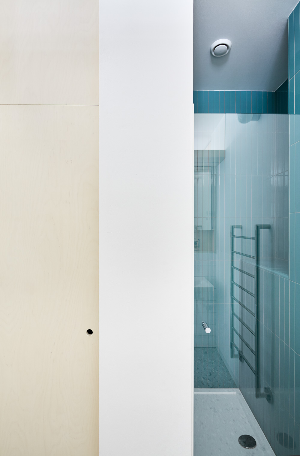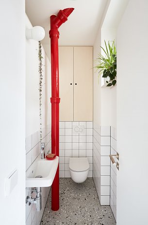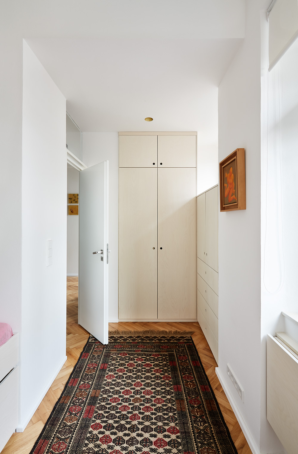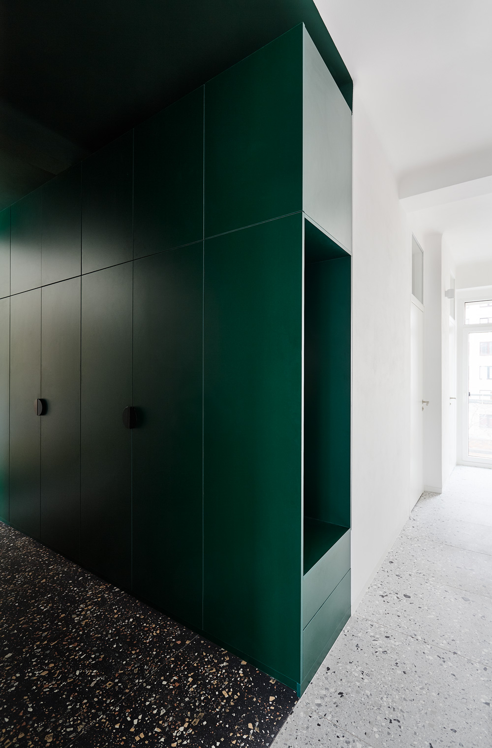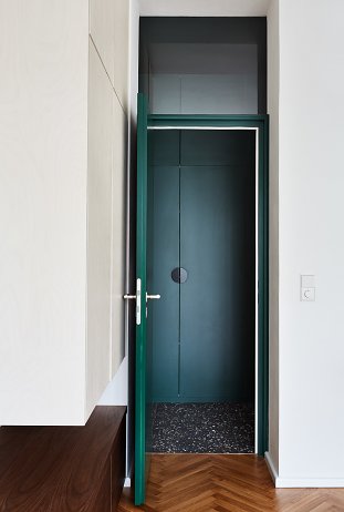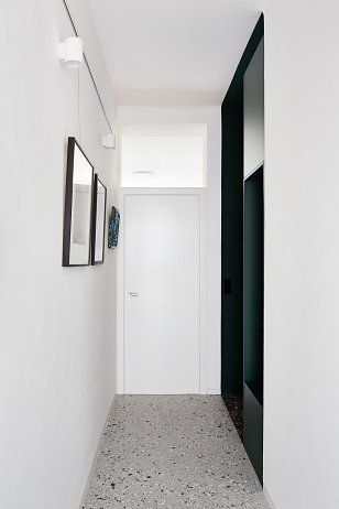 Šatníková skriňa, spolu so zeleným náterom, vytvorila v priestore prstenec - farebný tunel, ktorý sa stal dominantným prvkom bytu. Nová dlažba v chodbe a kúpeľni s toaletou podčiarkuje výber materiálov nábytku. K svetlosivým veľkoformátovým dlaždiciam patrí bielená preglejka a zelené lamino dopĺňa antracitová dlažba v rovnakom dekore.