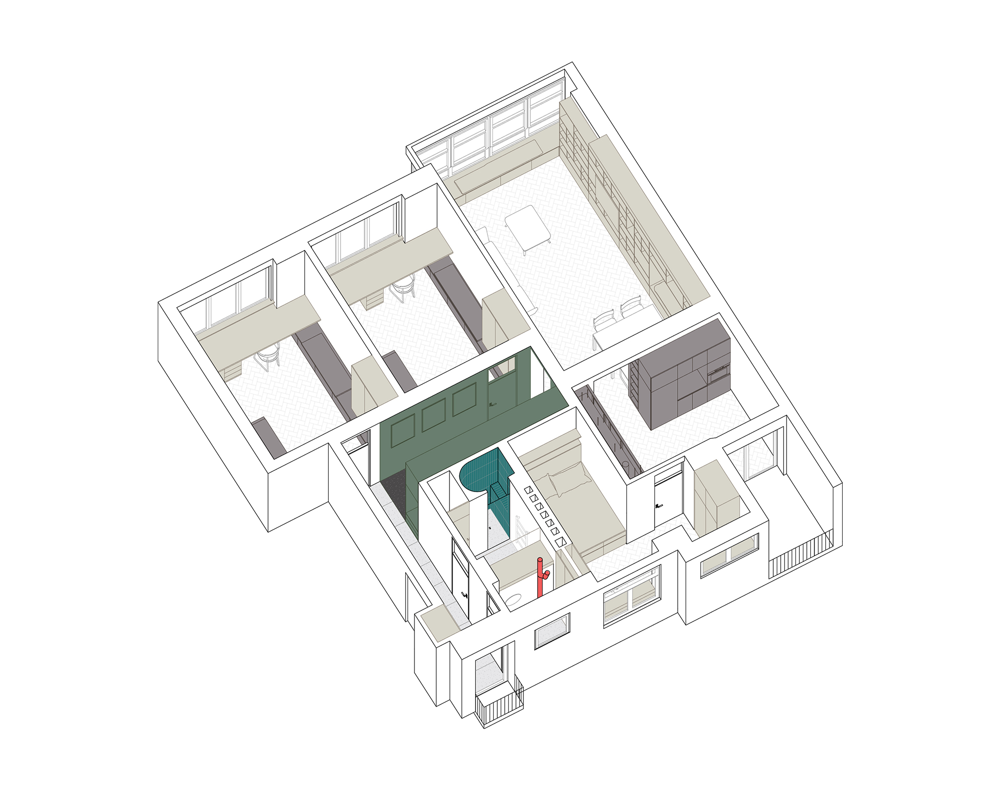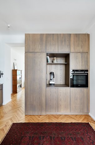 Dôležitou témou rekonštrukcie bol nábytok, ktorý sme do nového priestoru vkladali - primárne jeho farba a materiálová rôznorodosť. Zastúpené sú tri materiály - bielená preglejka, ktorej je vzhľadom k pôvodnej parketovej podlahe najviac, tmavá dyha (v kuchyni dub a v detských izbách kvôli posteli orech) a laminátová zelená šatníková skriňa.