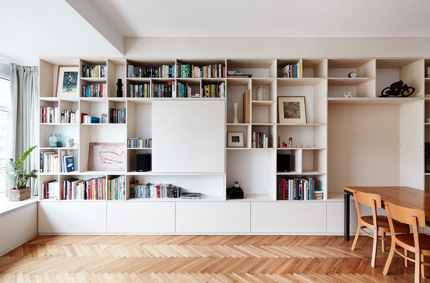 Kuchyňa je samostatná miestnosť, avšak prepojená stavebným otvorom s obytnou časťou, kde je umiestnený jedálenský stôl. Ten má časť sedenia v nike, ktorá je súčasťou veľkej knižnice. Za posuvnými dvierkami je ukrytá televízia.