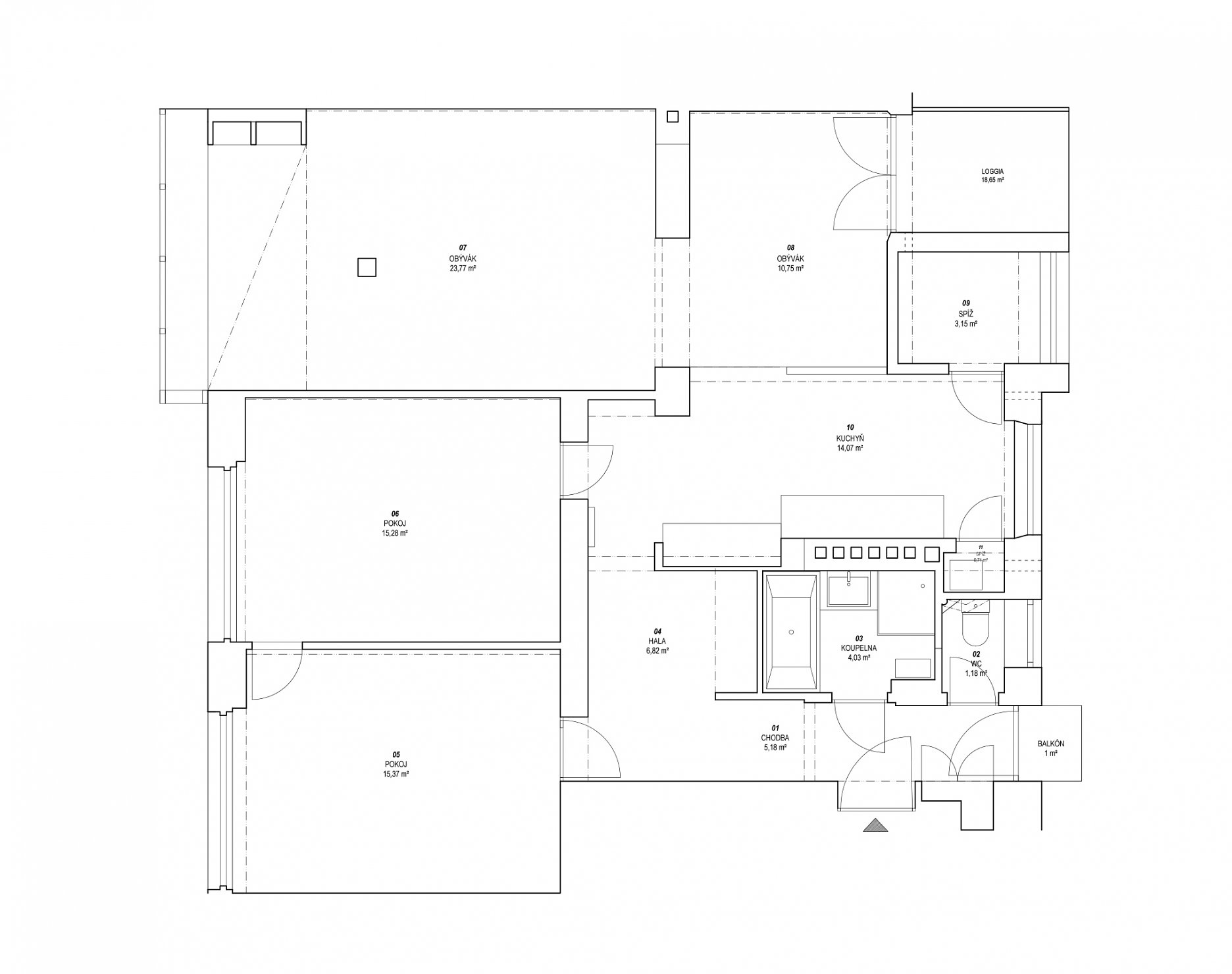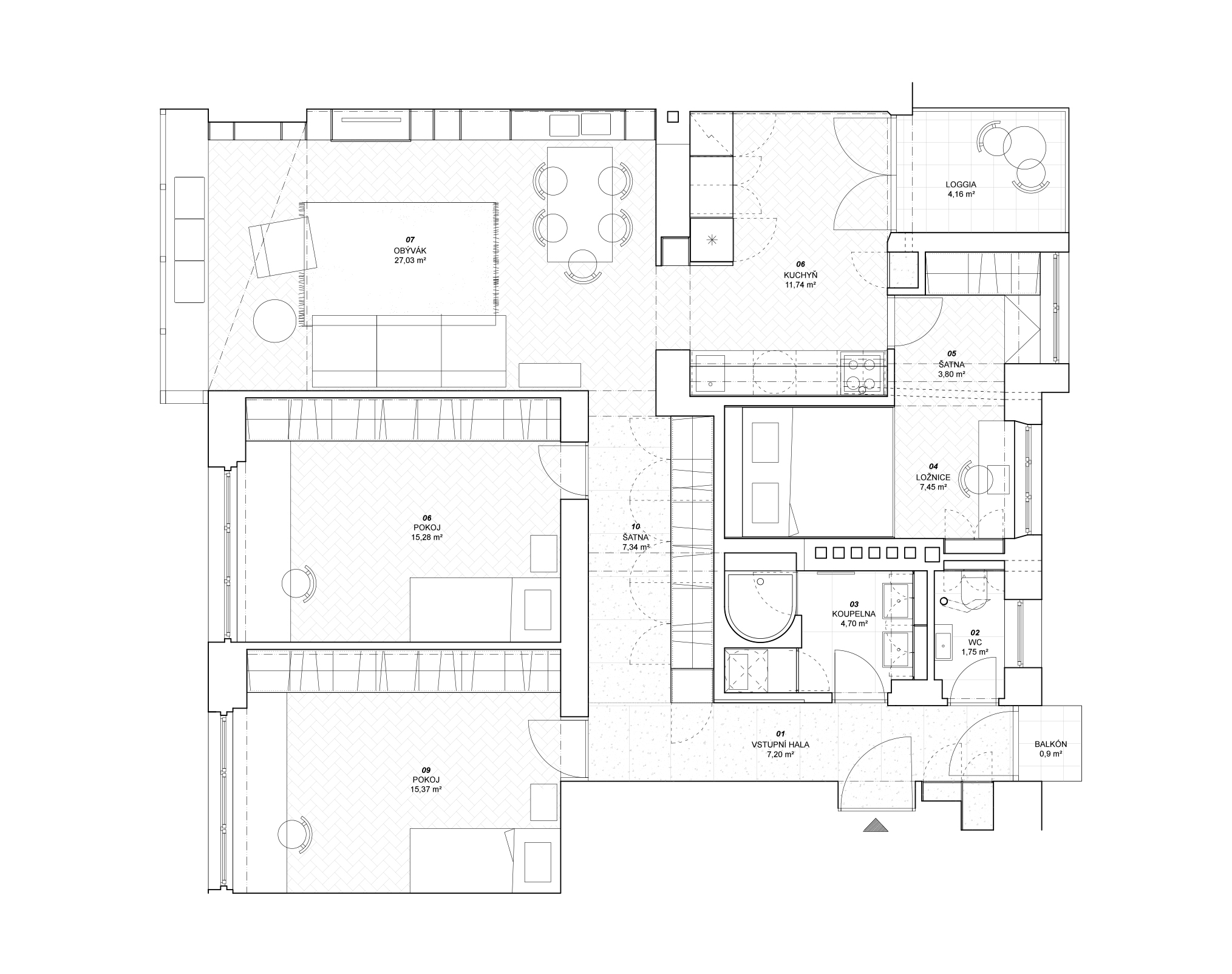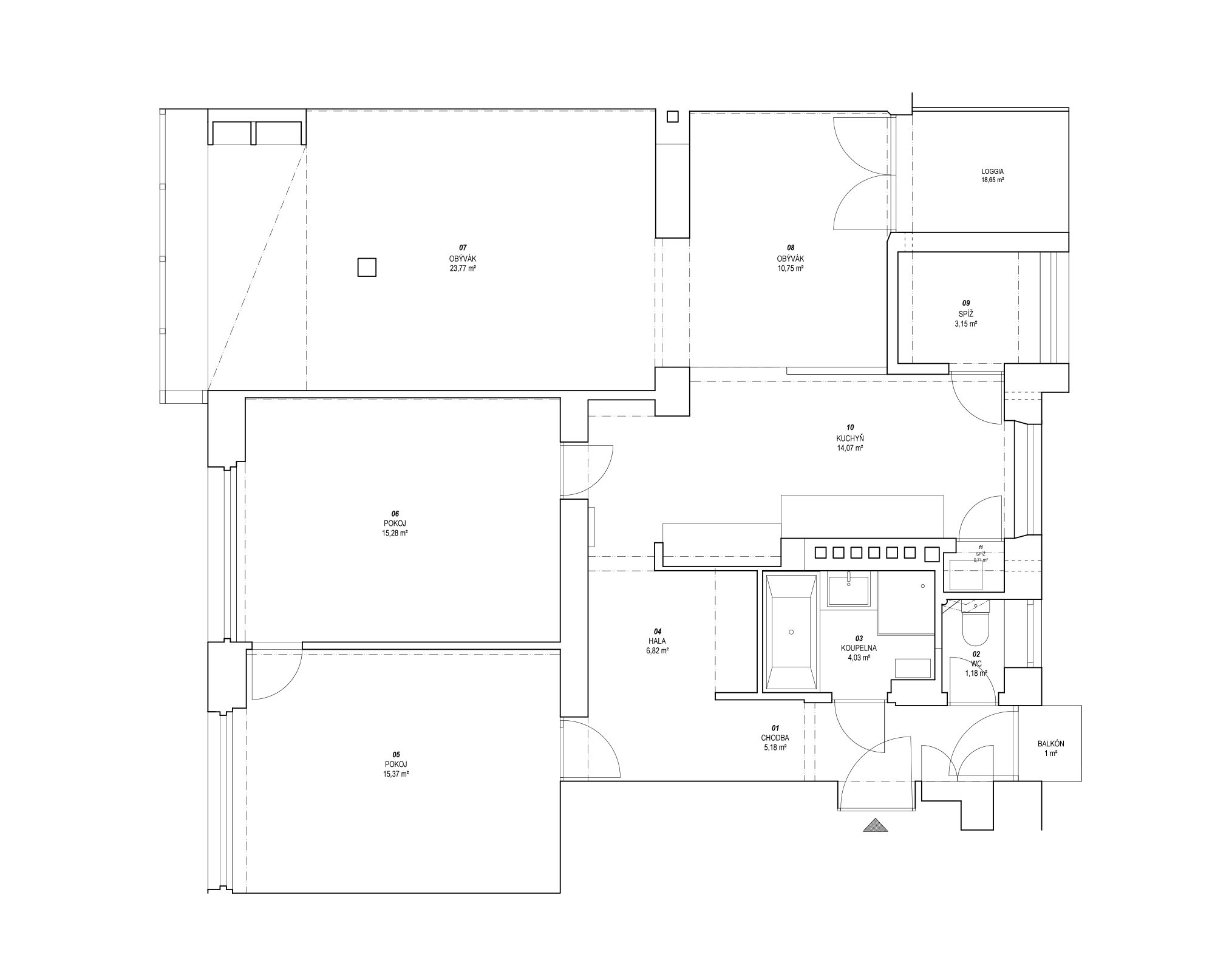 Hlavným zadaním rekonštrukcie bolo zvýšit všetky dvere a vymyslieť polohu spálne tak, aby zostali v rámci dispozície dve rovnako veľké detské izby. Po prvých schôdzach s klientmi bolo jasné, že zmena rozvrhnutia bytu bude väčšia než si na začiatku predstavovali. Klienti po niekoľkých predložených variantoch dospeli k názoru, že oni sami nepotrebujú štandardnú spálňu a postačí im nika na spanie a priestor so šatníkovou skriňou.