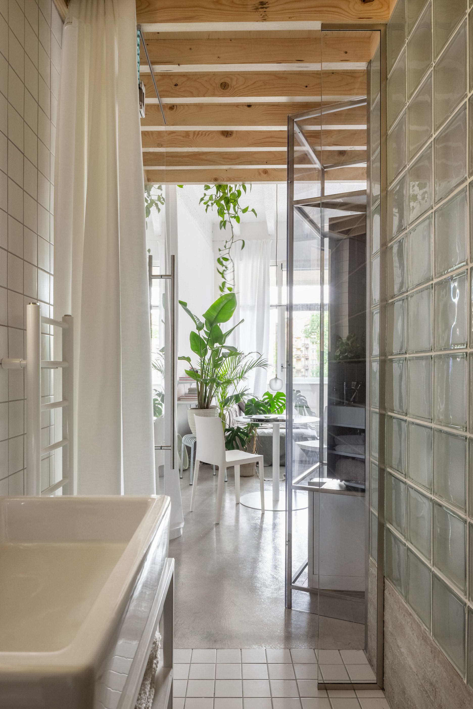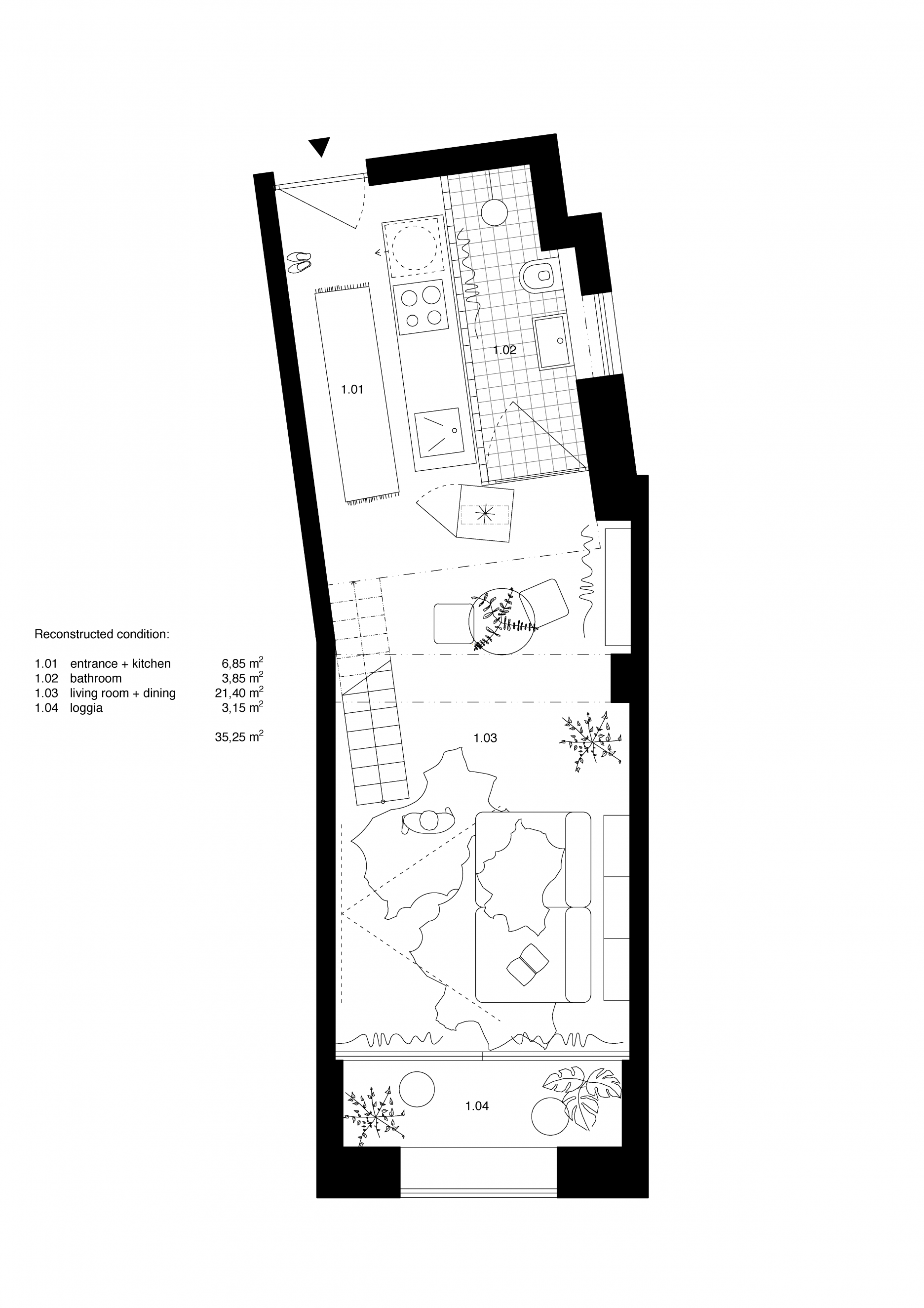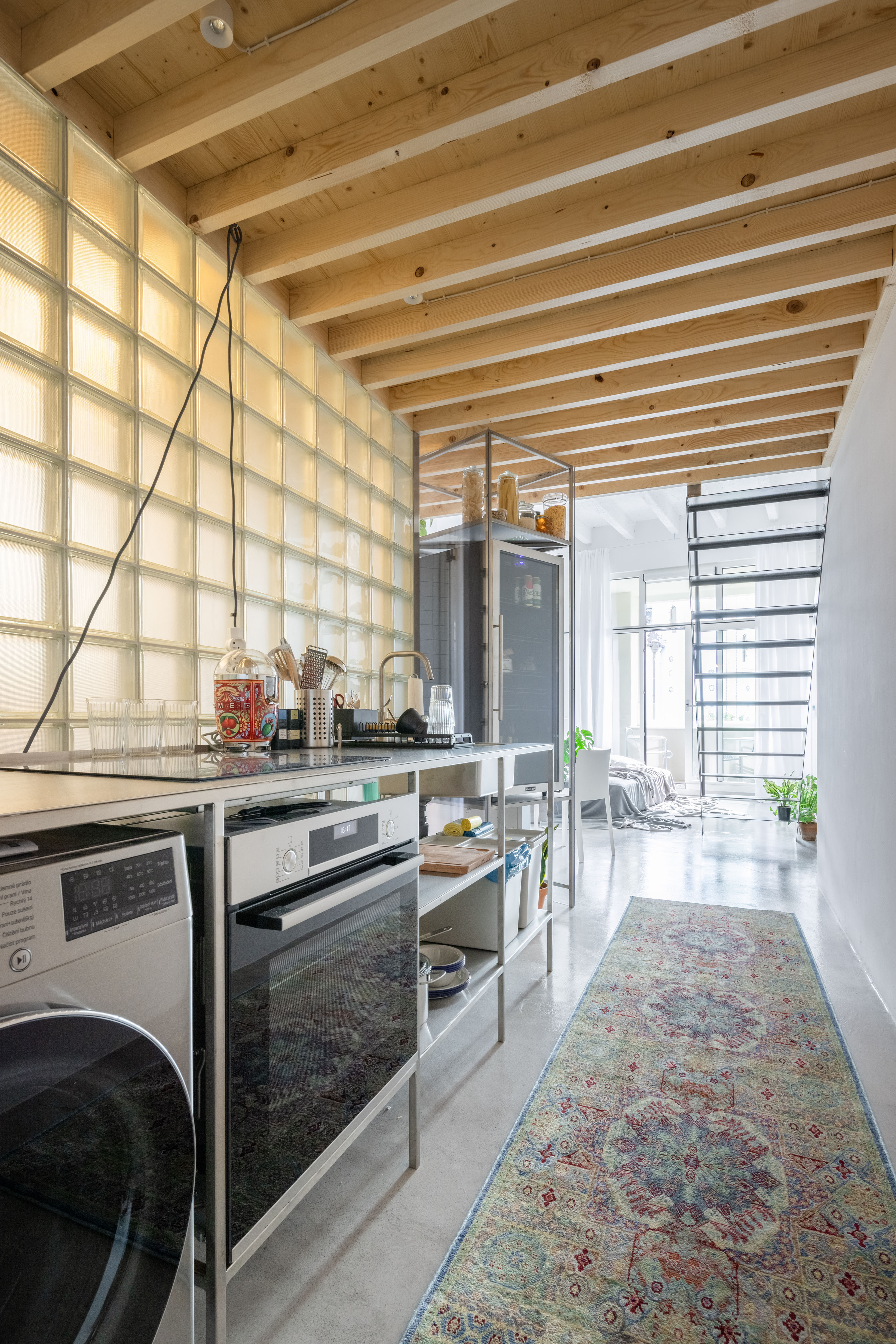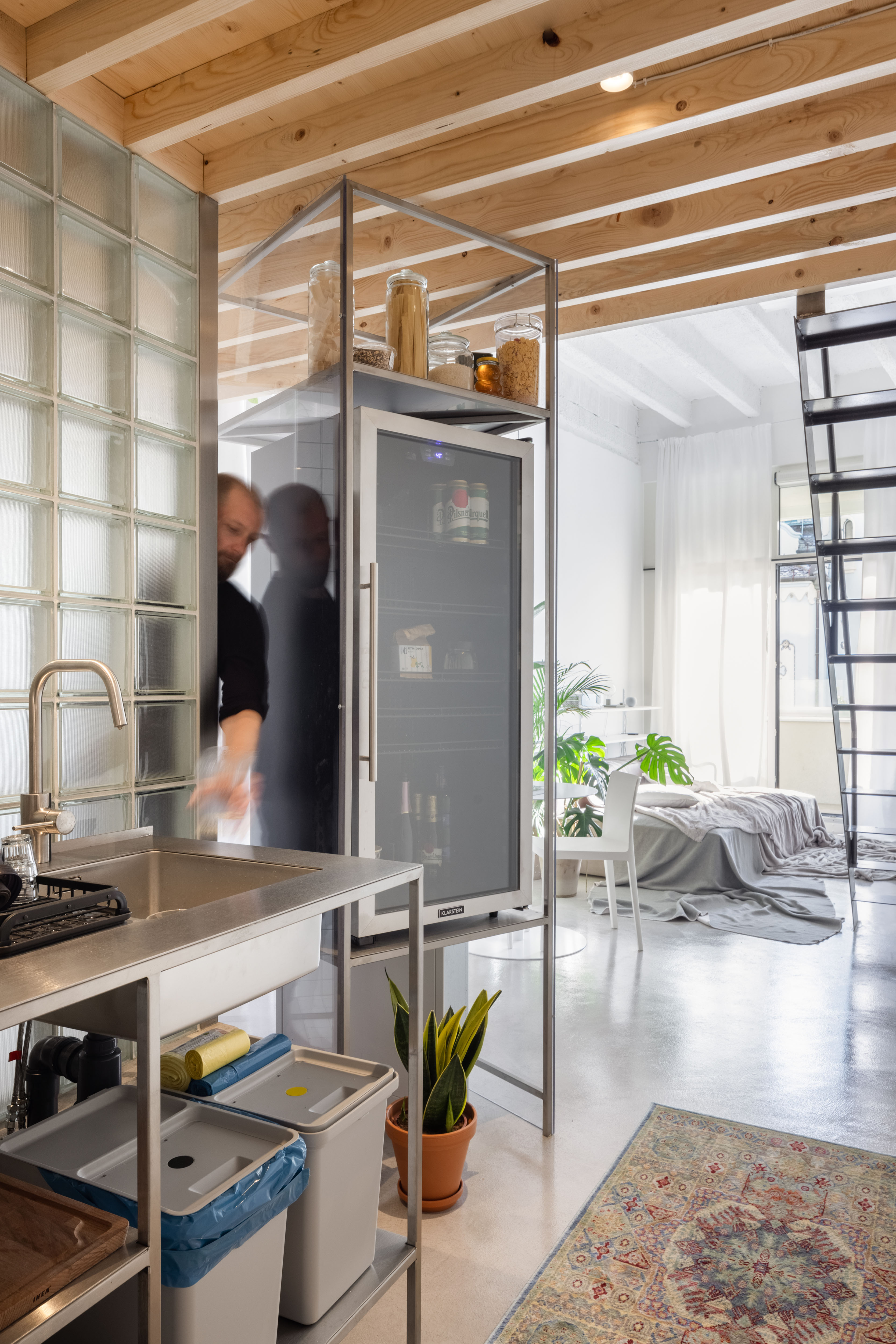 Priečka z priesvitných sklenených tvárnic medzi kúpeľňou a novou kuchyňou presvetľuje a opticky zväčšuje pôvodne tmavý kút bytu bez denného svetla. Stena súčasne oddeľuje kúpeľňu na pôvodnom mieste. Fixné zariadenie bytu tvorí iba niekoľko najdôležitejších prvkov. Medzi netradičné riešenia patrí 1,2 metra široká "denná posteľ", ktorá nahrádza klasickú pohovku. Byt je zariadený iba tými najdôležitejšími objektmi s veľkými rozmermi. Biele steny, používané ako projekčné plátno, suplujú funkciu televízora.