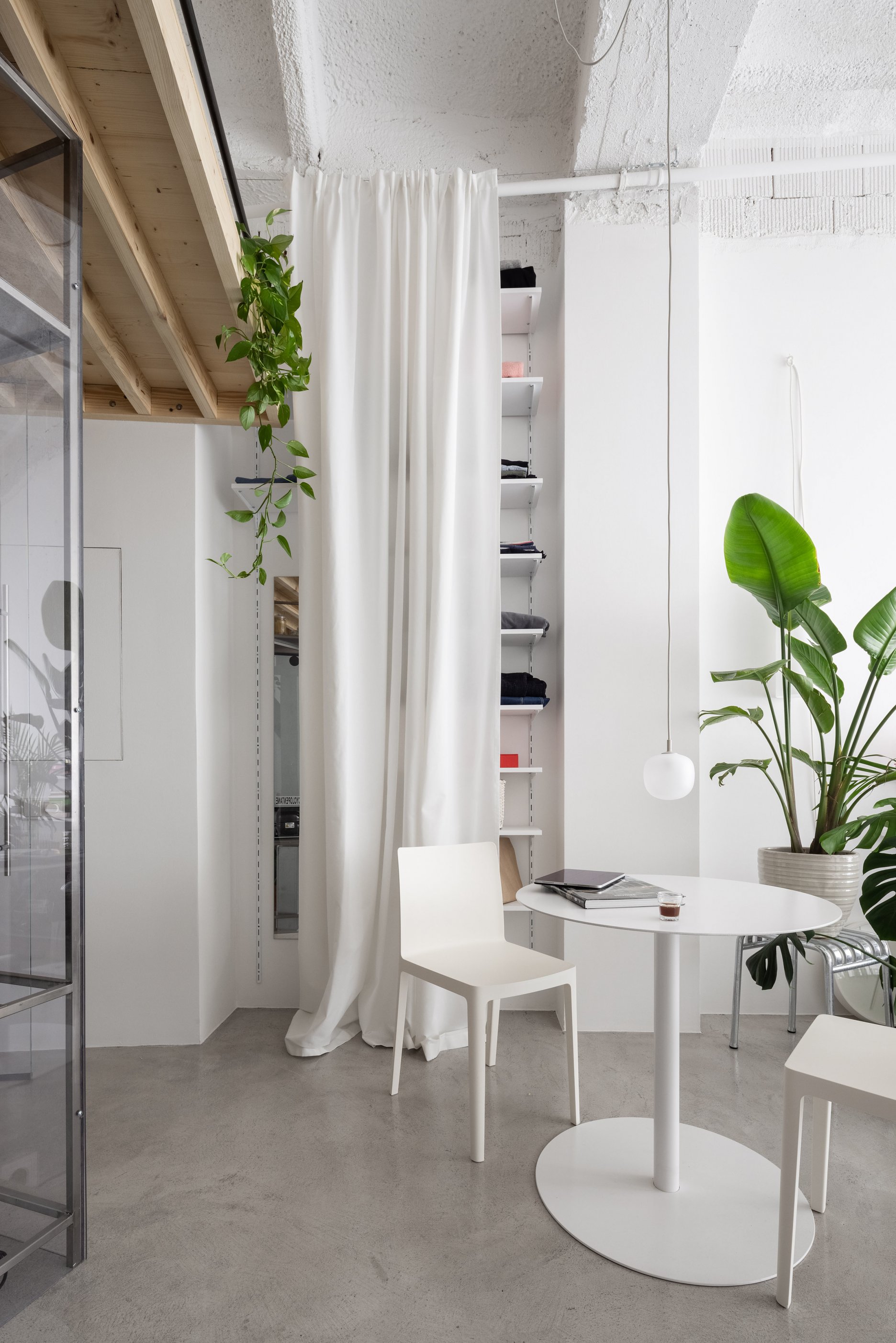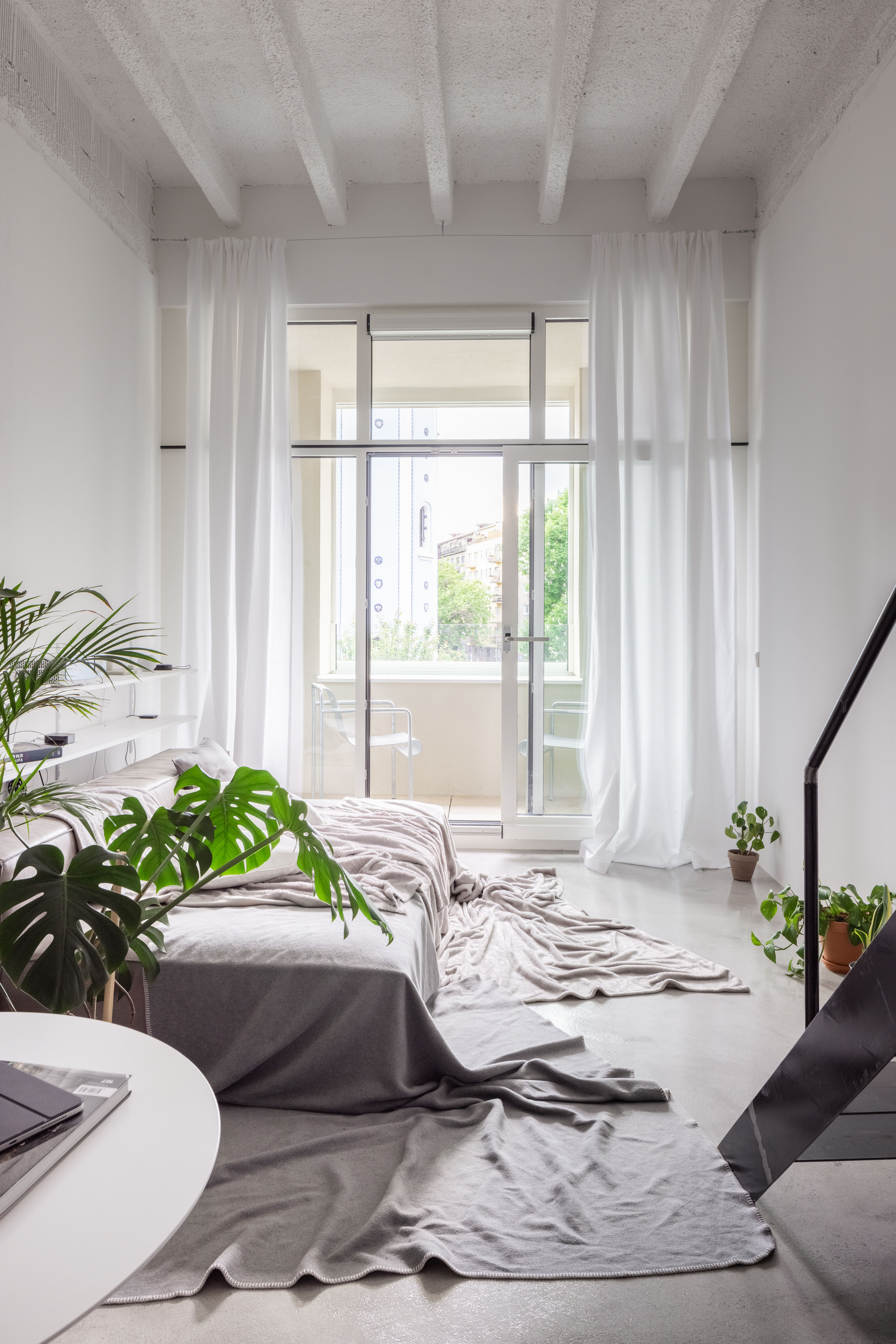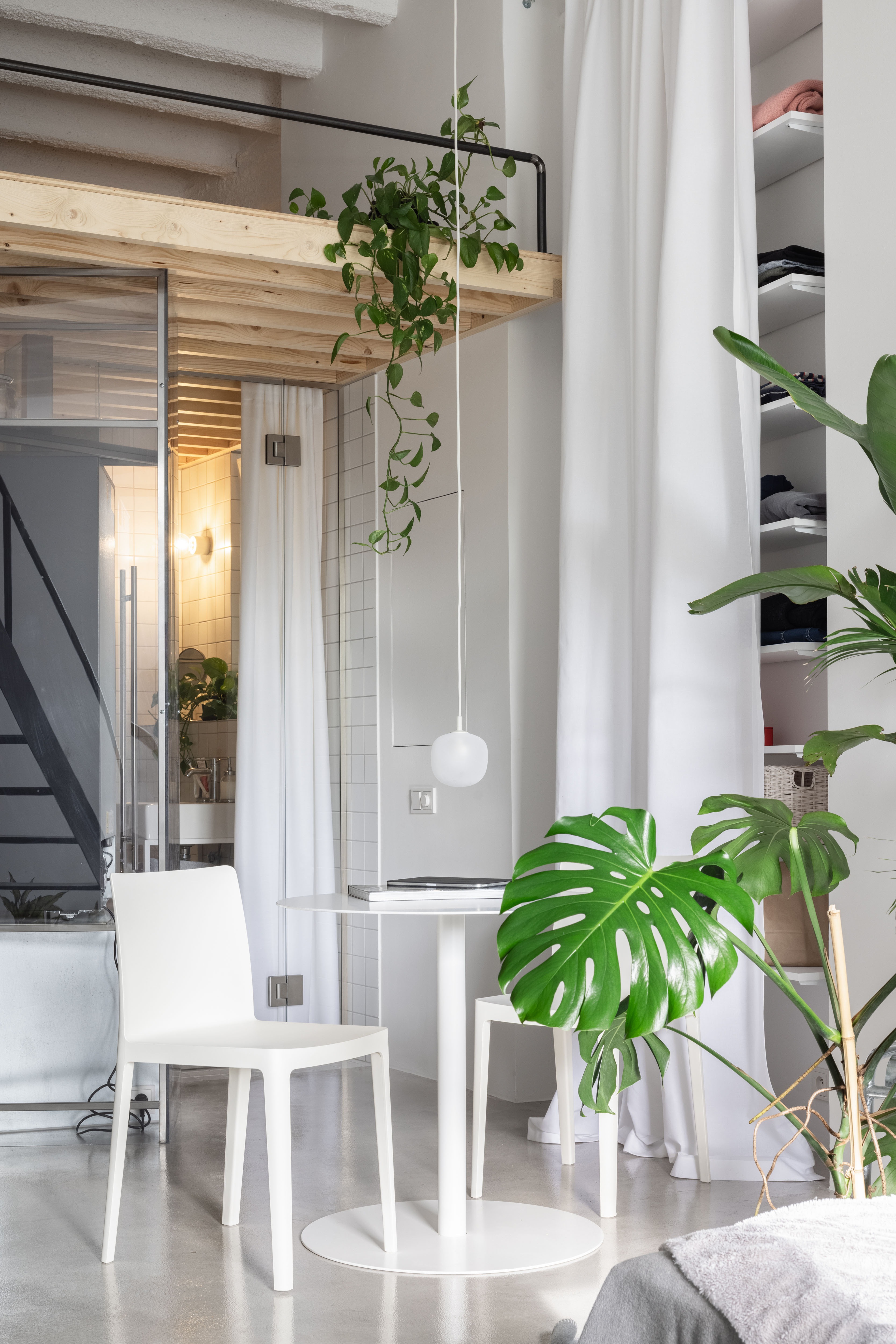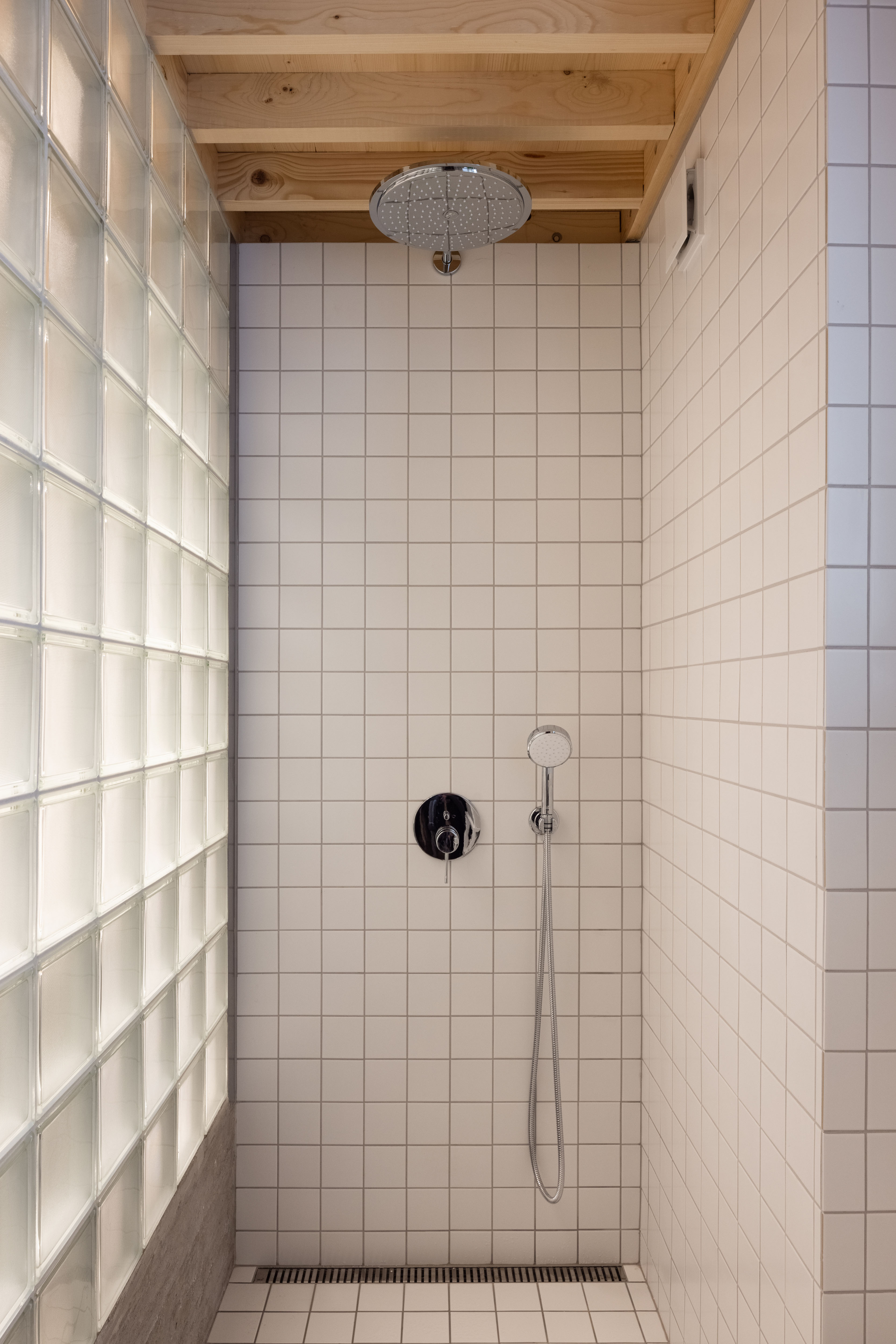 Priečka z priesvitných sklenených tvárnic medzi kúpeľňou a novou kuchyňou presvetľuje a opticky zväčšuje pôvodne tmavý kút bytu bez denného svetla. Stena súčasne oddeľuje kúpeľňu na pôvodnom mieste. Fixné zariadenie bytu tvorí iba niekoľko najdôležitejších prvkov. Medzi netradičné riešenia patrí 1,2 metra široká "denná posteľ", ktorá nahrádza klasickú pohovku. Byt je zariadený iba tými najdôležitejšími objektmi s veľkými rozmermi. Biele steny, používané ako projekčné plátno, suplujú funkciu televízora.