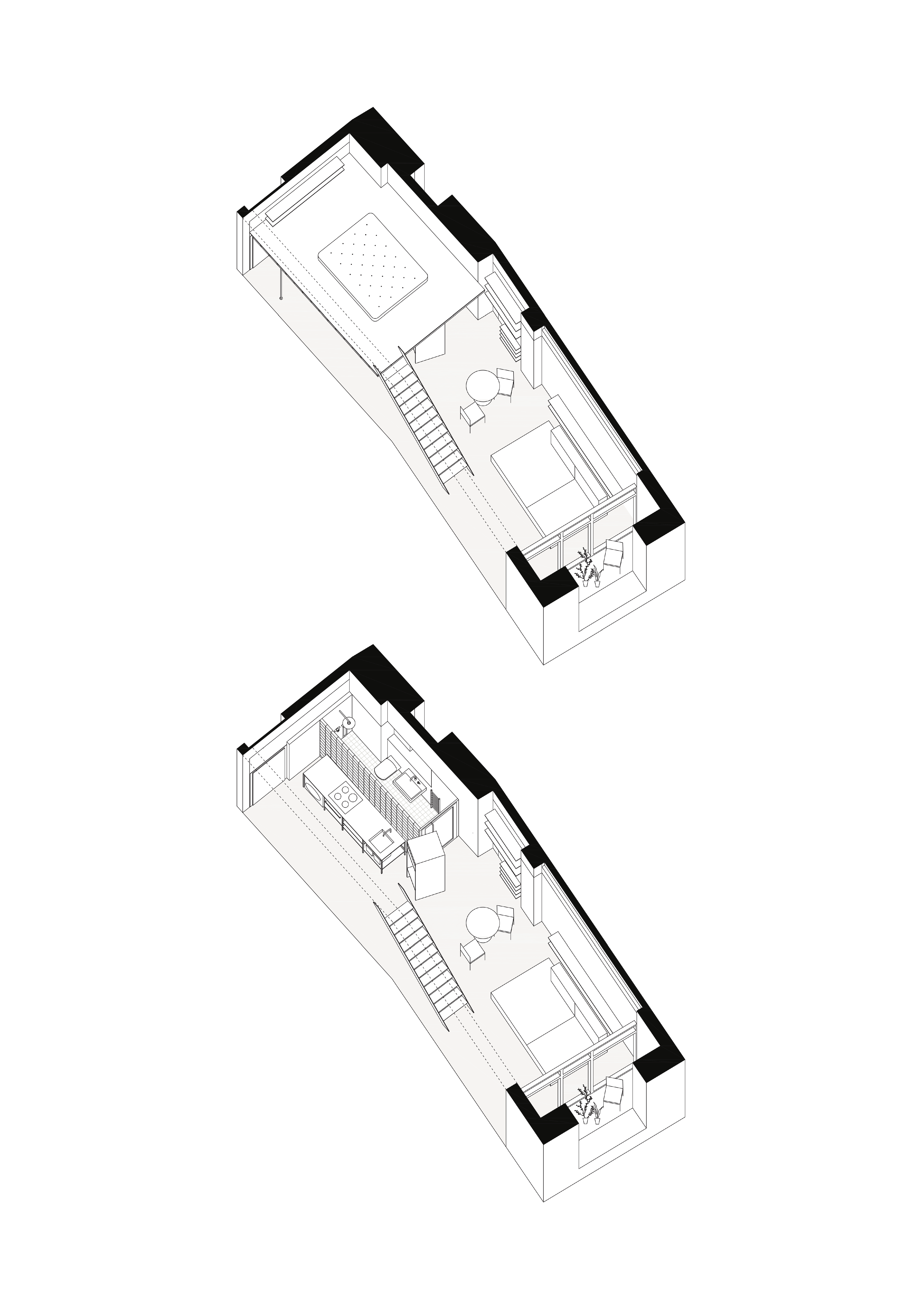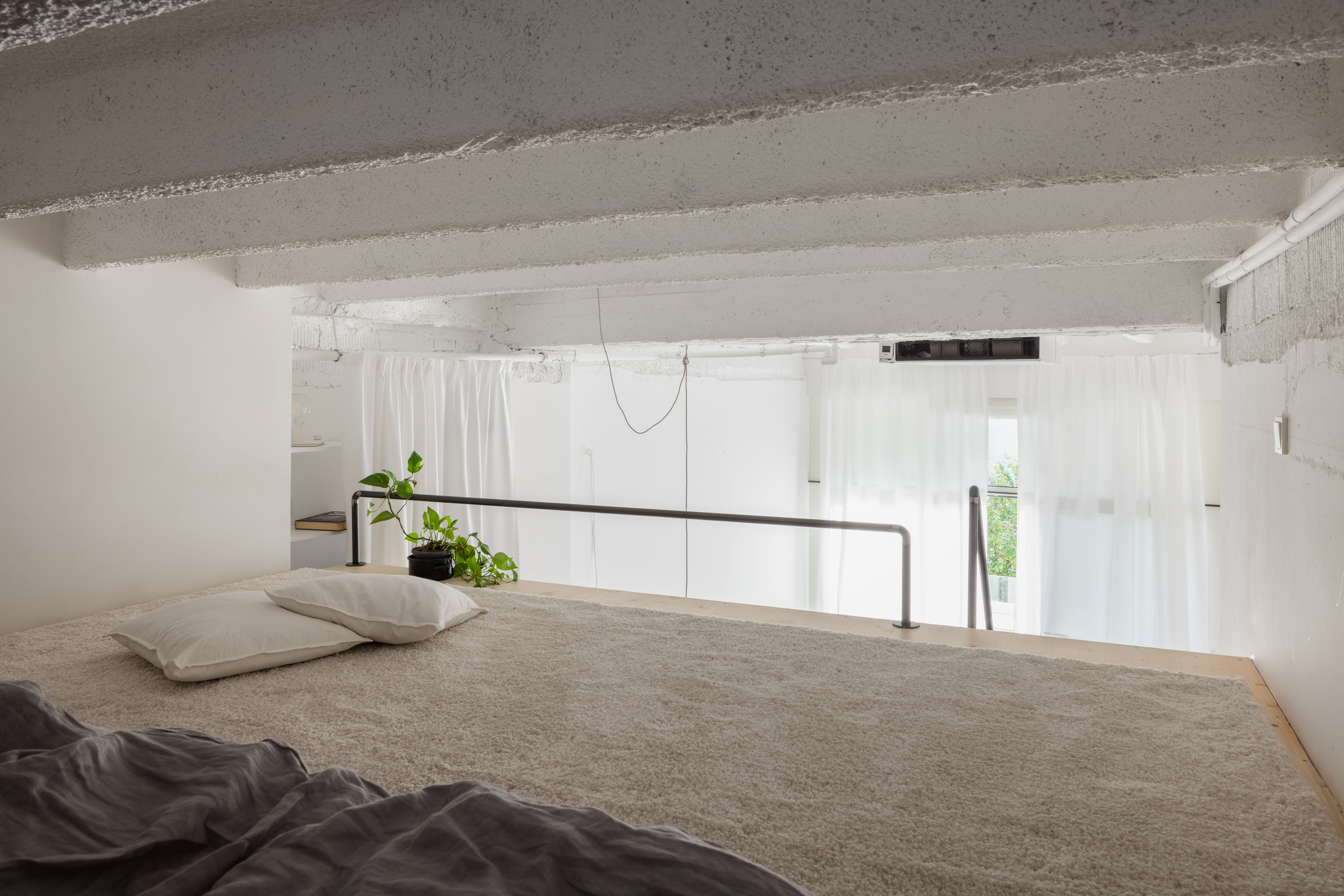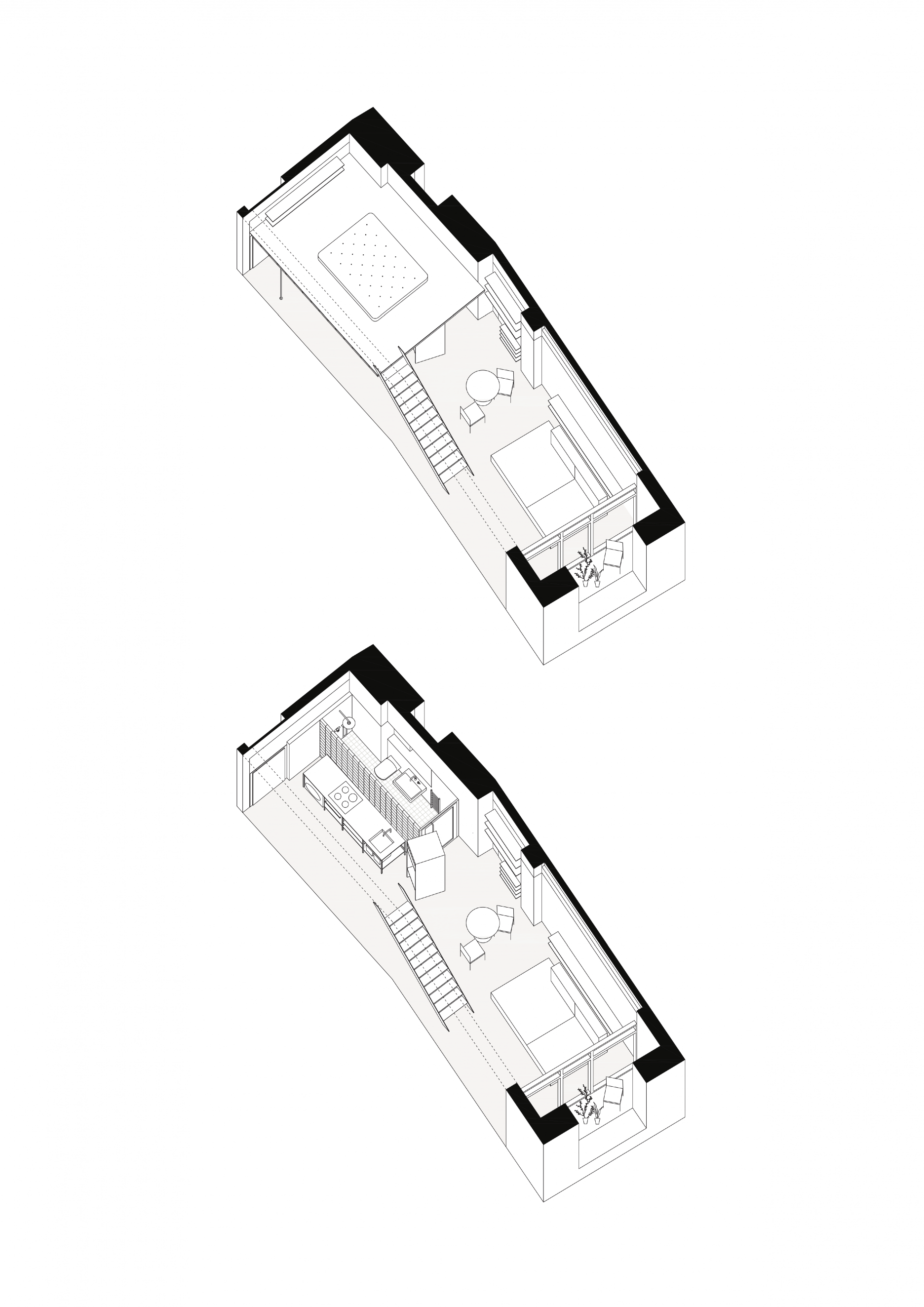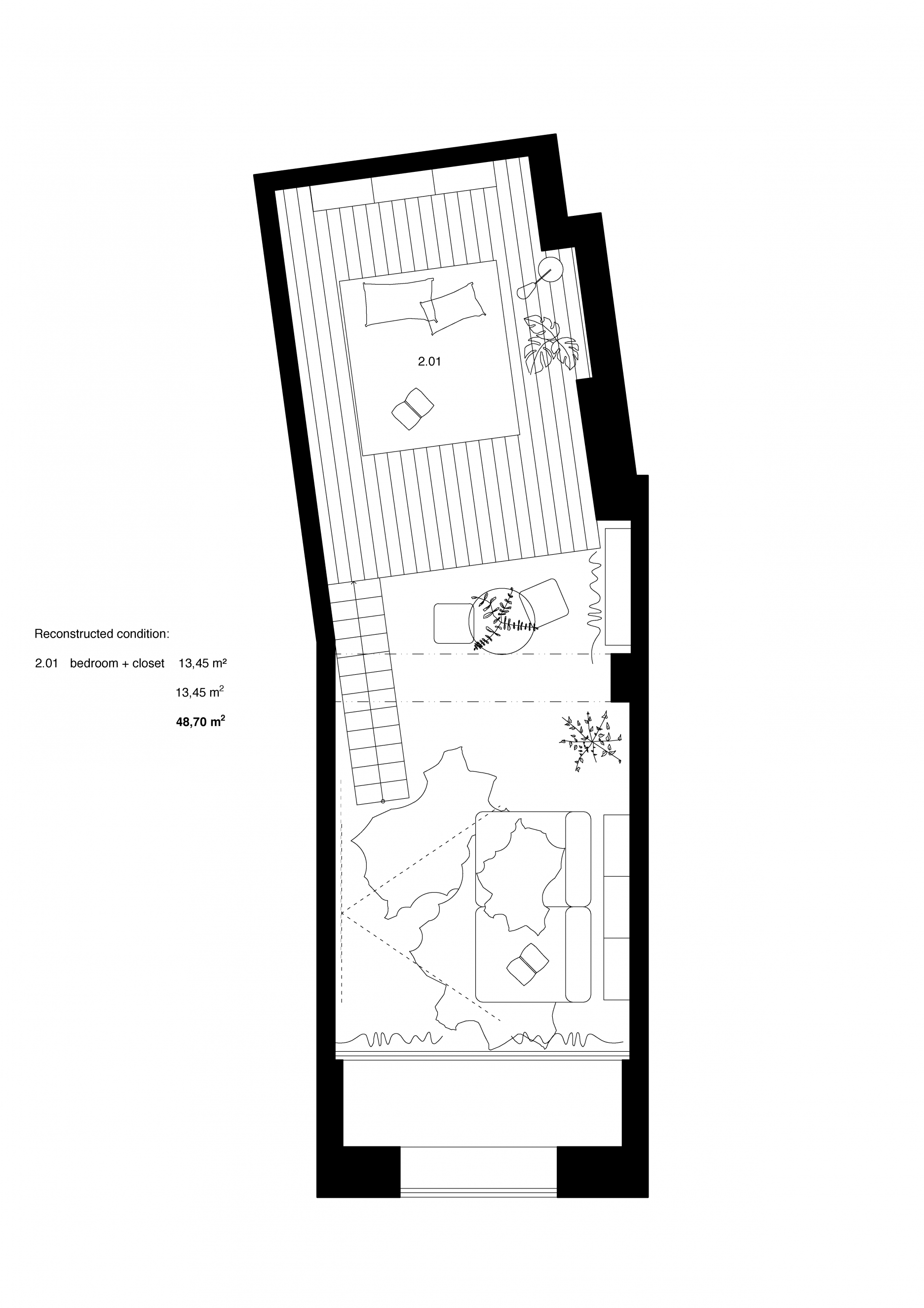 Odstránenie podhľadu a reorganizácia technickej infraštruktúry bytu umožnili “znovuobjavenie” proporcie priestoru. Vložené medziposchodie tvorí samostatnú nočnú zónu, prístupnú prostredníctvom subtílneho, no stále plnohodnotného schodiska.