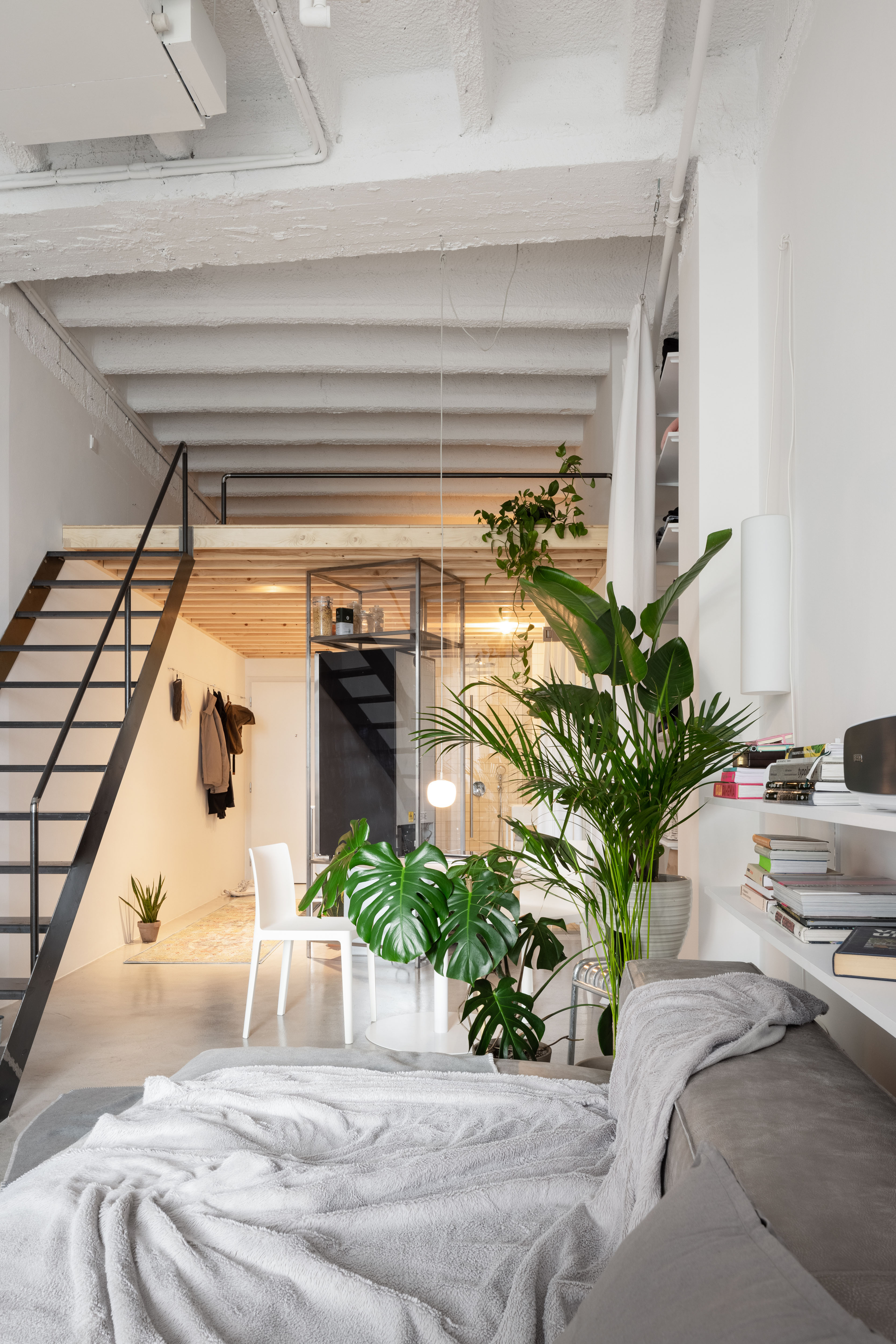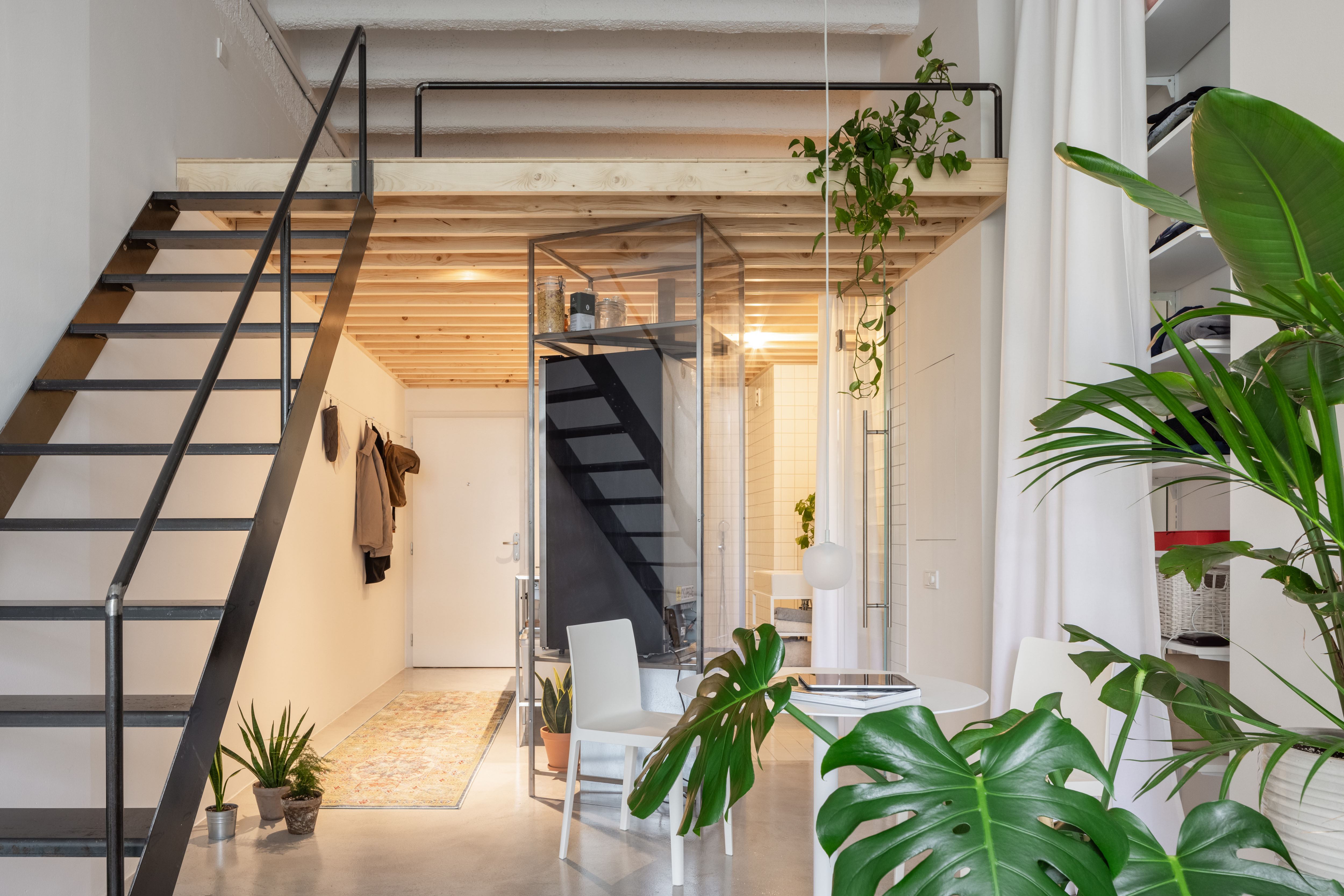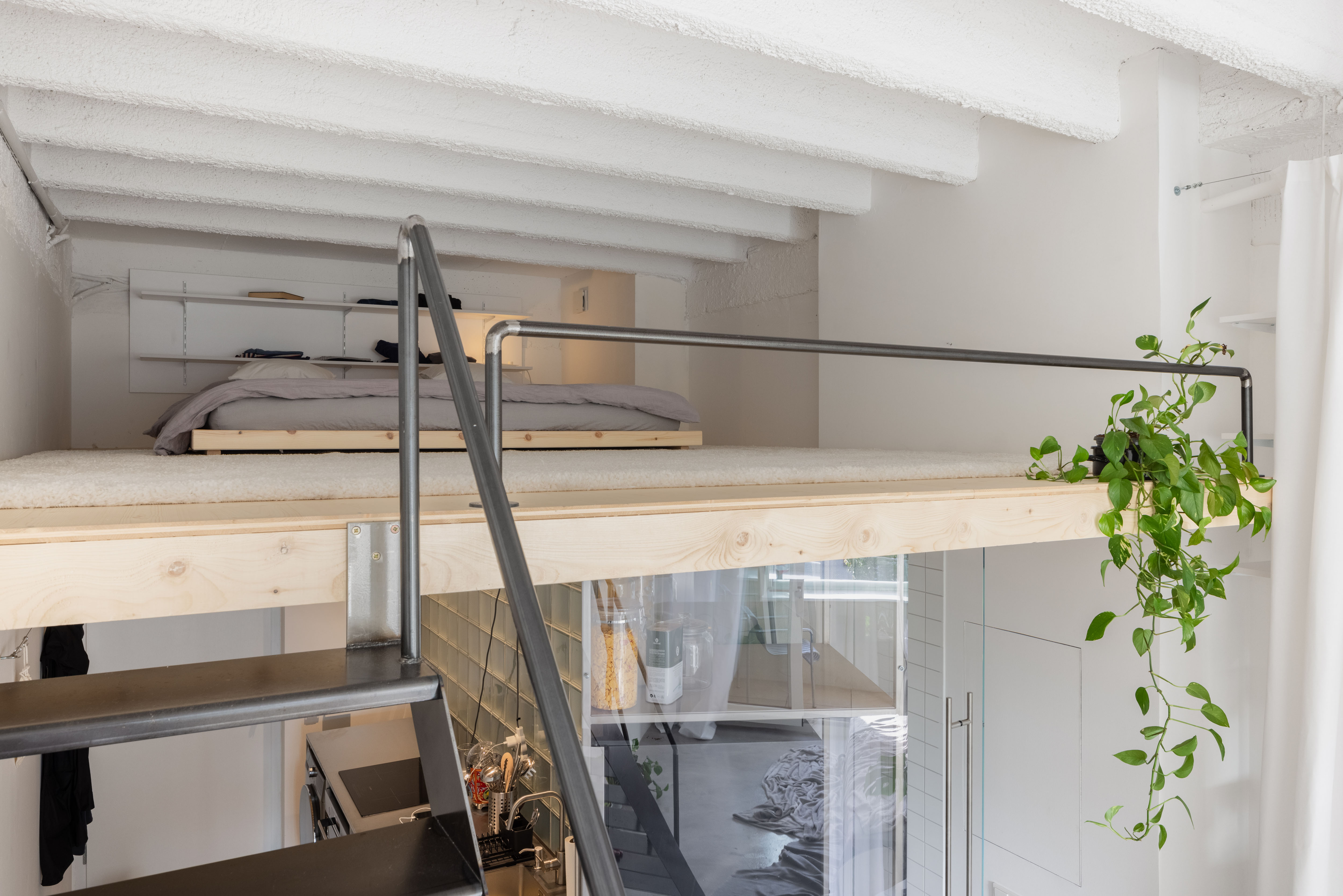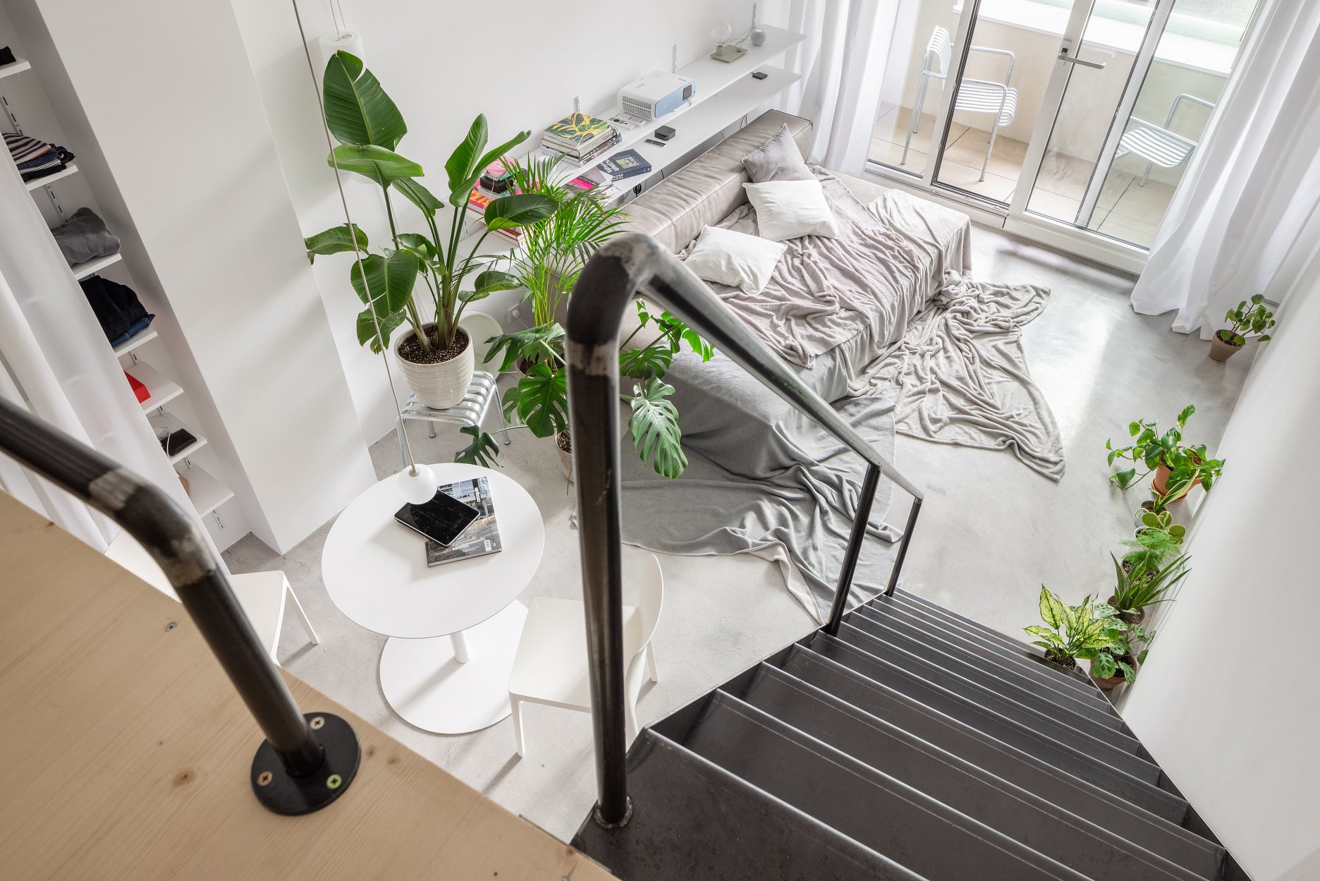 Odstránenie podhľadu a reorganizácia technickej infraštruktúry bytu umožnili “znovuobjavenie” proporcie priestoru. Vložené medziposchodie tvorí samostatnú nočnú zónu, prístupnú prostredníctvom subtílneho, no stále plnohodnotného schodiska.