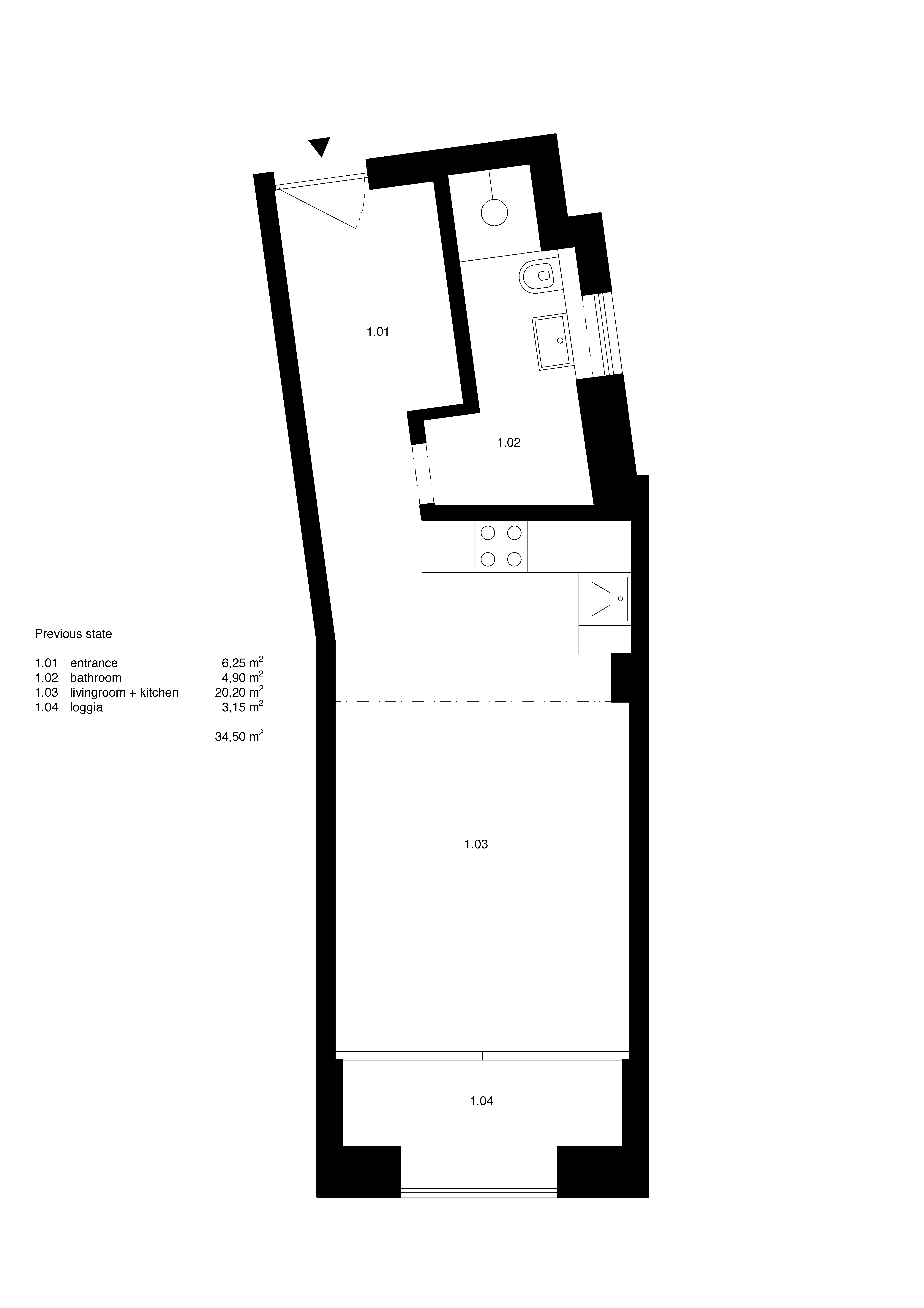 Štandardné usporiadanie pôvodného bytu zahŕňalo samostatnú kúpeľňu, znížený sadrokartónový strop so skrytými rozvodmi a kuchyňu opretú o stenu a otočenú chrbtom k vyhliadke na Modrý kostolík.