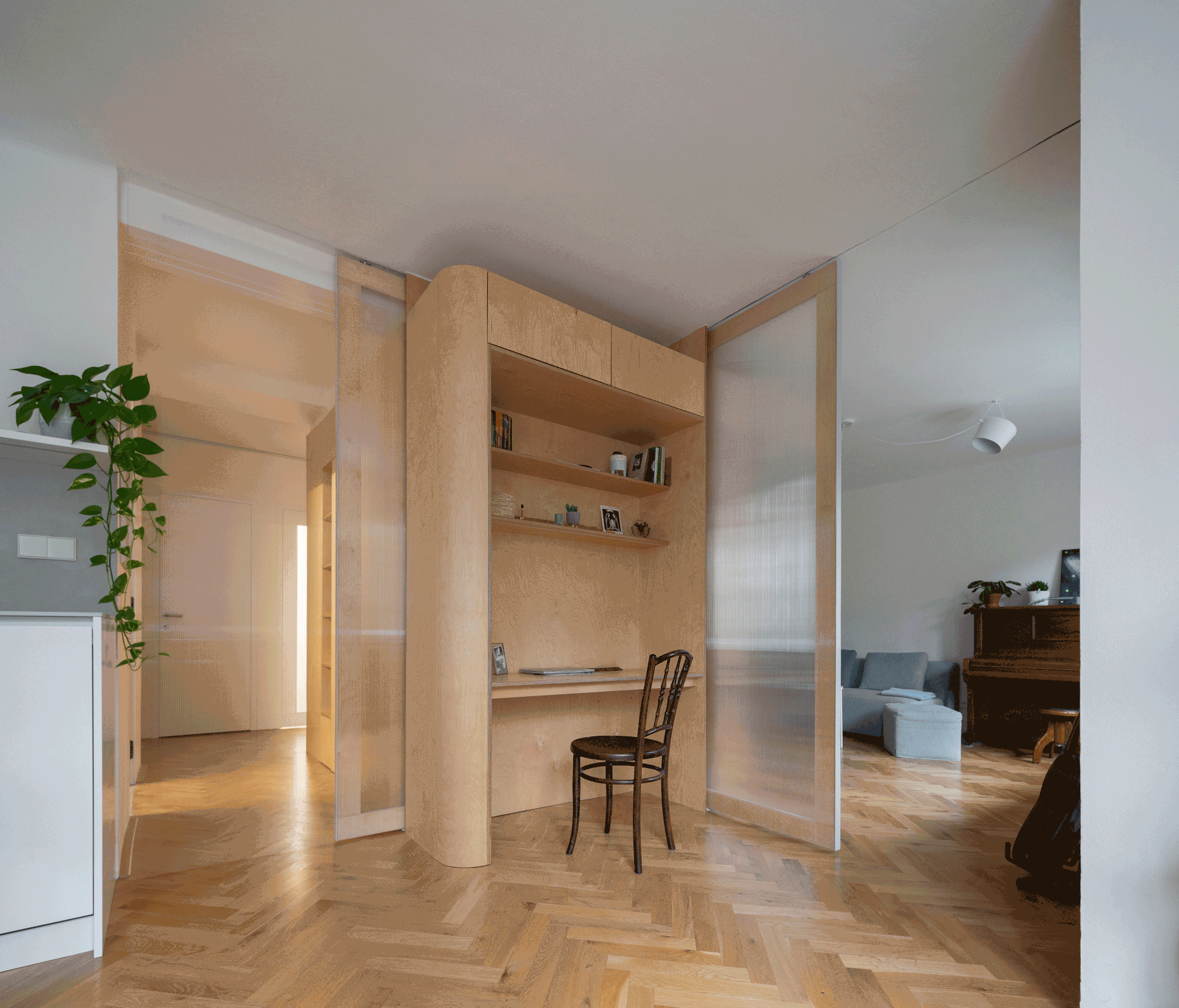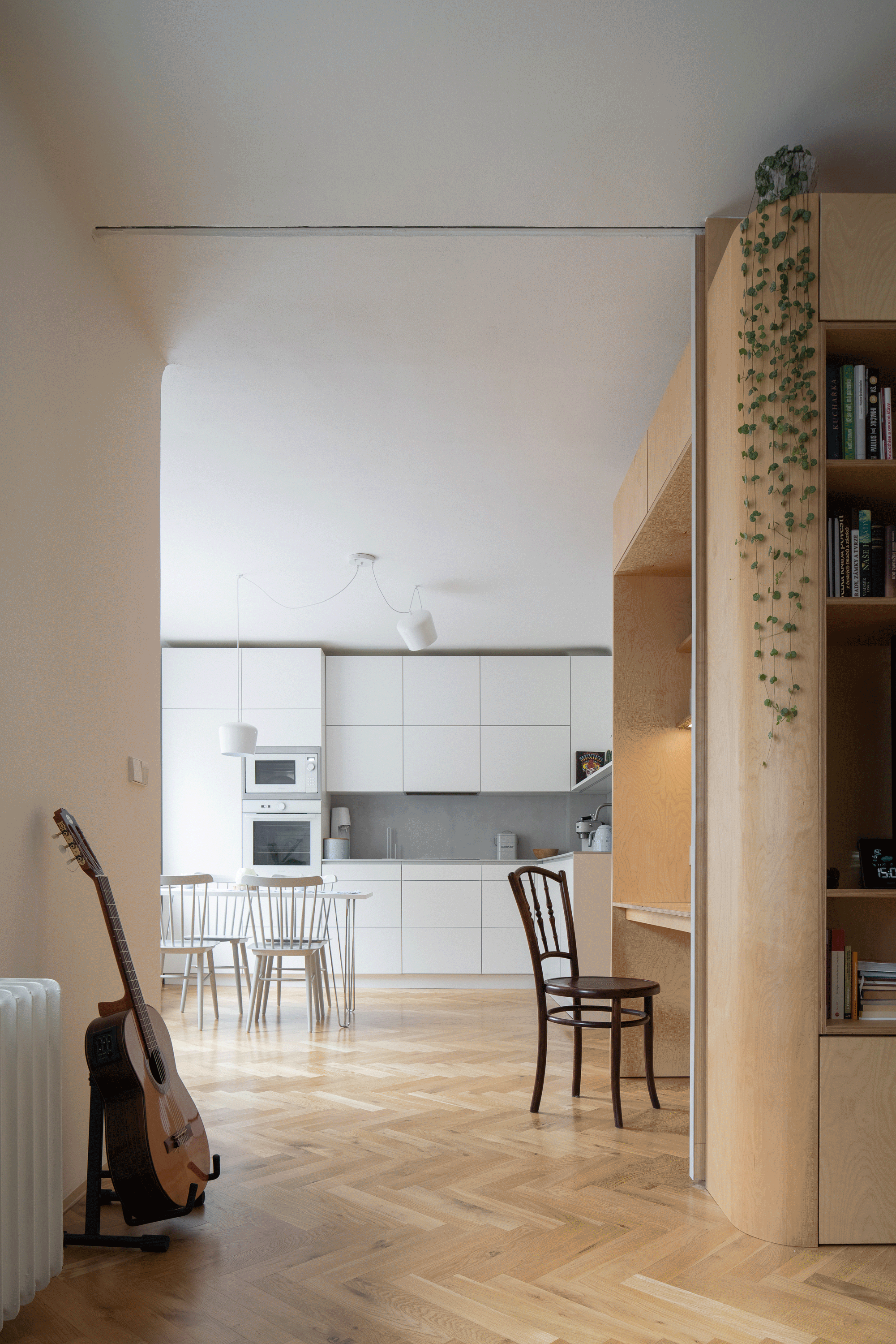 Nábytkové jadro z brezovej preglejky je materiálovo odlíšené od ostatného monochromatického vstavaného nábytku V byte boli položené nové parkety. Do kúpeľne, na WC a do technickej miestnosti zvolili architekti podlahovú stierku.