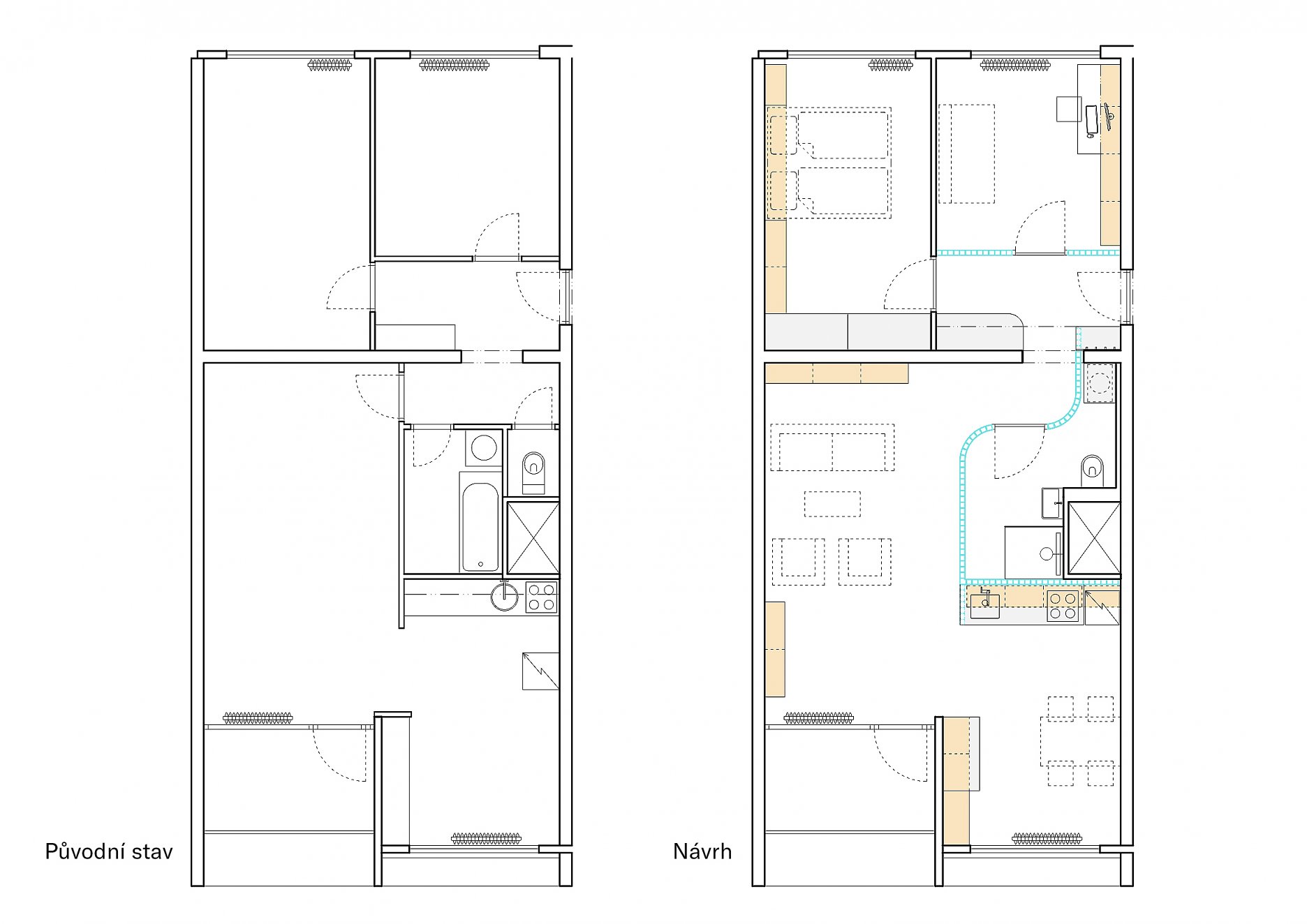 Již během koupě bytu na námi oblíbeném sídliště Ďáblice jsme věděli, že chceme oslovit nějaké architektonické studio. Na doporučení známých jsme kontaktovali tým architektů, který se možností rekonstrukce "panelákového bytu" zdál upřímně zaujatý. Prostor bytu jsme důvěrně znali, protože jsme v identické dispozici žili několik let v nájmu o pár ulic dál.