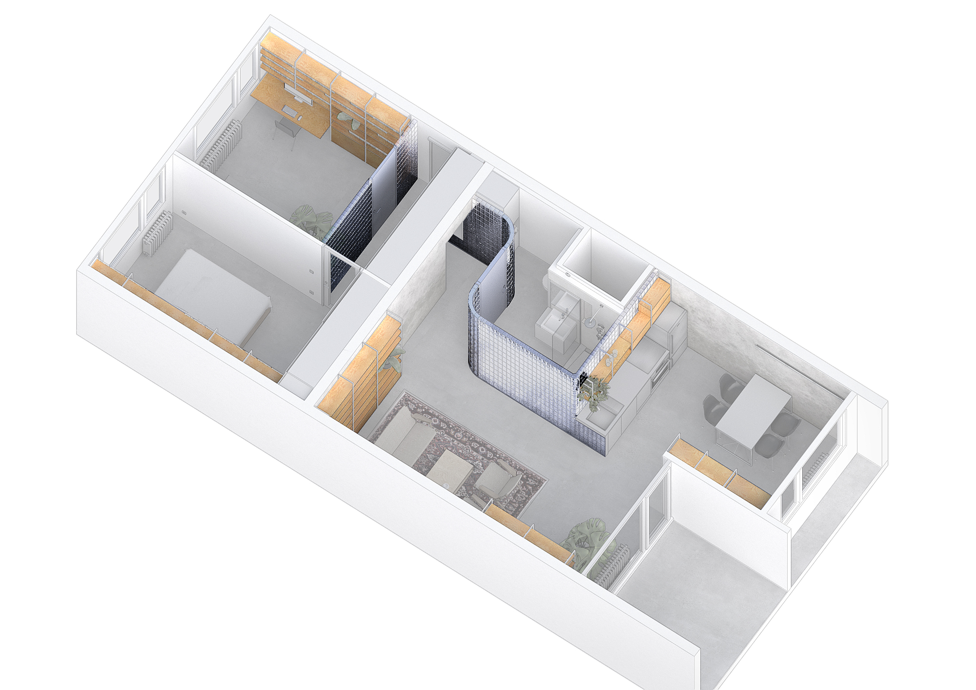 Pôvodné linoleum na celej ploche bytu nahradila neutrálna sivá podlahová stierka. Na niekoľkých stenách v obývacom priestore bola odhalená betónová konštrukcia, ktorá v interiéri zdôrazňuje charakter panelového domu, za ktorý sa jeho obyvatelia nehanbia, ale naopak, cenia si ho.